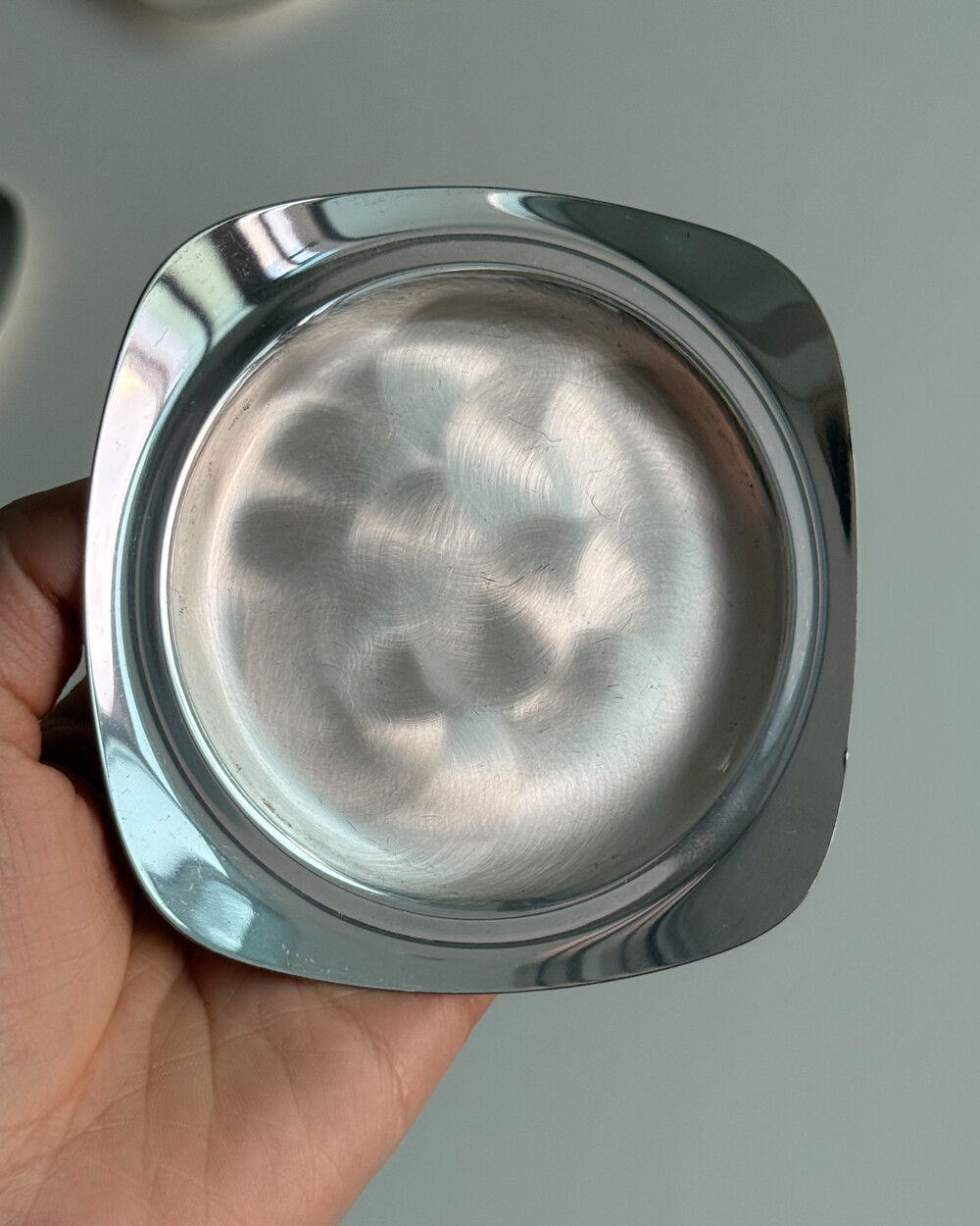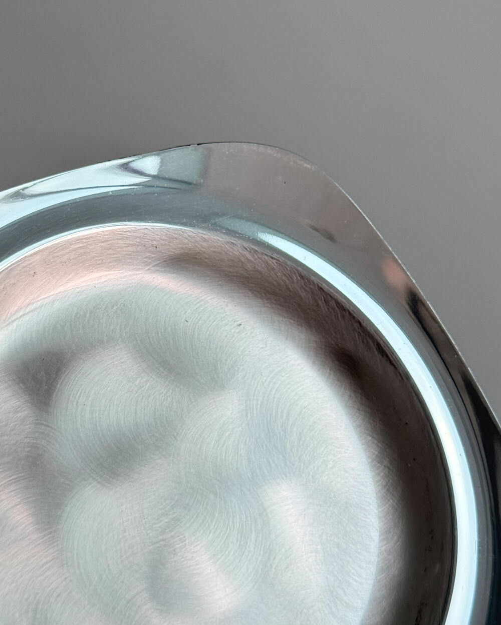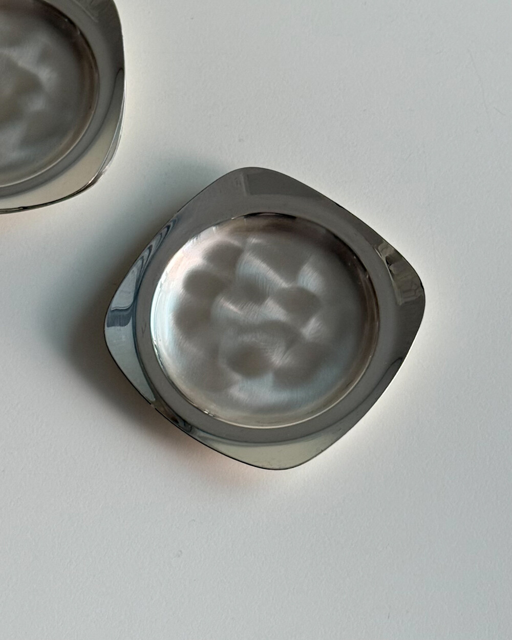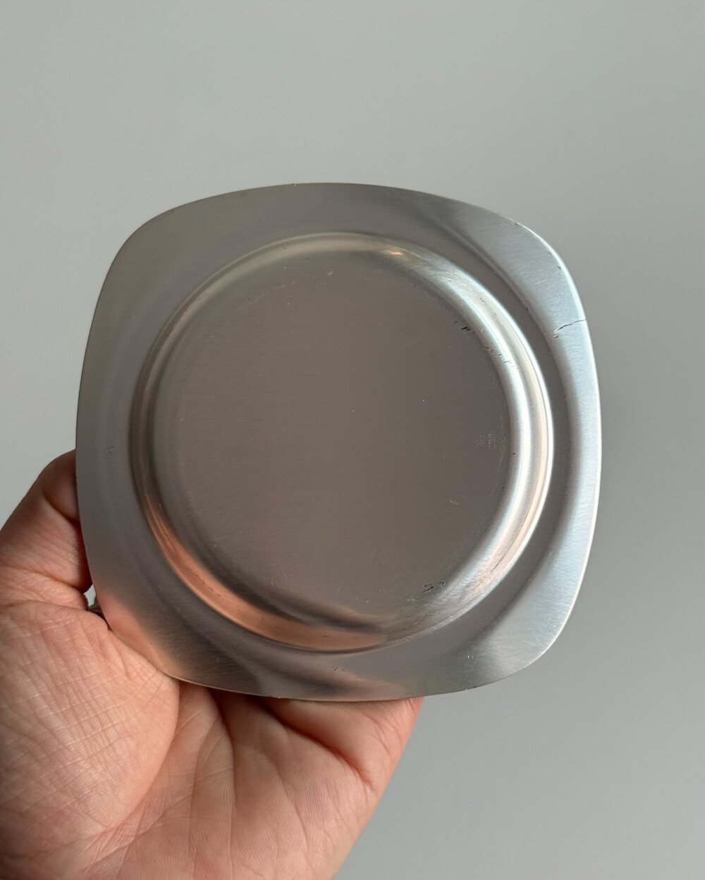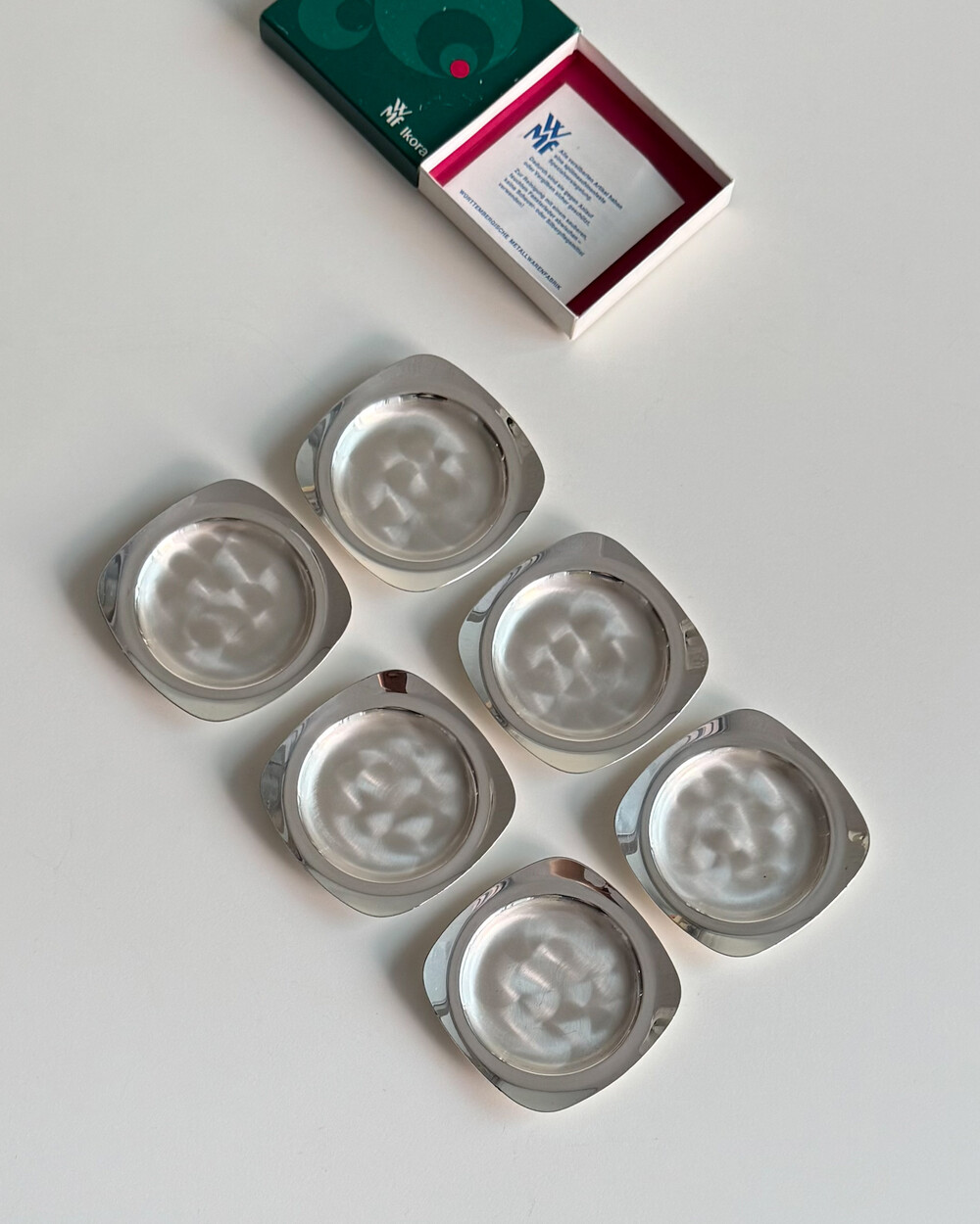 1970년도 WMF IKORA 라인의 코스터 세트 입니다. 중앙 부분의 독특한 질감 처리와 우아한 곡선미가 돋보이는 이 제품은 찻잔 받침, 액세서리 트레이, 또는 장식용 미니 접시 등 다양한 용도로 활용하기 좋습니다.
