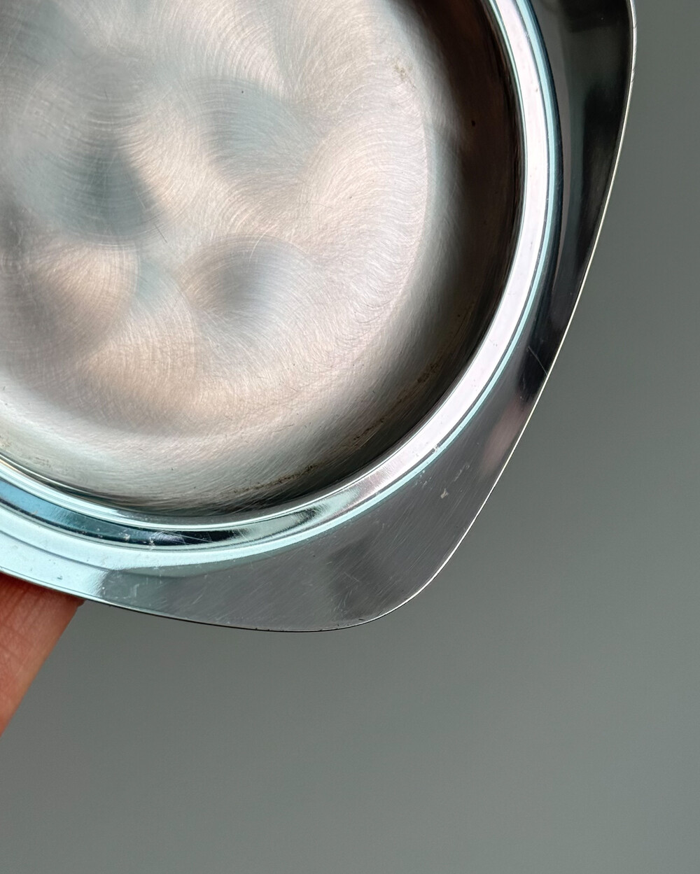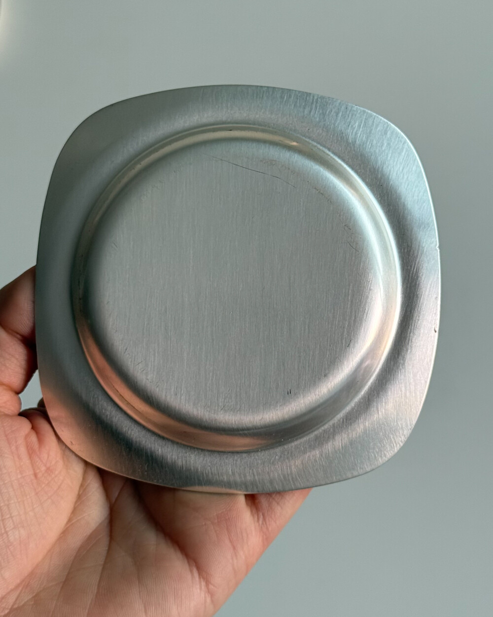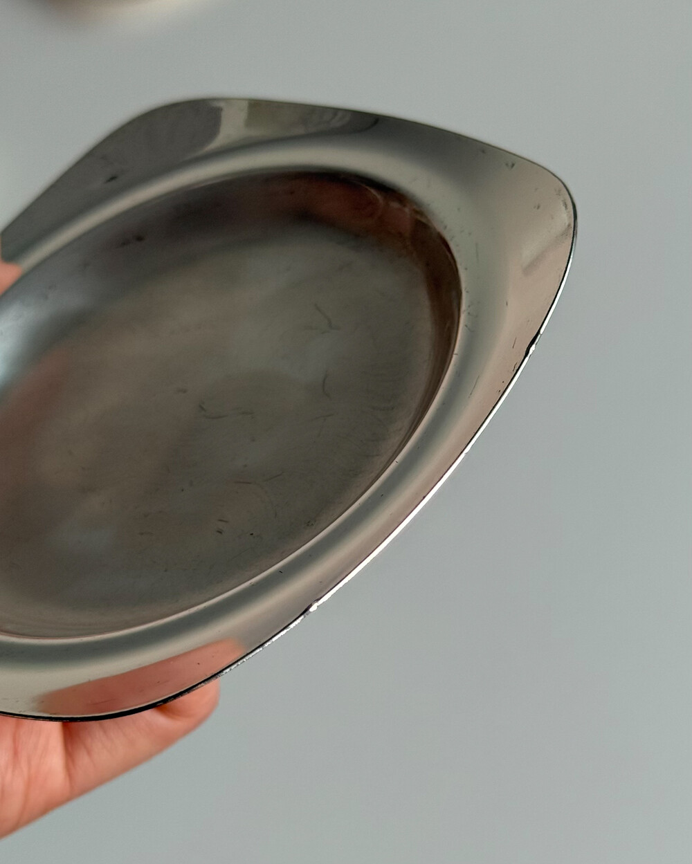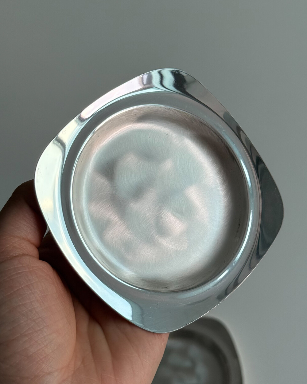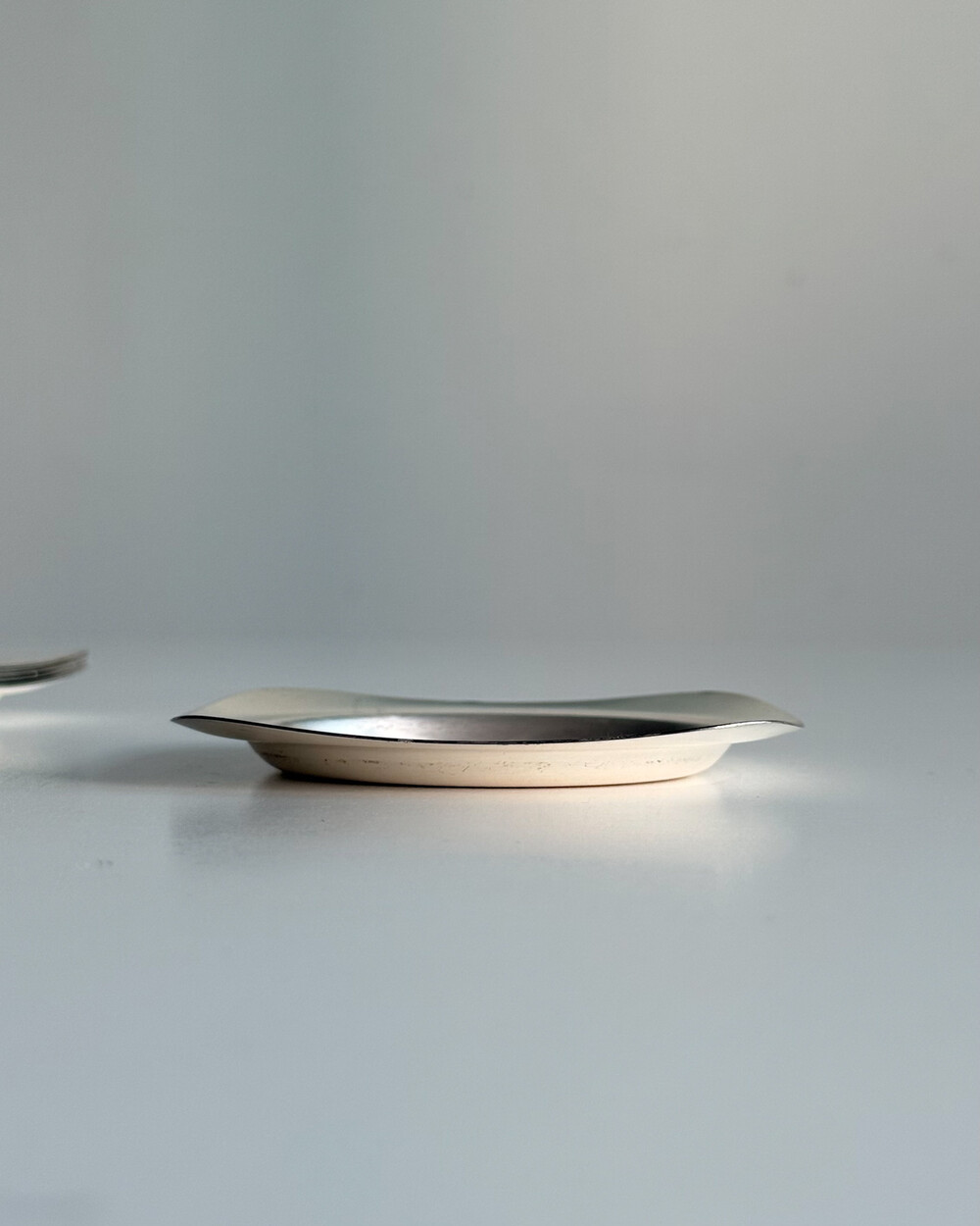 1970년도 WMF IKORA 라인의 코스터 세트 입니다. 중앙 부분의 독특한 질감 처리와 우아한 곡선미가 돋보이는 이 제품은 찻잔 받침, 액세서리 트레이, 또는 장식용 미니 접시 등 다양한 용도로 활용하기 좋습니다.