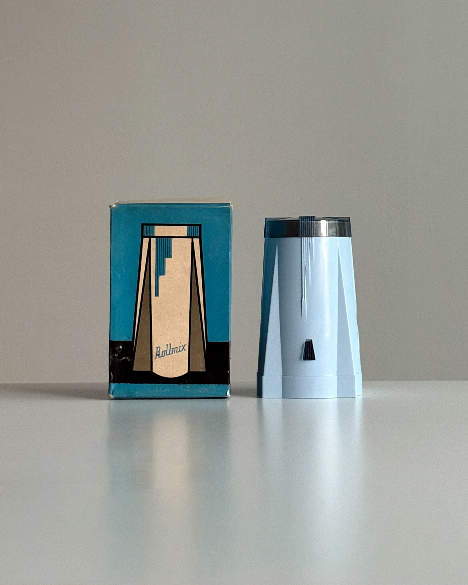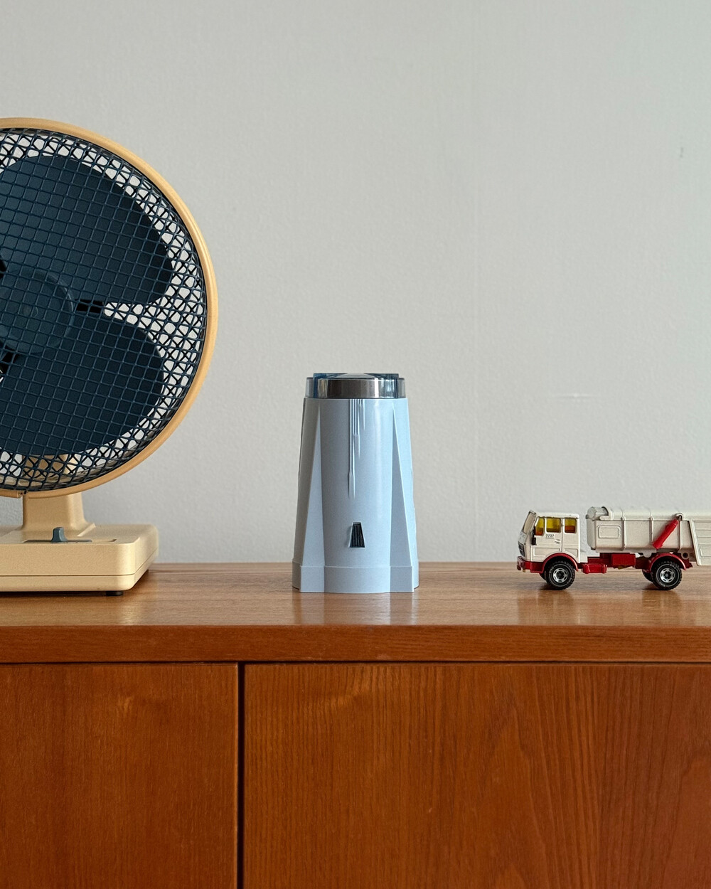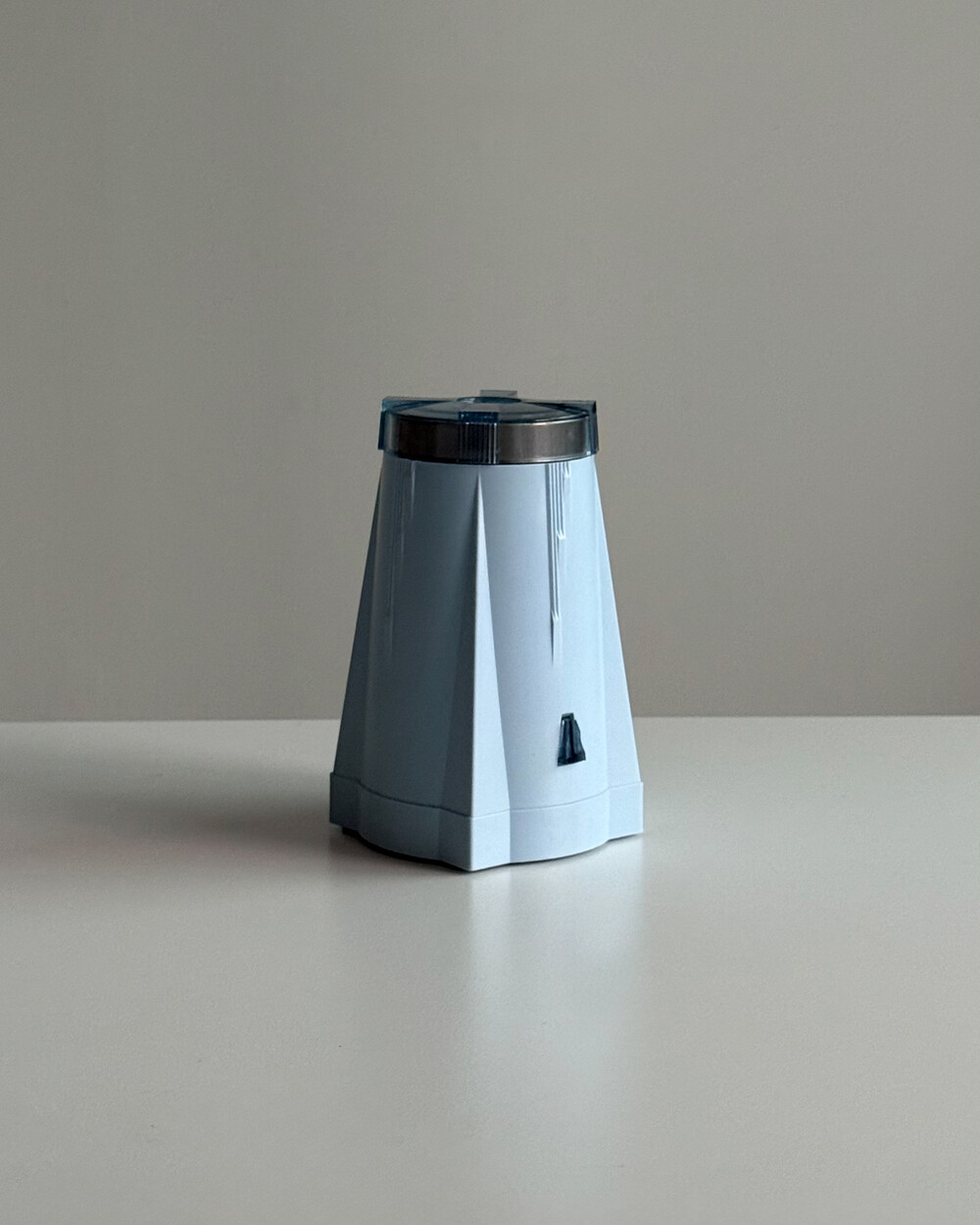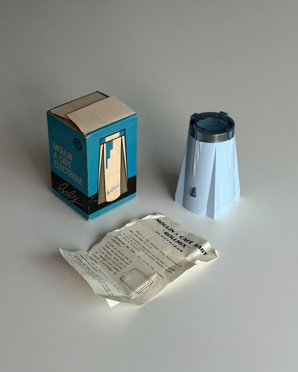 1970년대 프랑스에서 제작된 어린이용 전동 커피 그라인더 장난감입니다. 1960년대 후반~ 1970년대 중반 당시 유럽은 작동하는 미니 가전 장난감이 크게 유행한 시기로, 실제로 소량의 원두를 안전하게 분쇄할 수 있는 어린이용 제품으로 설계되었습니다. 당시 토이 가전의 레트로한 매력이 살아 있어, 공간에 놓는 것만으로도 시대적 분위기를 전해줍니다.