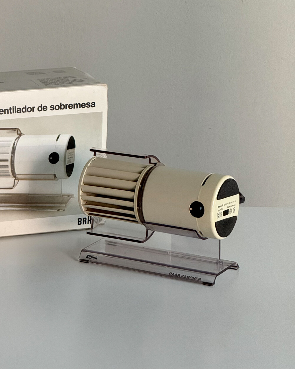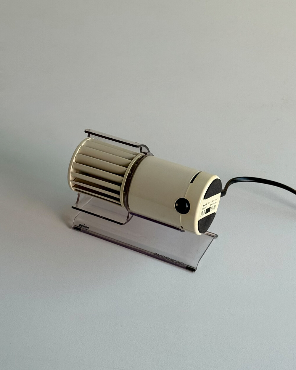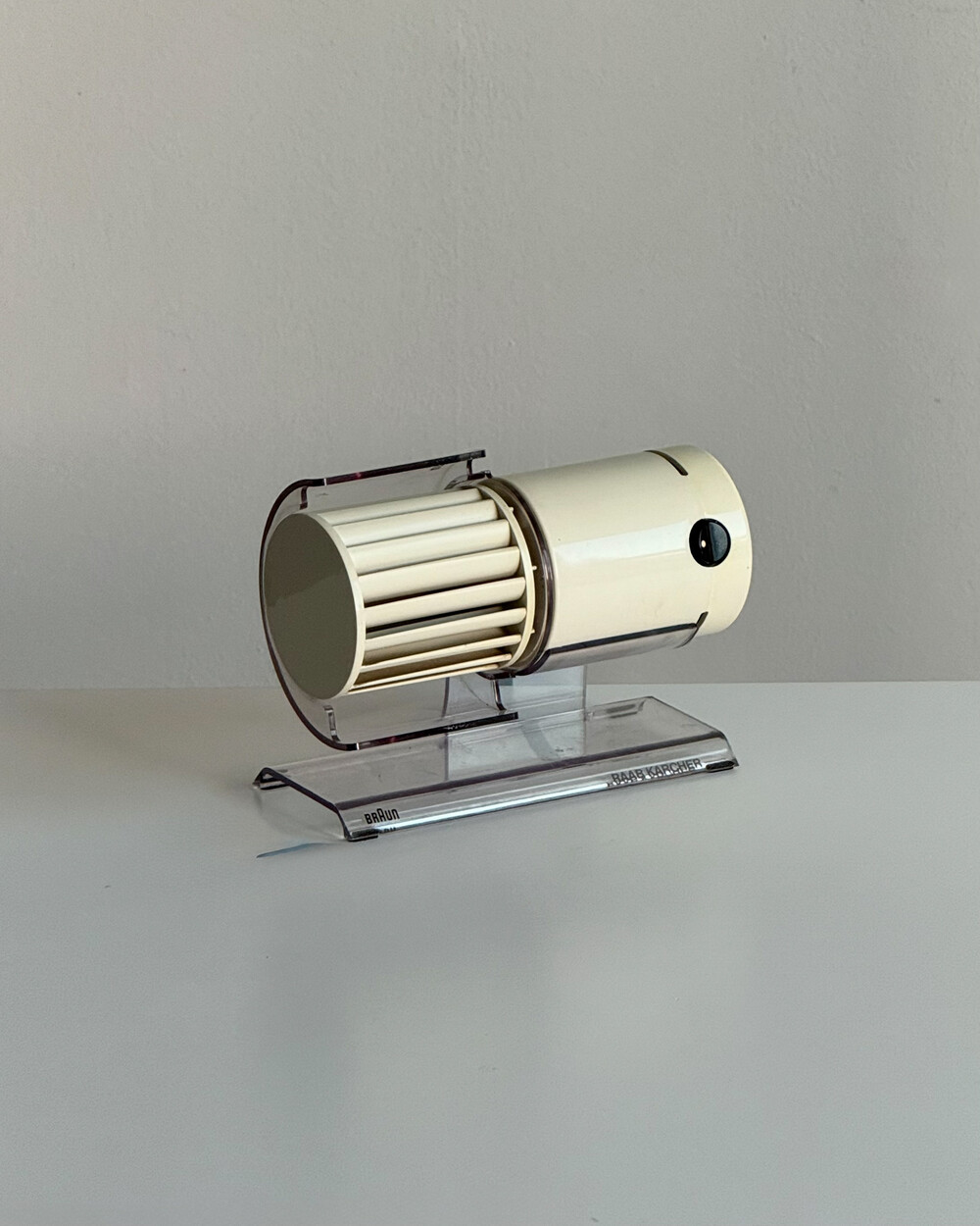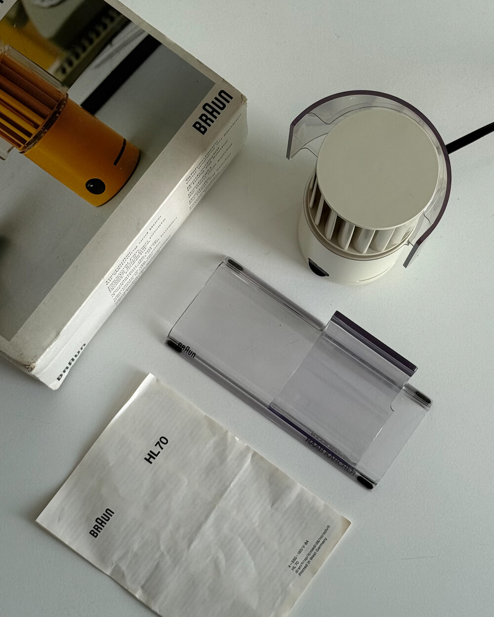 1970년대 생산되었던 BRAUN 사의 빈티지 데스크 팬 HL70입니다. 1971년 Reinhold Weiss와 Jürgen Greubel이 공동으로 디자인되었습니다. 본체 크기는 이전 초기작이었던 HL 1보다 컴팩트해졌으며, 모터가 있는 팬 롤러와 지지대가 분리되는 구조로 제작되어 배치와 이동이 훨씬 자유롭습니다. 모든 기능은 하나의 스위치로 제어하도록 설계되어, BRAUN 특유의 직관적인 사용성을 보여주는 제품입니다. HL 70은 현재 뉴욕 현대미술관(MoMA)에 영구 소장된 디자인 오브제로, 시대를 대표하는 브라운의 디자인 철학이 잘 드러나는 작품입니다.