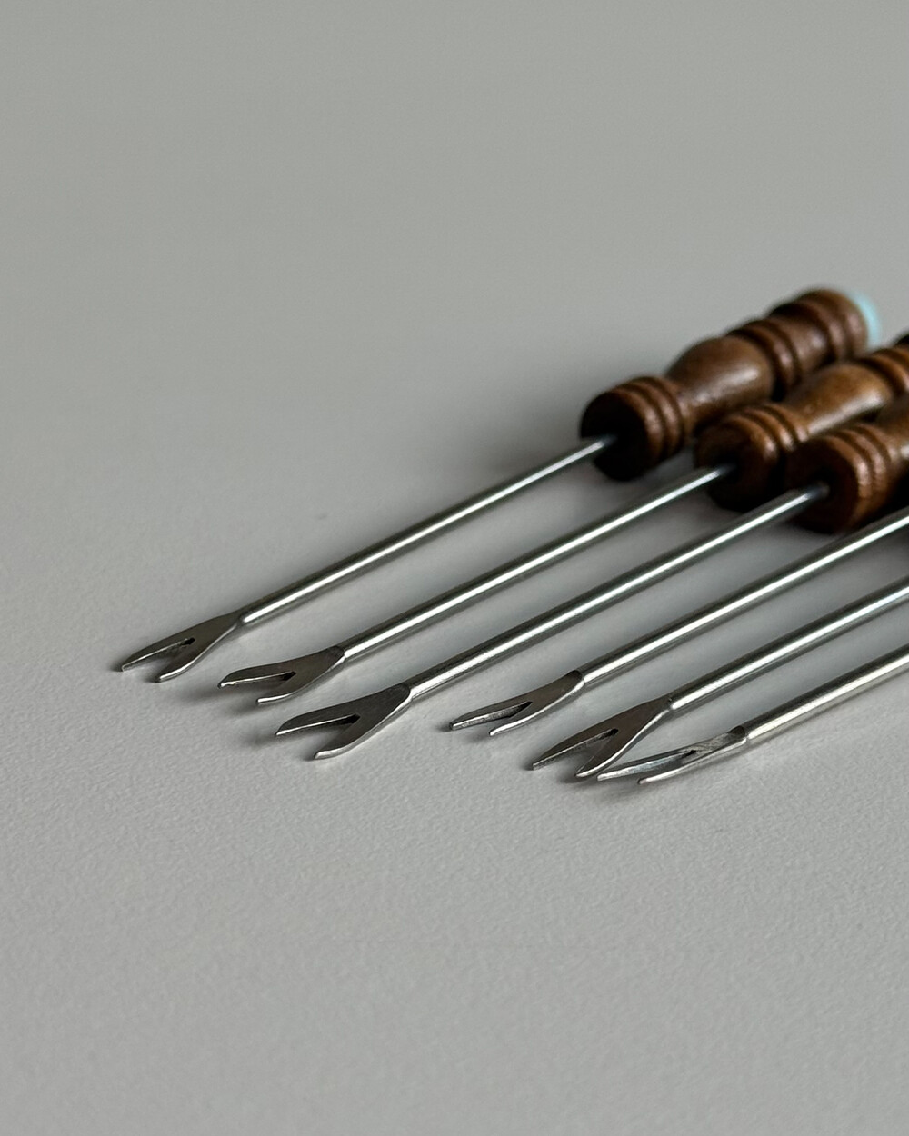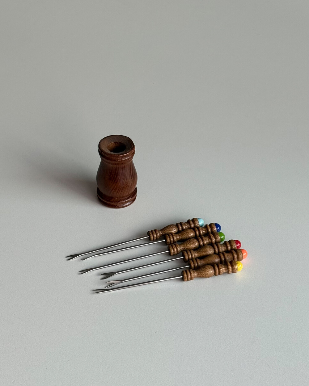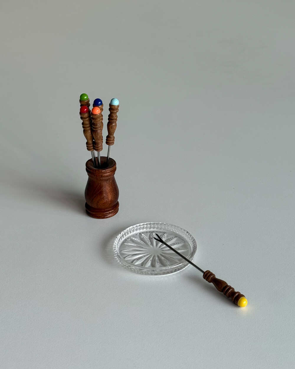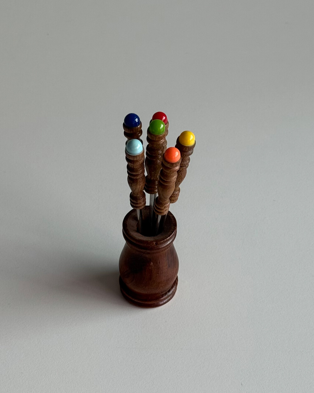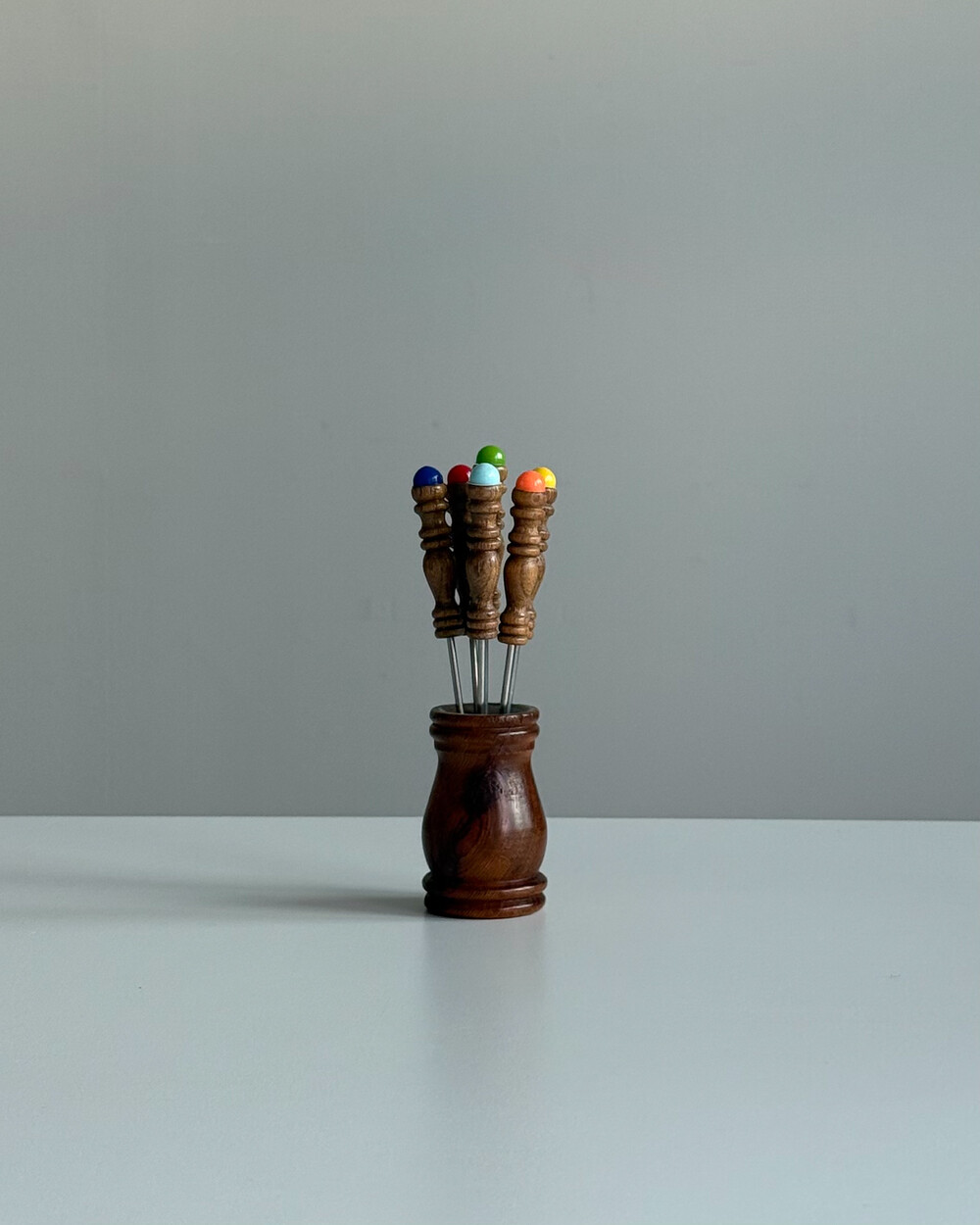 1970년도 독일에서 생산되었던 빈티지 칵테일 픽 세트입니다. 우드 핸들로 이루어진 6개의 미니 포크와, 보관할 수 있는 홀더로 이루어져있습니다. 과일 또는 디저트 등을 드실 때 사용하시기에 좋은 제품입니다.
