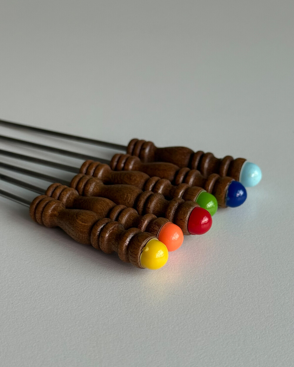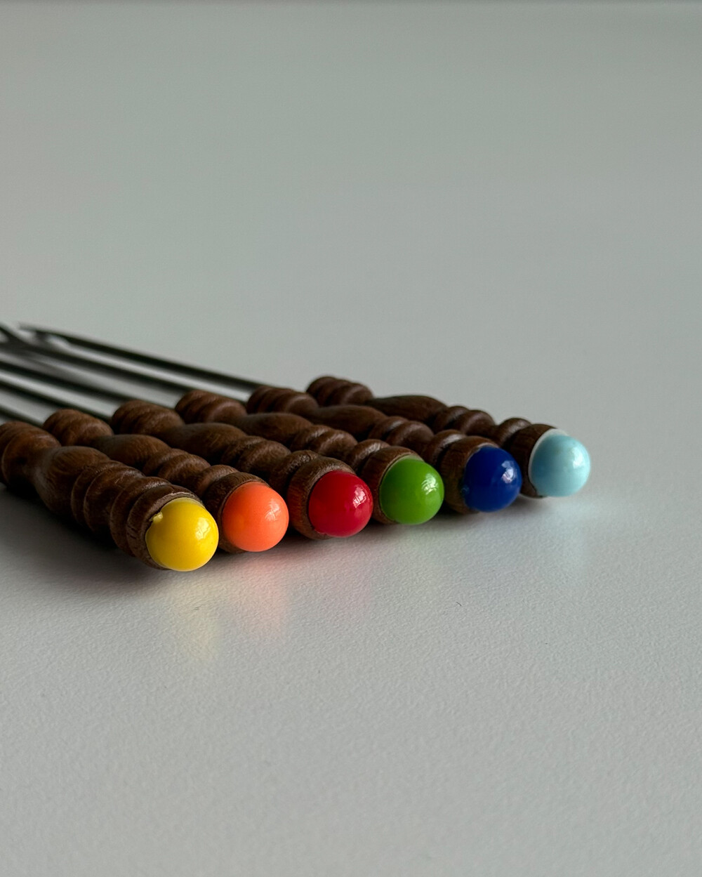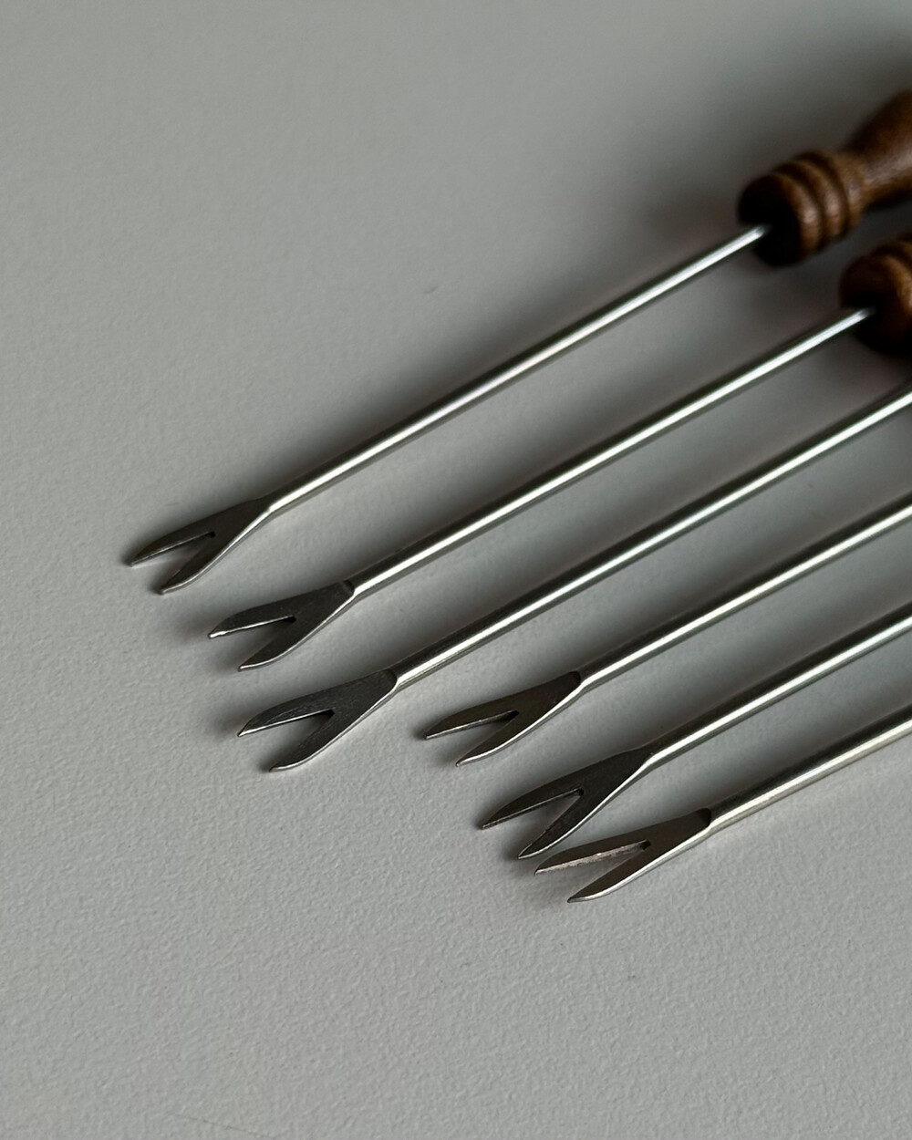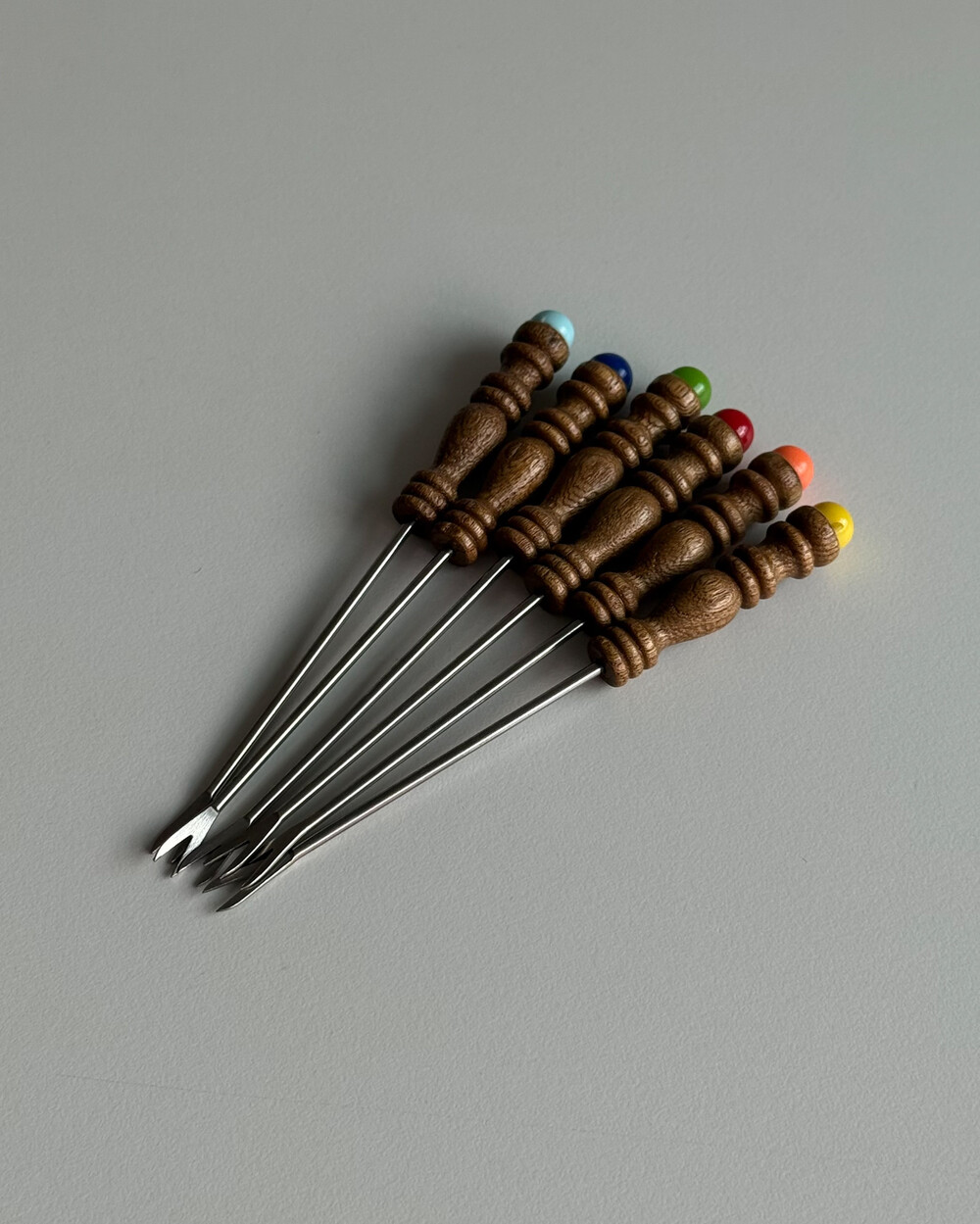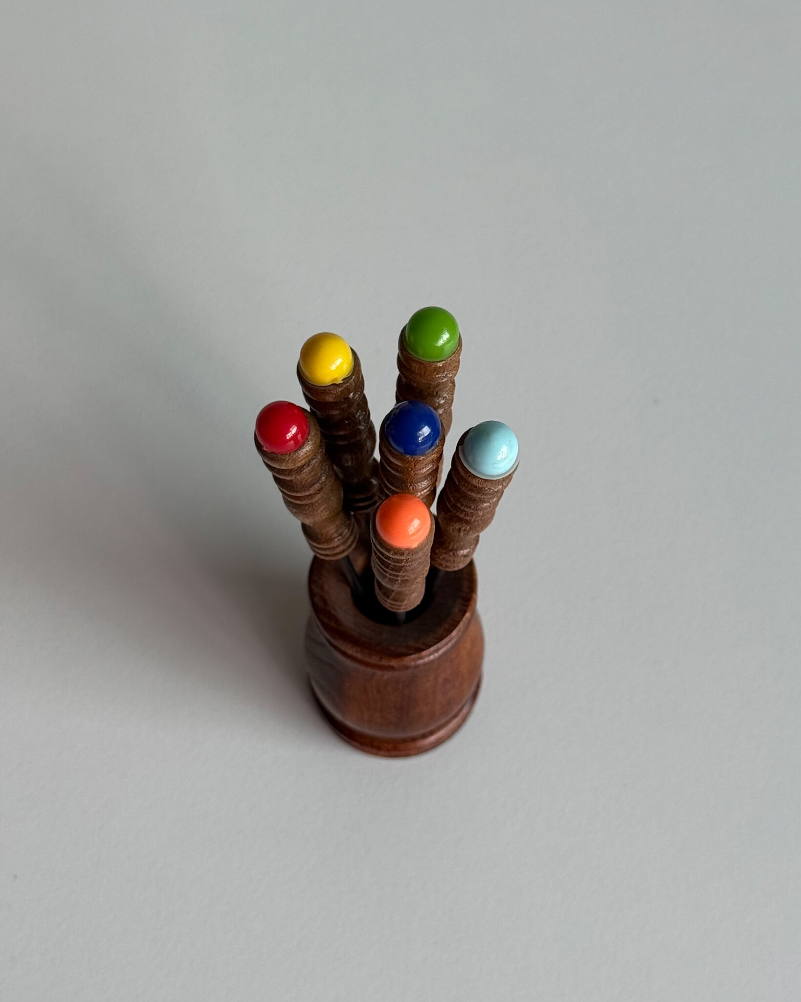 1970년도 독일에서 생산되었던 빈티지 칵테일 픽 세트입니다. 우드 핸들로 이루어진 6개의 미니 포크와, 보관할 수 있는 홀더로 이루어져있습니다. 과일 또는 디저트 등을 드실 때 사용하시기에 좋은 제품입니다.