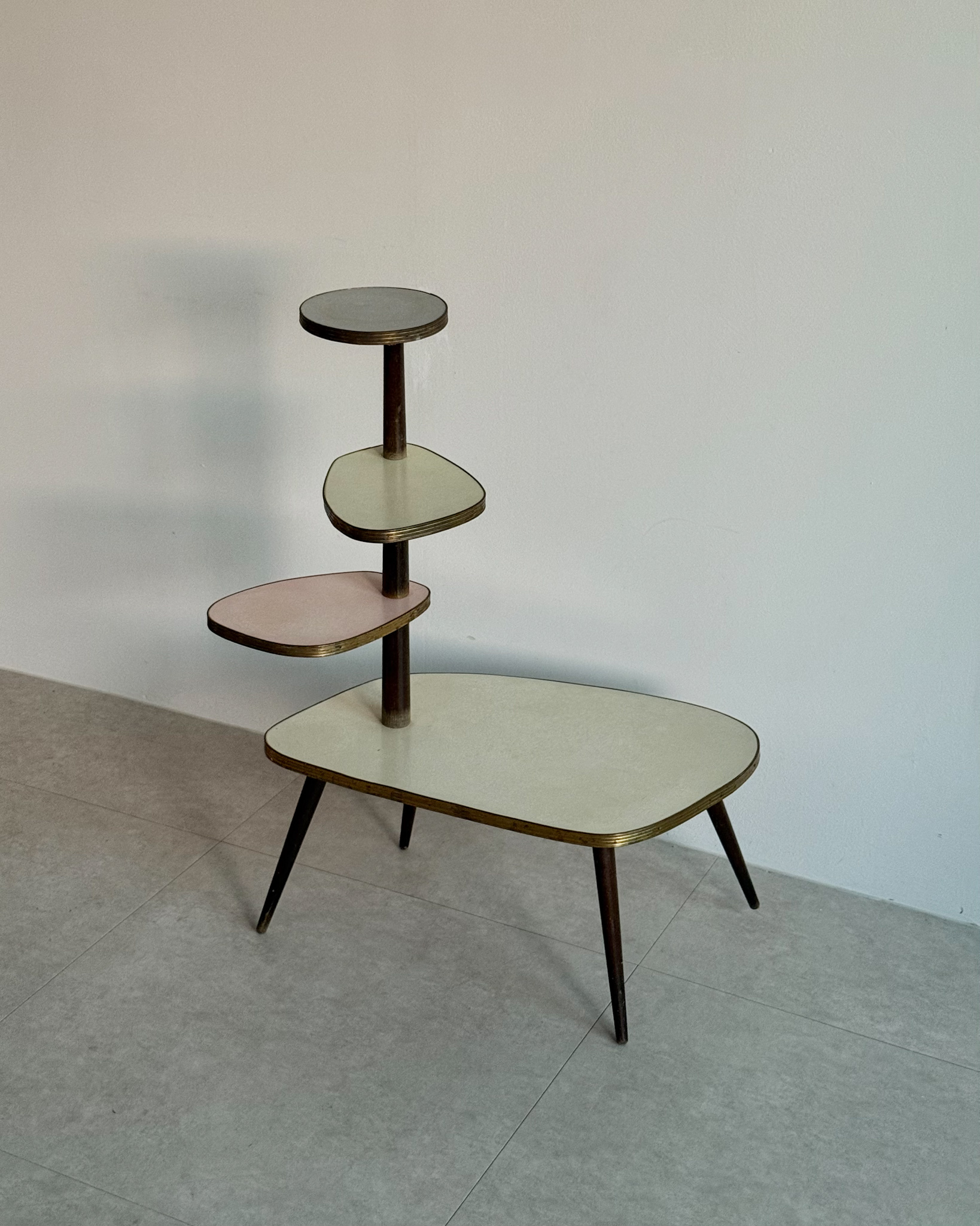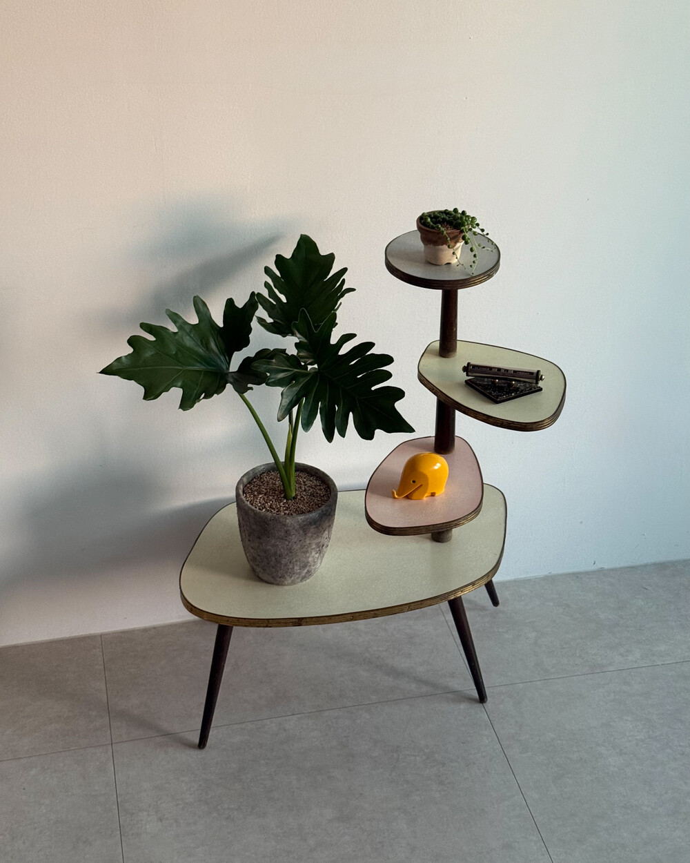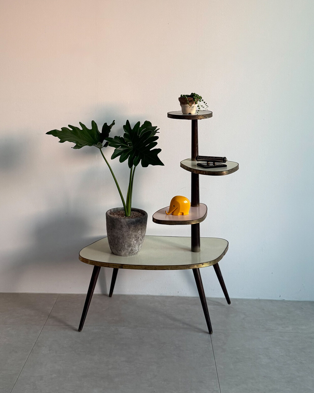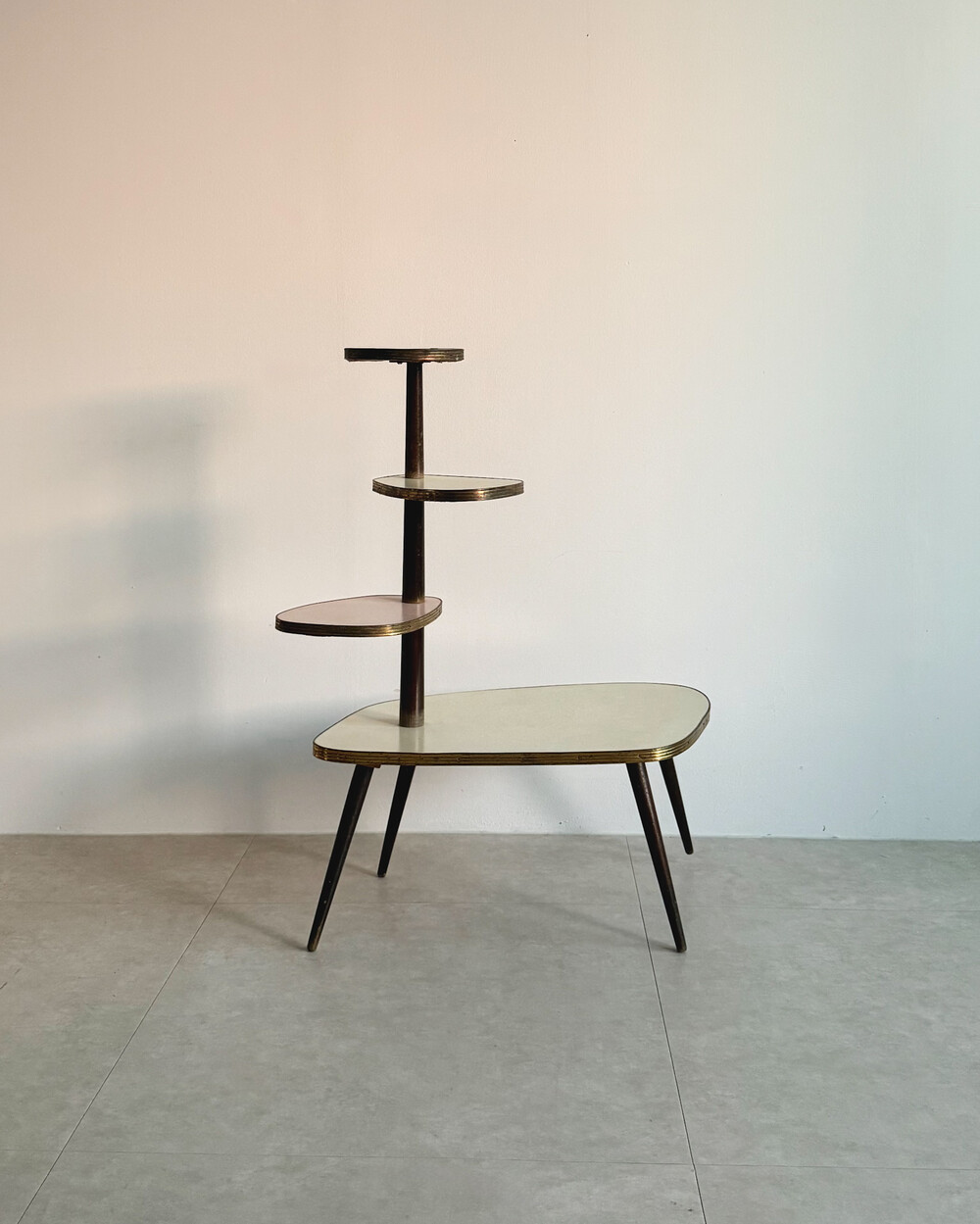 1960년대 서독에서 제작된 빈티지 식물 스탠드입니다. 곡선형 상판 위로 라이트 그레이, 레몬, 핑크의 파스텔 톤 조합의 서브 쉘프가 3단 계단형으로 배열되어 있습니다. 각 단은 360도 회전이 가능한 구조로 자유로운 배치와 연출이 가능합니다. 식물 스탠드 외에도 오브제, 조명, 서적 등을 함께 연출하실 수 있습니다.