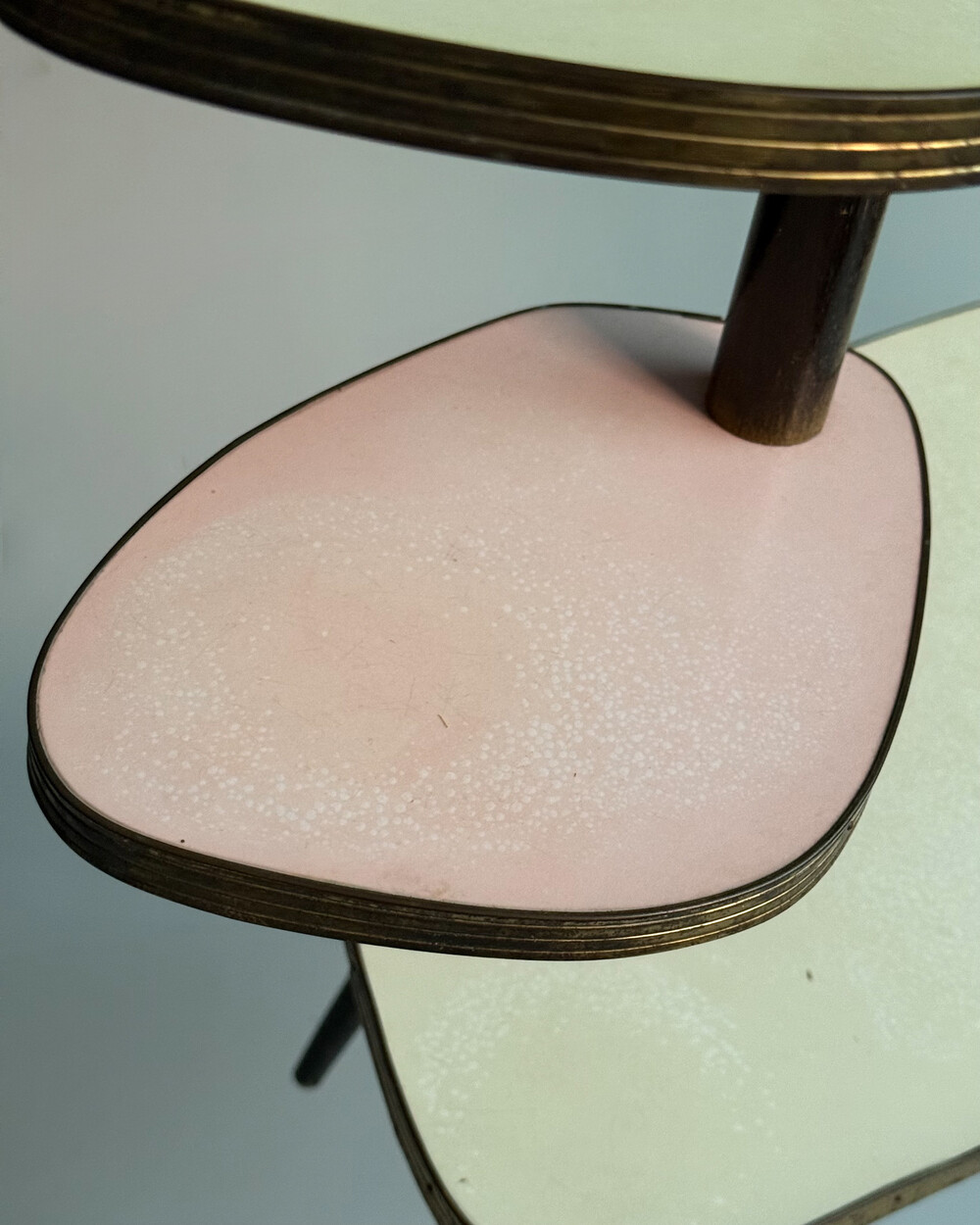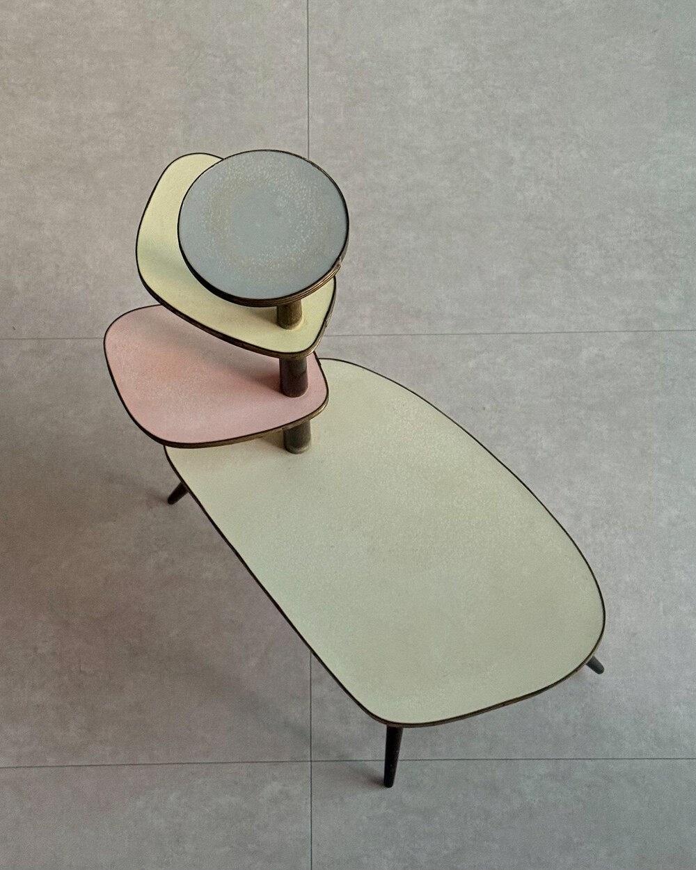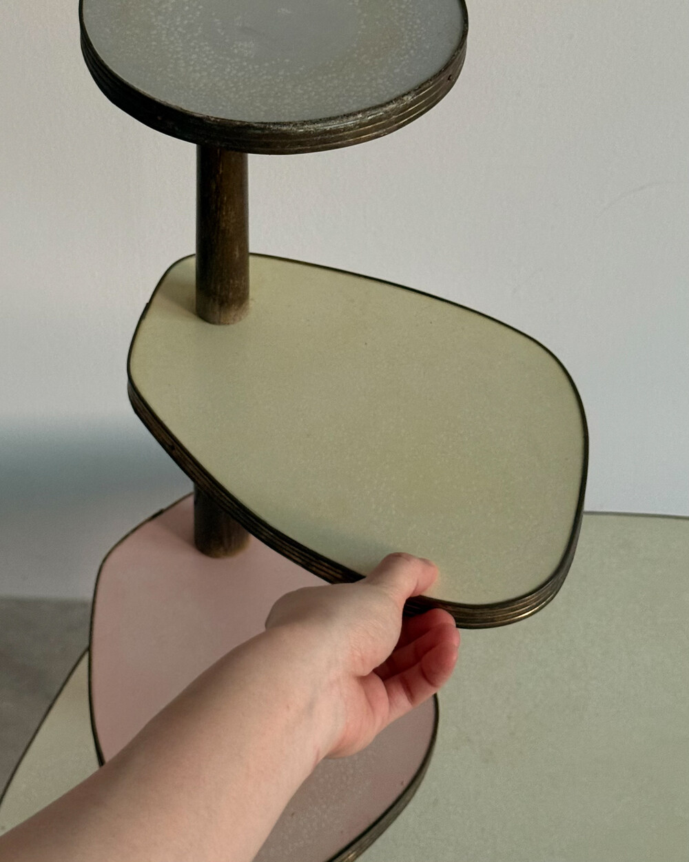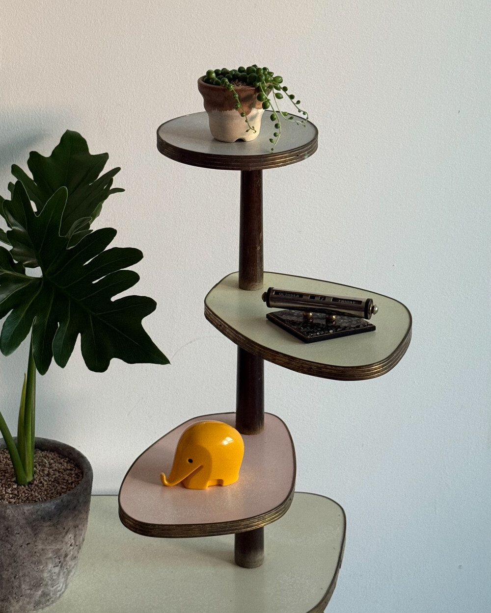 1960년대 서독에서 제작된 빈티지 식물 스탠드입니다. 곡선형 상판 위로 라이트 그레이, 레몬, 핑크의 파스텔 톤 조합의 서브 쉘프가 3단 계단형으로 배열되어 있습니다. 각 단은 360도 회전이 가능한 구조로 자유로운 배치와 연출이 가능합니다. 식물 스탠드 외에도 오브제, 조명, 서적 등을 함께 연출하실 수 있습니다.
