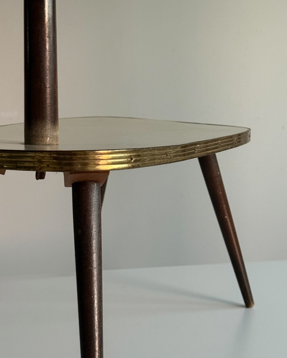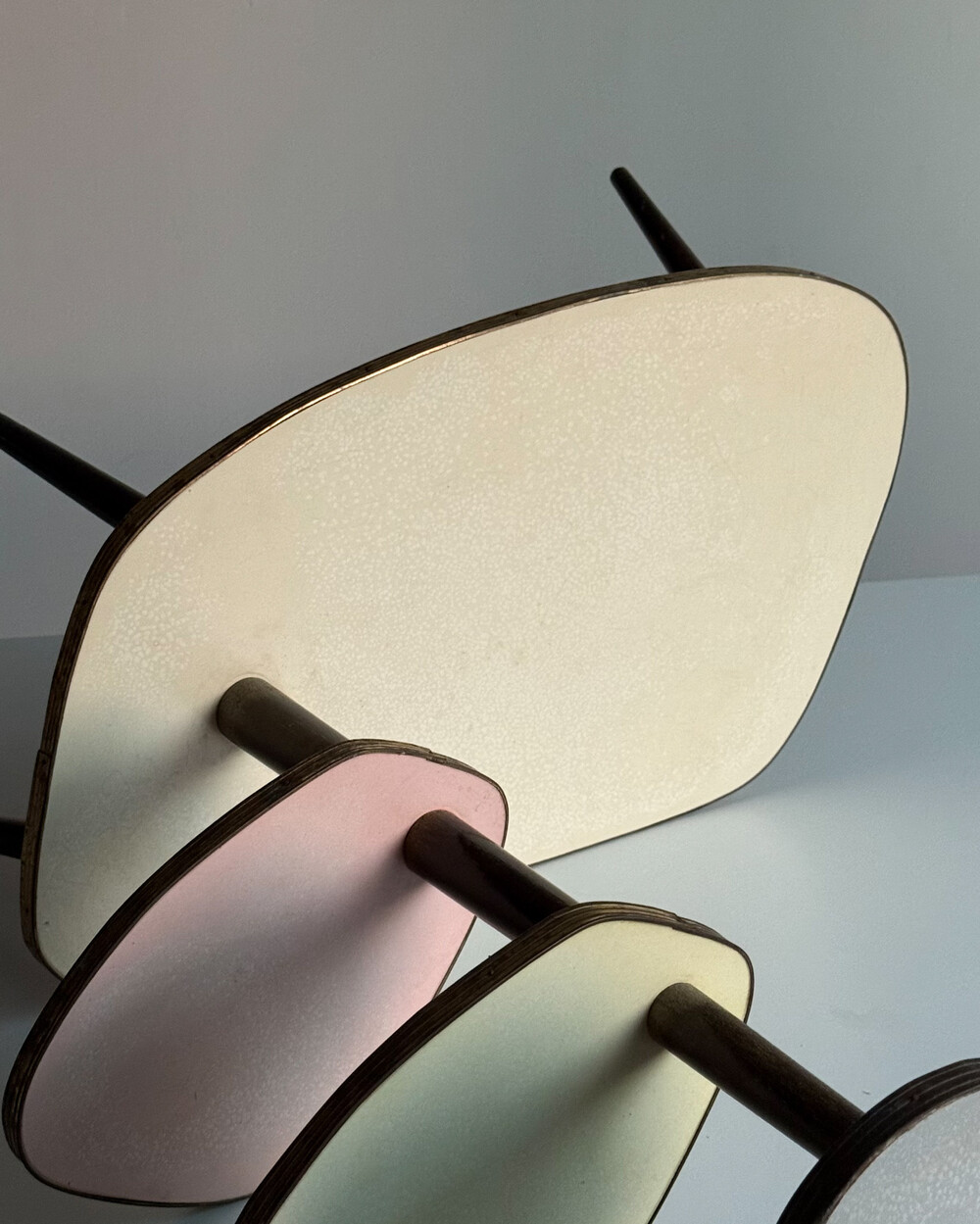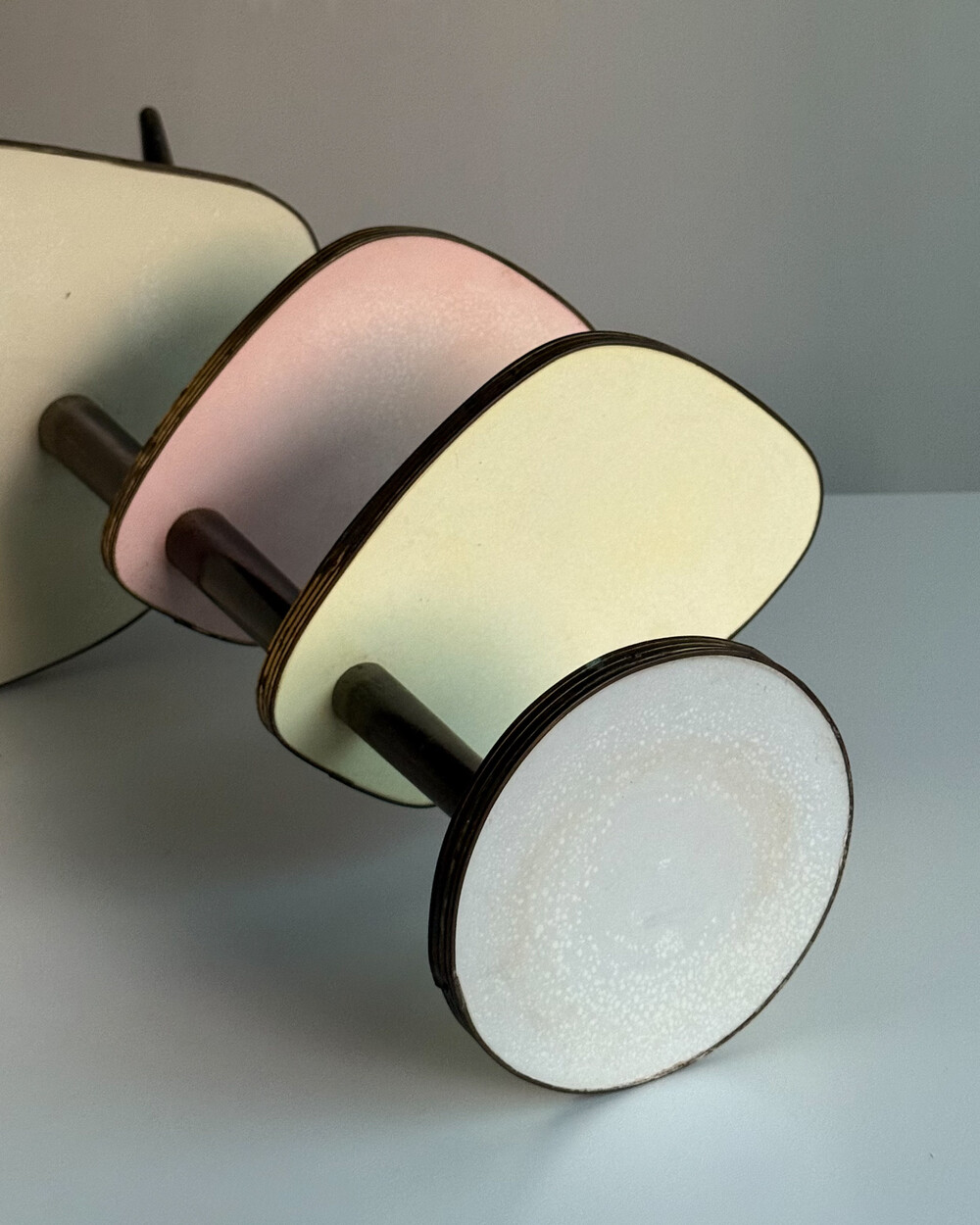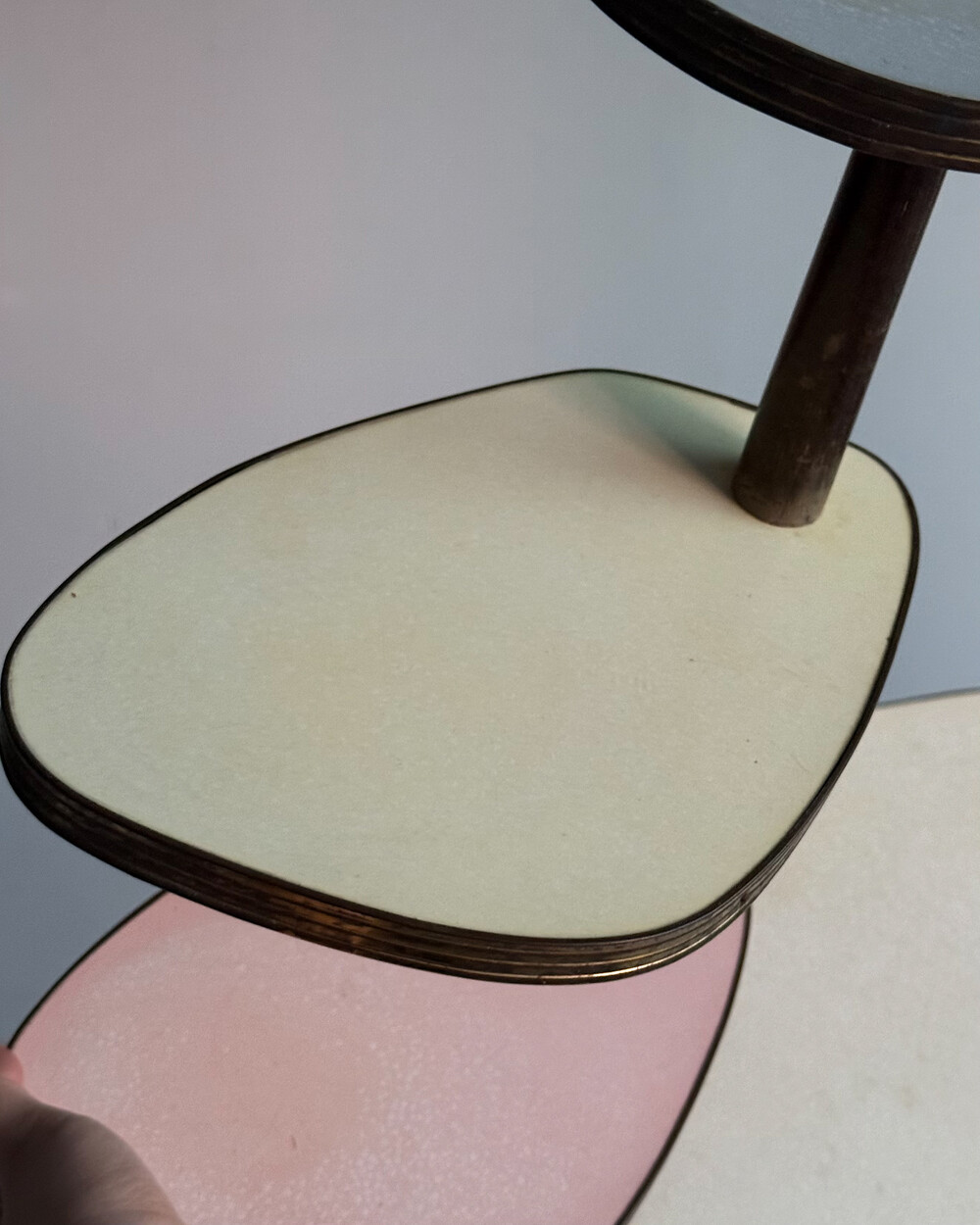 1960년대 서독에서 제작된 빈티지 식물 스탠드입니다. 곡선형 상판 위로 라이트 그레이, 레몬, 핑크의 파스텔 톤 조합의 서브 쉘프가 3단 계단형으로 배열되어 있습니다. 각 단은 360도 회전이 가능한 구조로 자유로운 배치와 연출이 가능합니다. 식물 스탠드 외에도 오브제, 조명, 서적 등을 함께 연출하실 수 있습니다.
