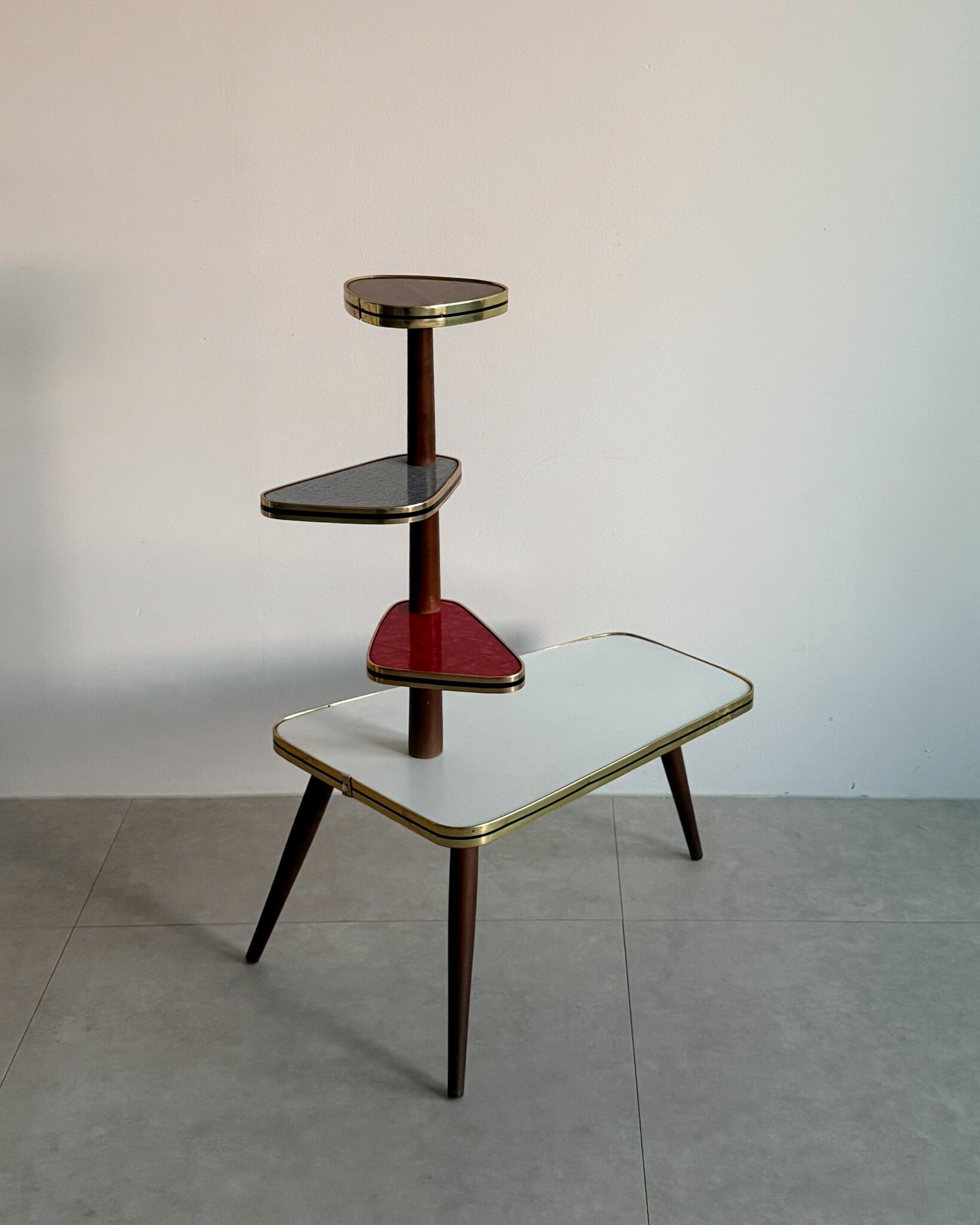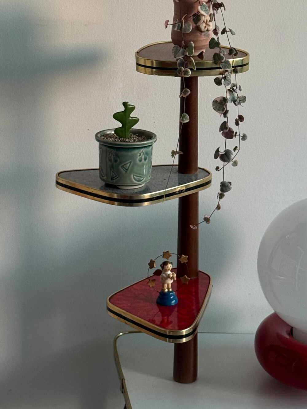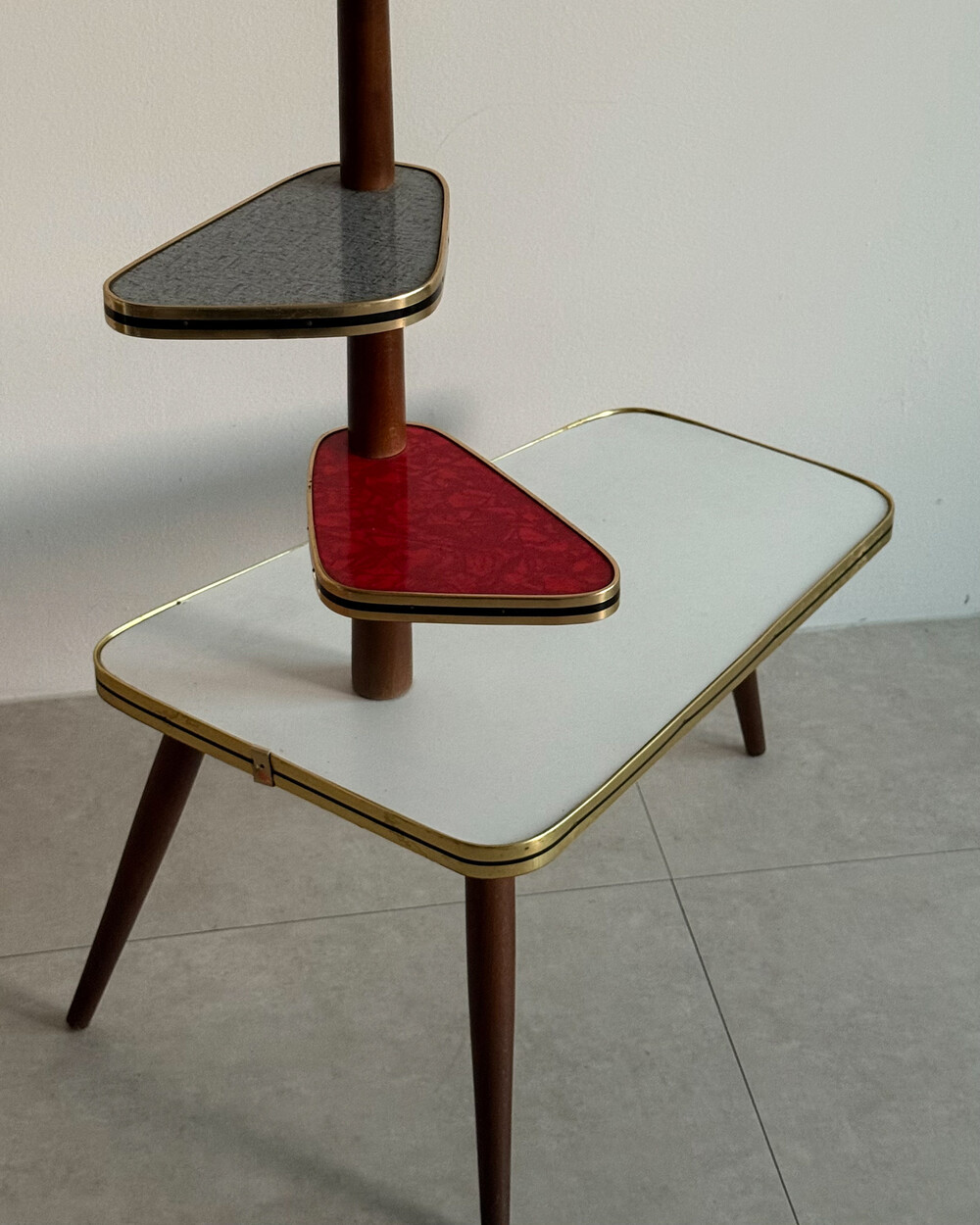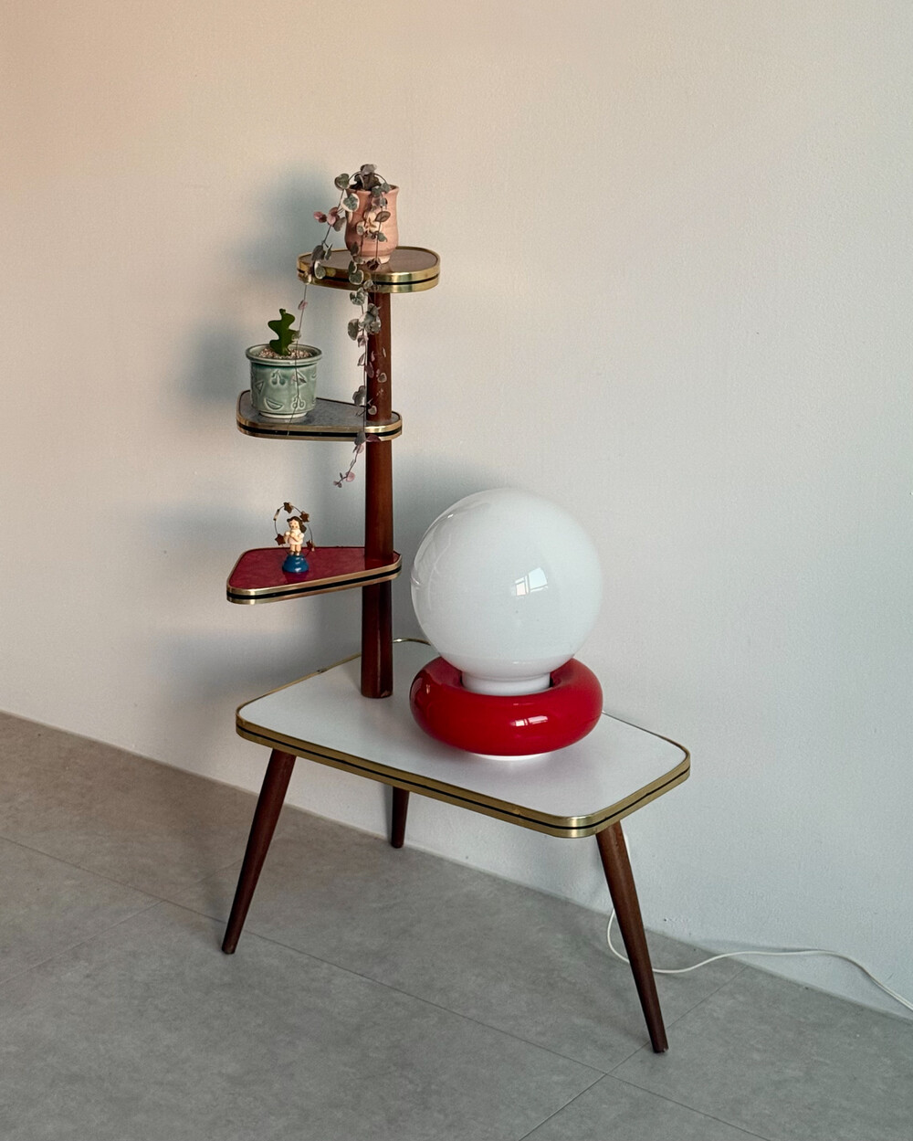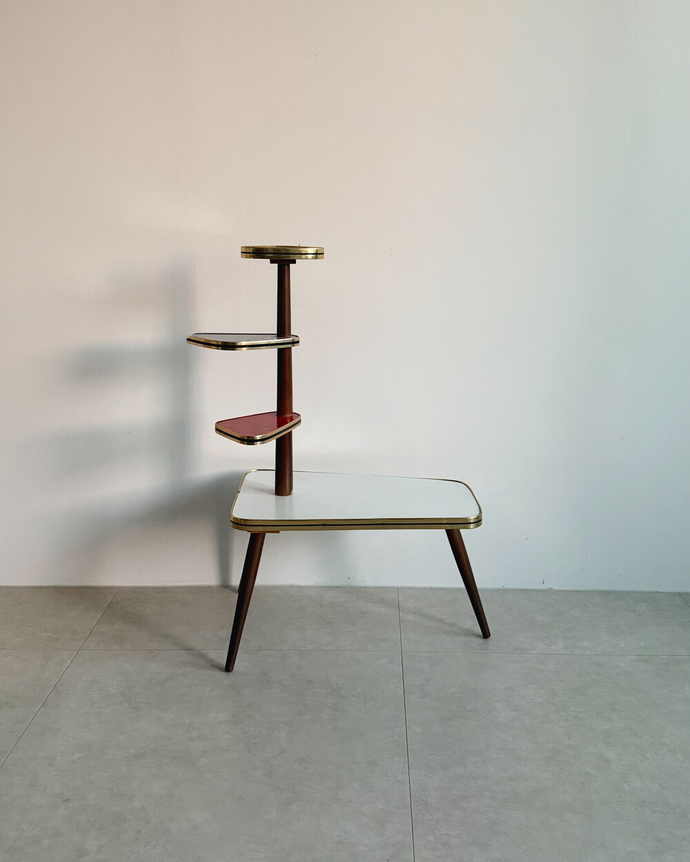 1960년대 서독에서 제작된 빈티지 식물 스탠드입니다. 화이트 톤의 메인 상판 위로 레드, 그레이, 월넛 컬러의 서브 쉘프가 3단 계단형으로 배열되어 있습니다. 각 단은 360도 회전이 가능한 구조로 자유로운 배치와 연출이 가능합니다. 식물 스탠드 외에도 오브제, 조명, 서적 등을 함께 연출하실 수 있습니다.