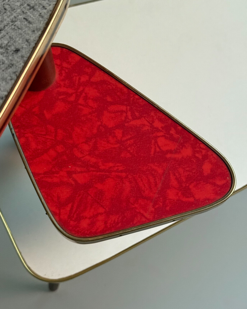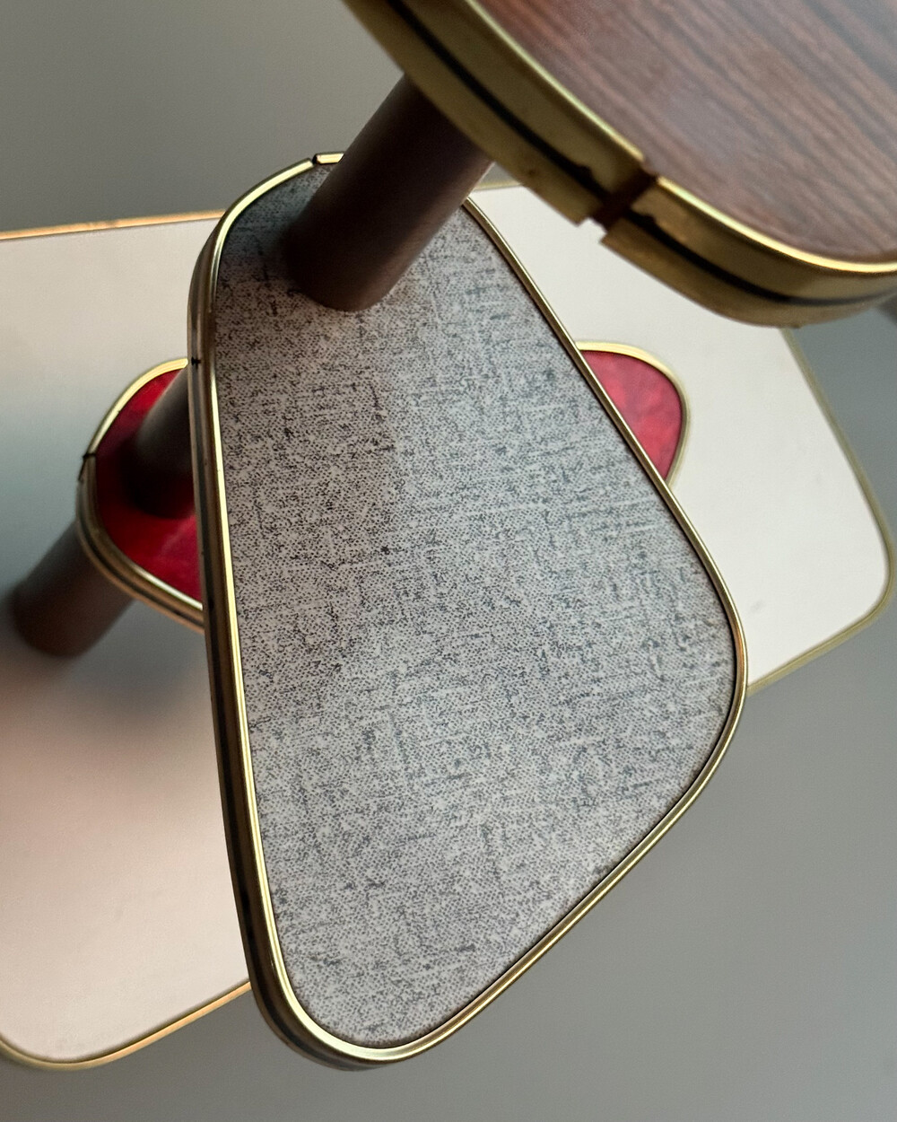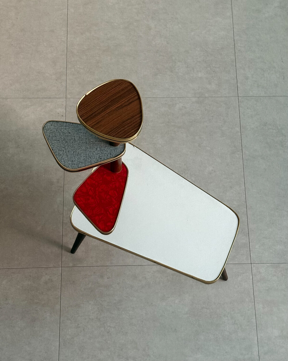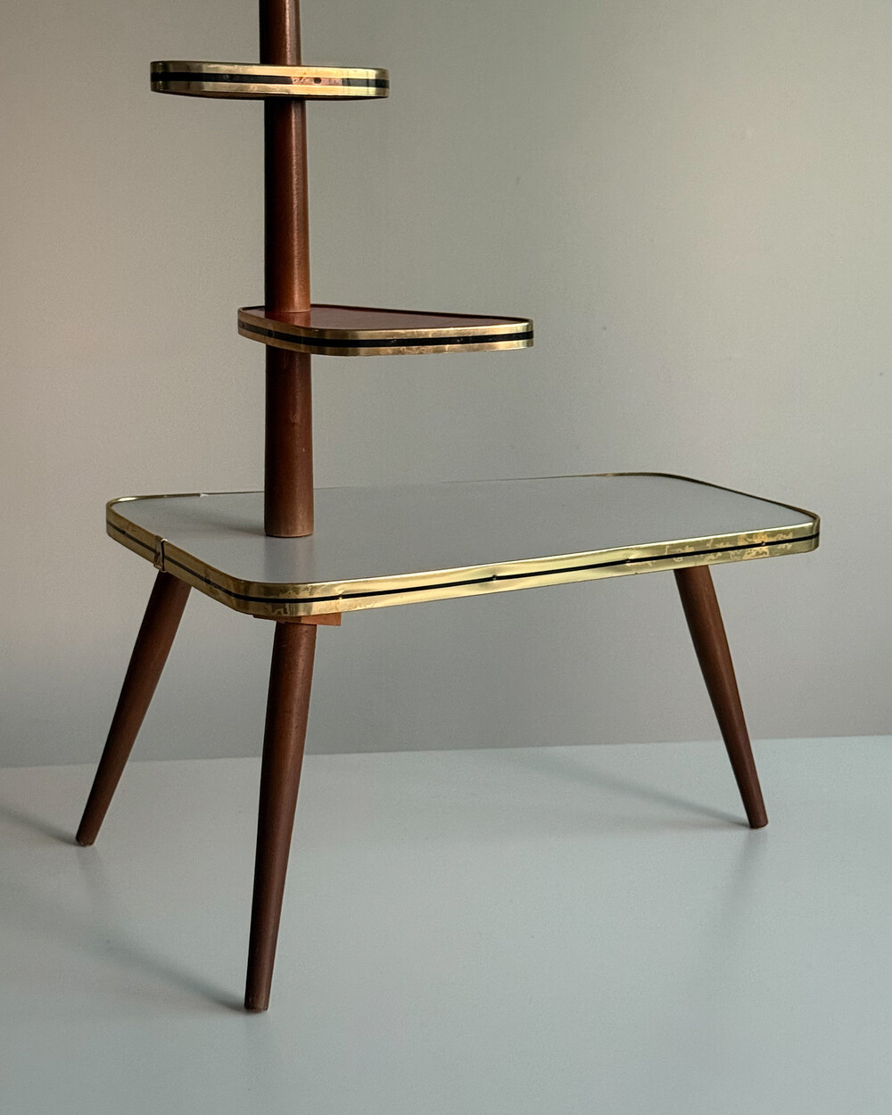 1960년대 서독에서 제작된 빈티지 식물 스탠드입니다. 화이트 톤의 메인 상판 위로 레드, 그레이, 월넛 컬러의 서브 쉘프가 3단 계단형으로 배열되어 있습니다. 각 단은 360도 회전이 가능한 구조로 자유로운 배치와 연출이 가능합니다. 식물 스탠드 외에도 오브제, 조명, 서적 등을 함께 연출하실 수 있습니다.