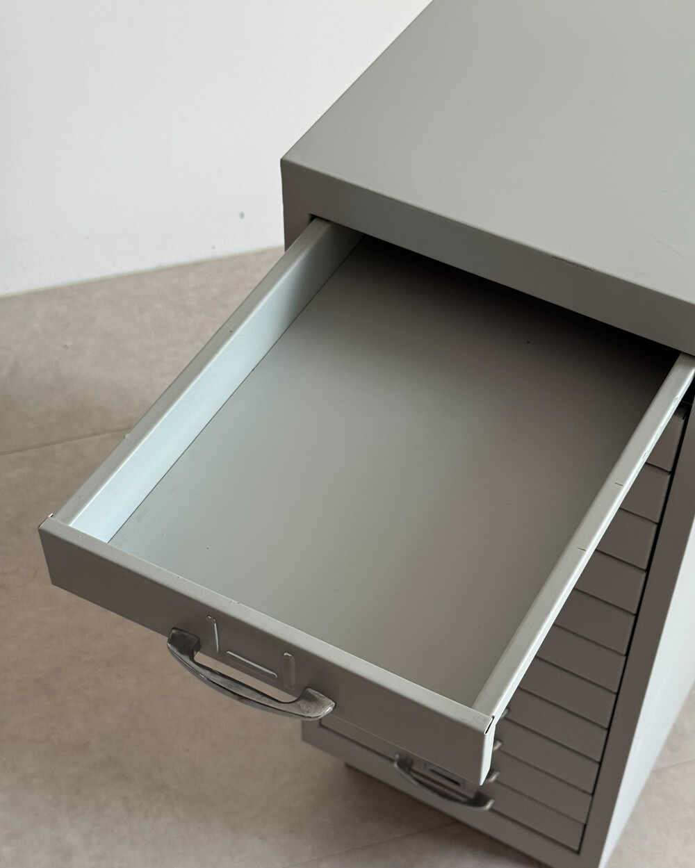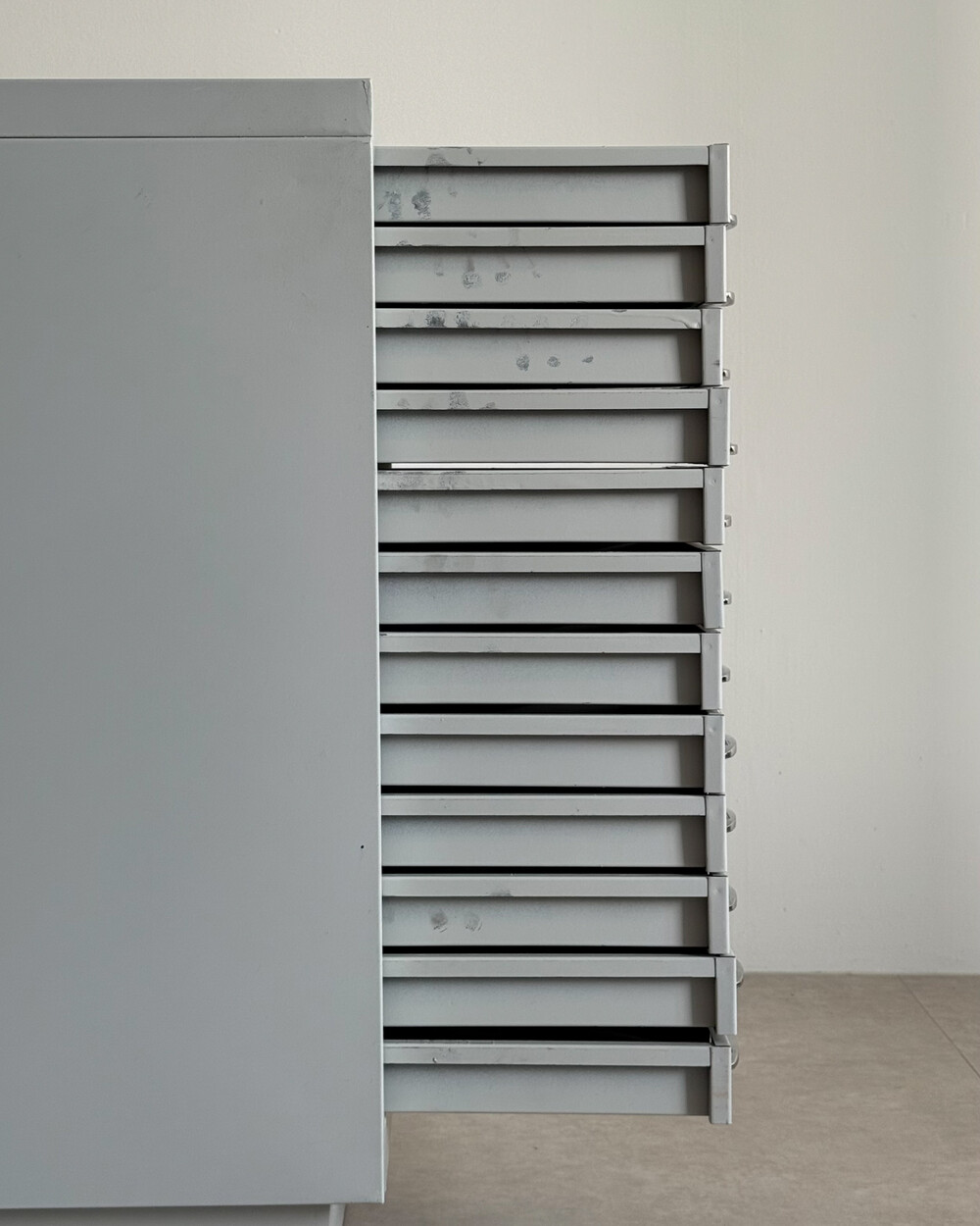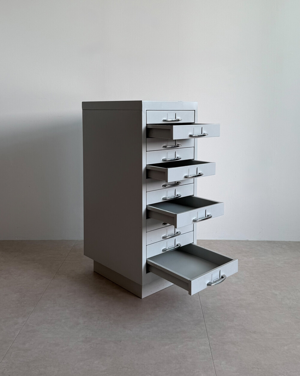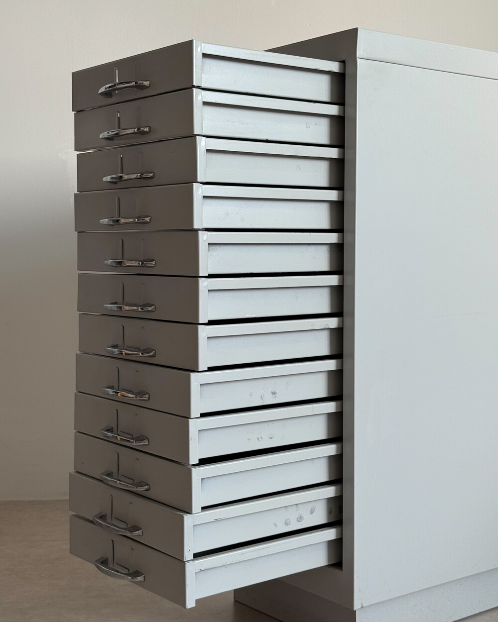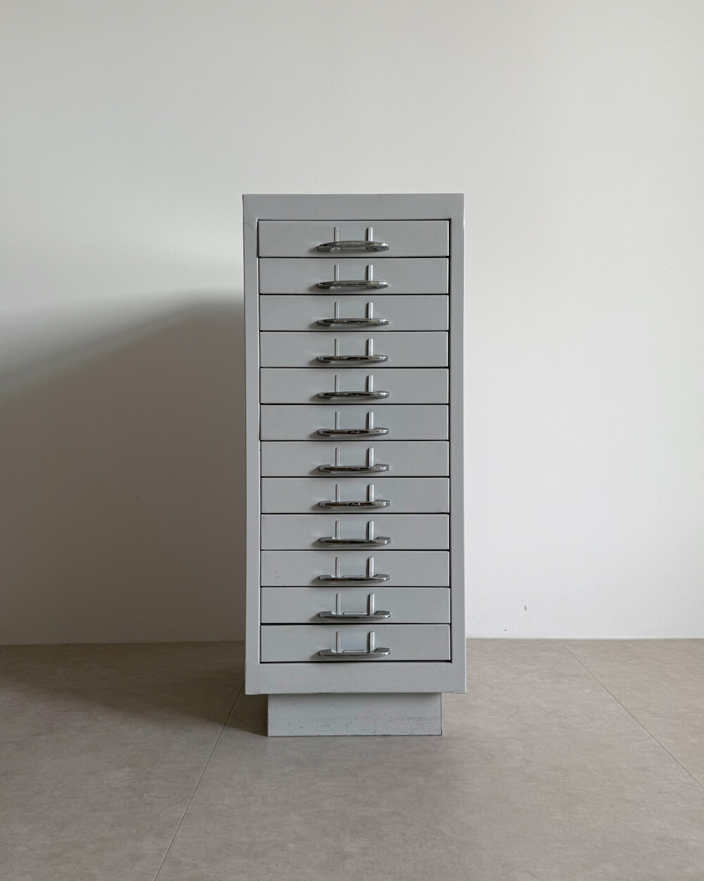 1980년대 네덜란드에서 제작된 빈티지 메탈 캐비닛입니다. 인더스트리얼 감성을 잘 보여주는 그레이 톤의 스틸 바디와 크롬 손잡이로 이루어져 있습니다. 11단의 안정적인 서랍 구조로 실용적으로 문서나 사무용 소품을 수납이 가능합니다.