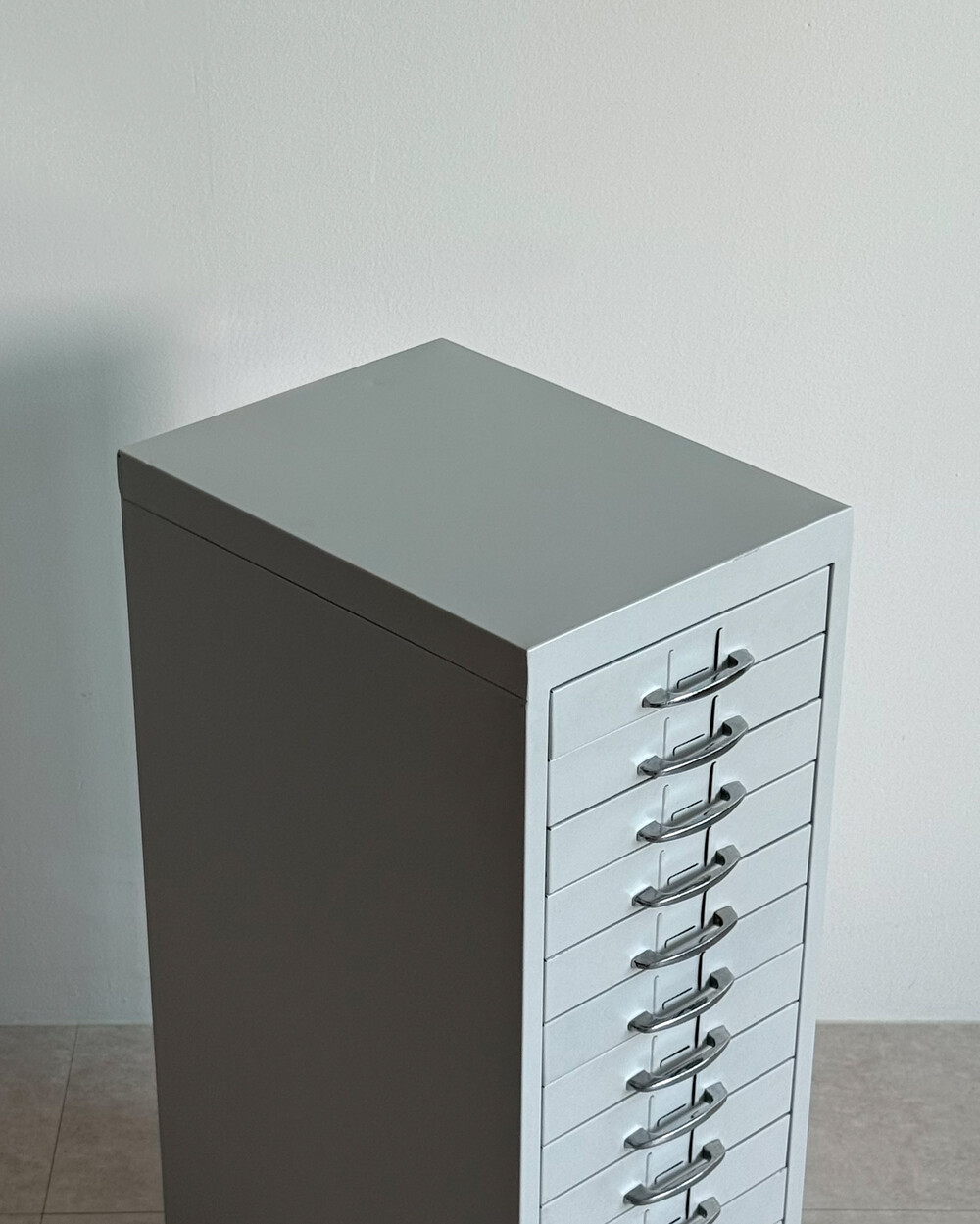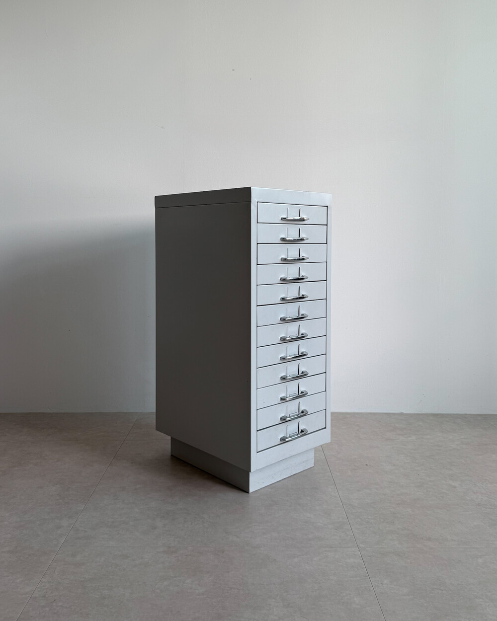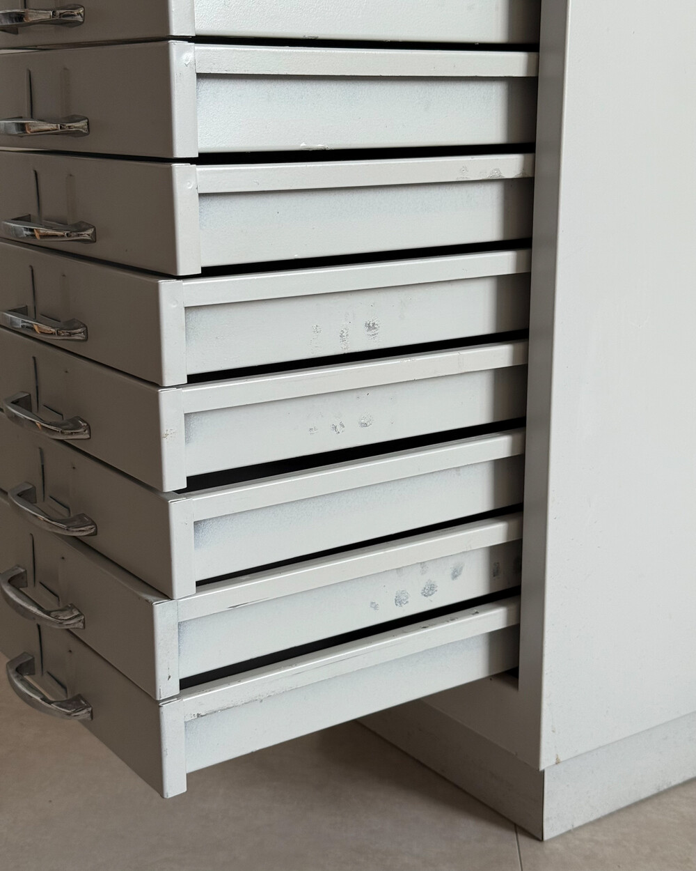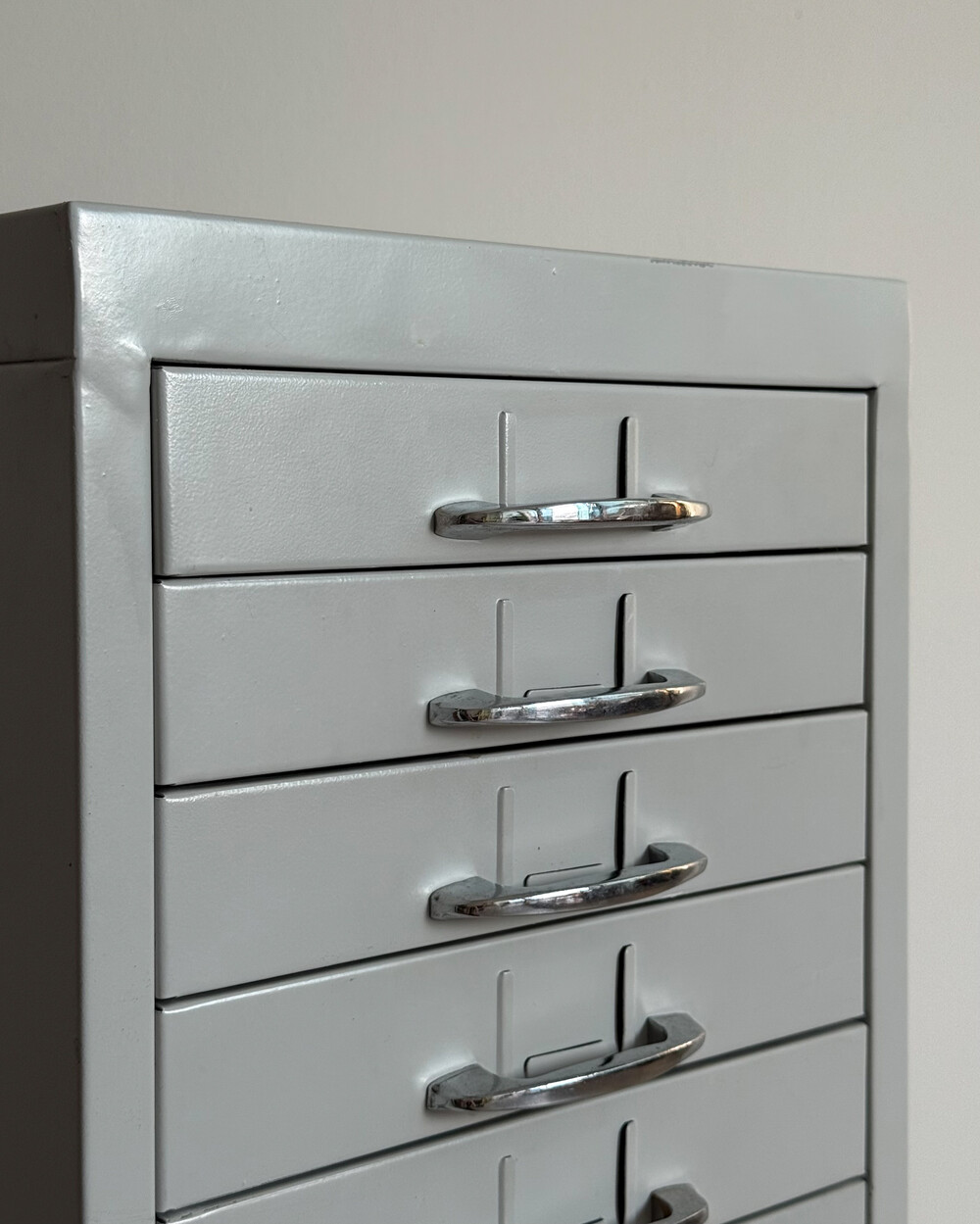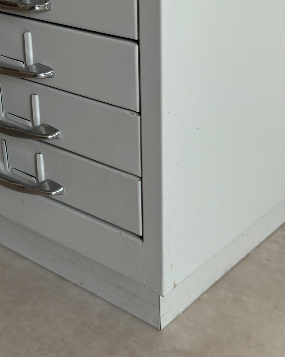 1980년대 네덜란드에서 제작된 빈티지 메탈 캐비닛입니다. 인더스트리얼 감성을 잘 보여주는 그레이 톤의 스틸 바디와 크롬 손잡이로 이루어져 있습니다. 11단의 안정적인 서랍 구조로 실용적으로 문서나 사무용 소품을 수납이 가능합니다.