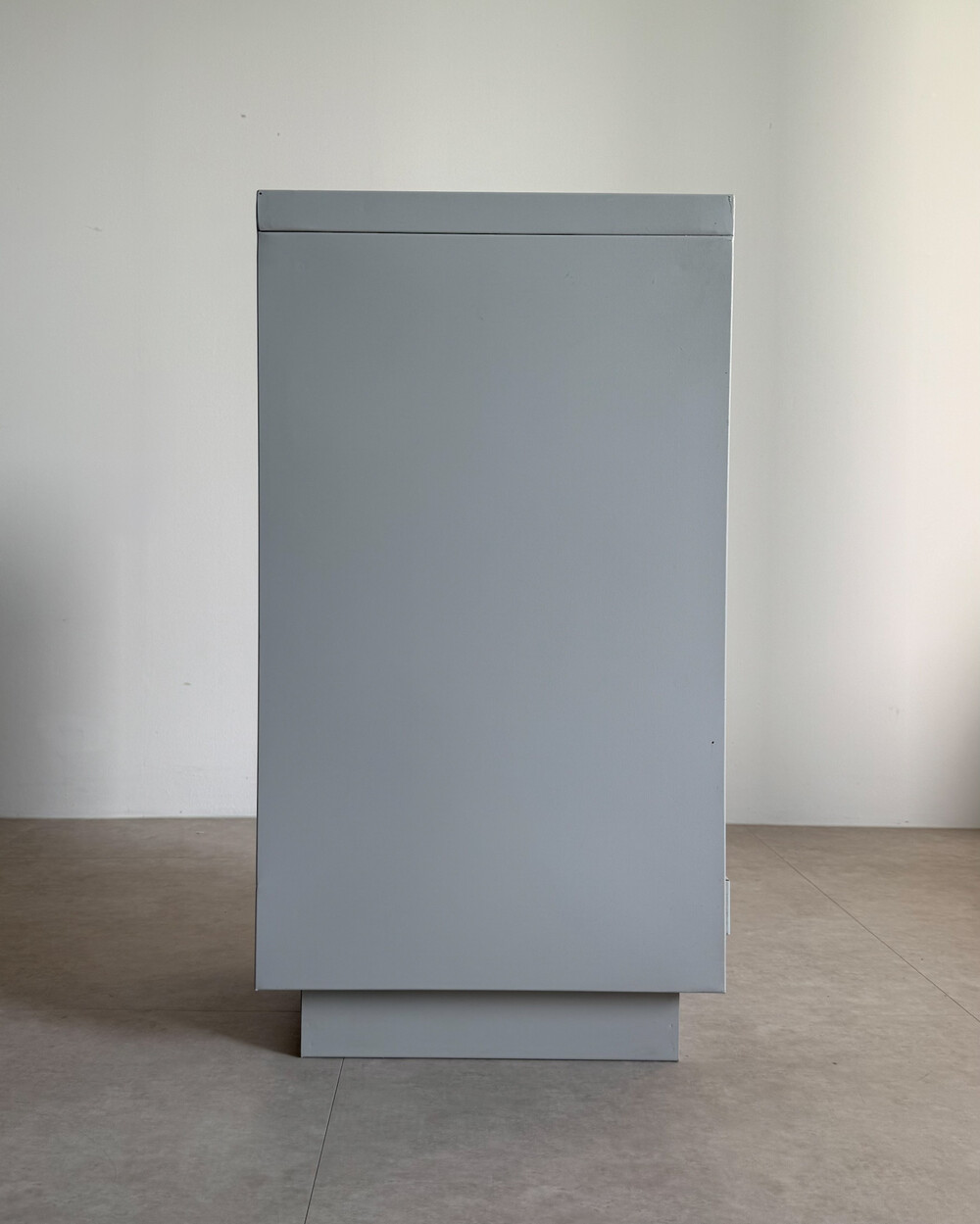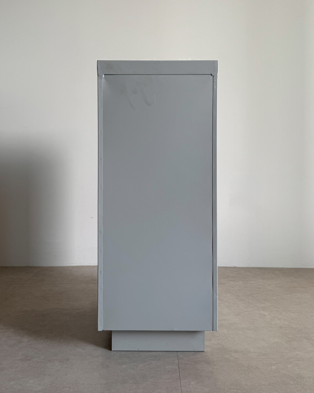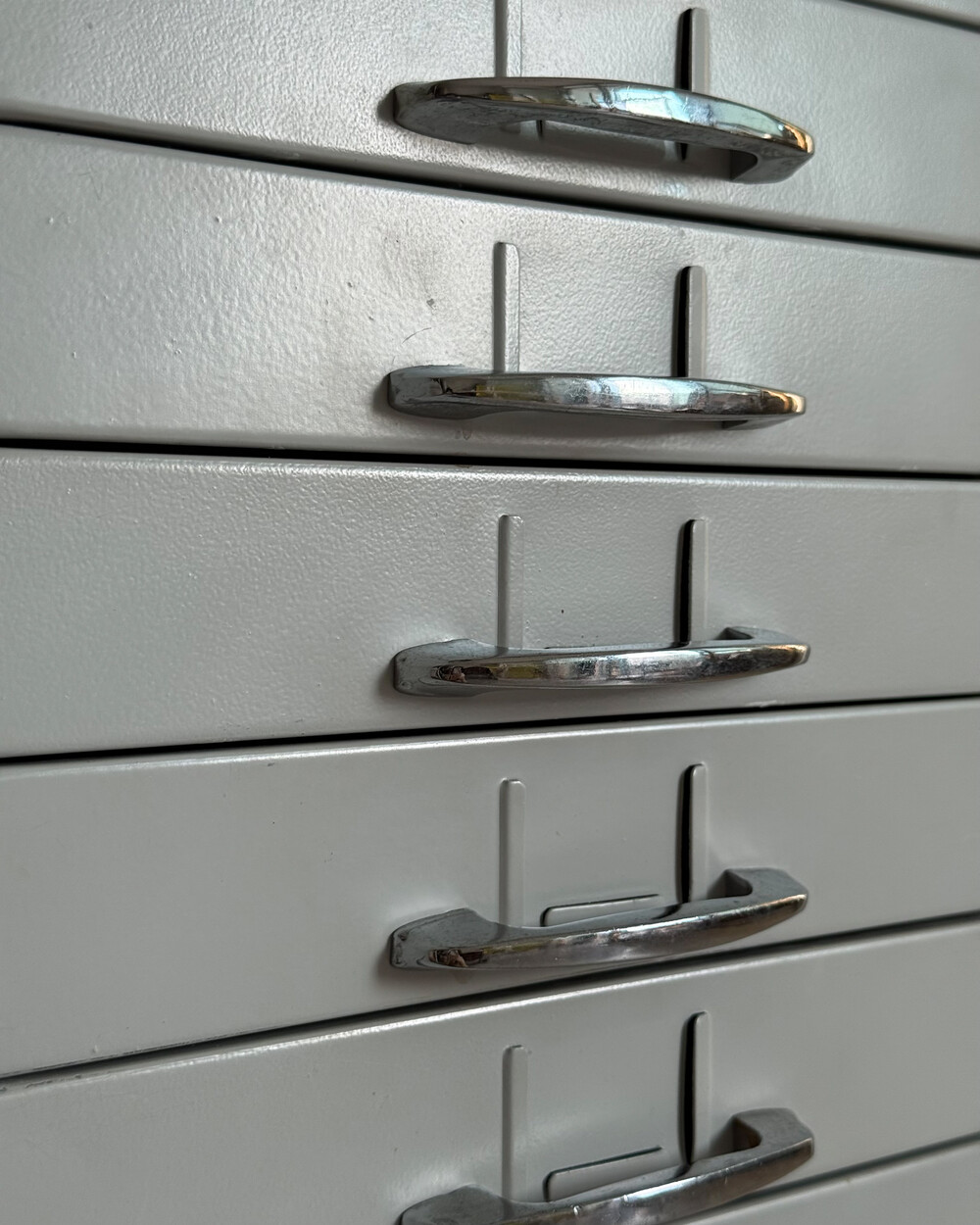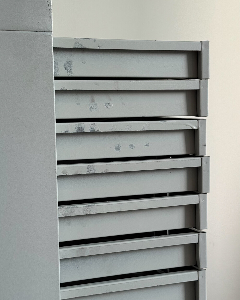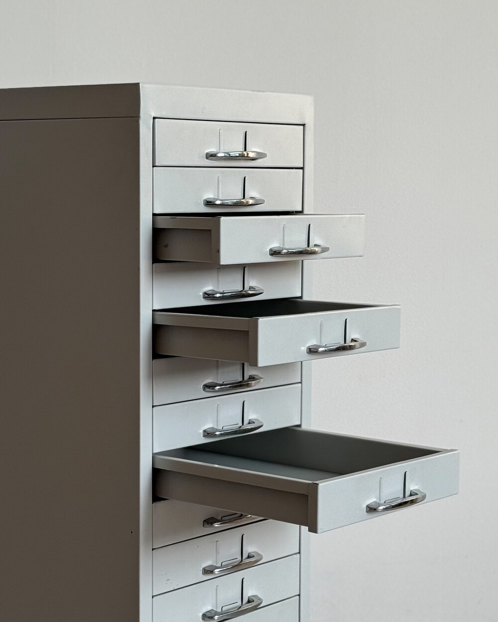 1980년대 네덜란드에서 제작된 빈티지 메탈 캐비닛입니다. 인더스트리얼 감성을 잘 보여주는 그레이 톤의 스틸 바디와 크롬 손잡이로 이루어져 있습니다. 11단의 안정적인 서랍 구조로 실용적으로 문서나 사무용 소품을 수납이 가능합니다.
