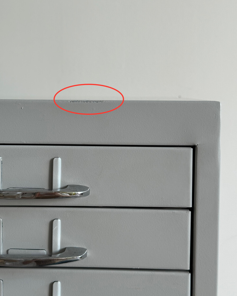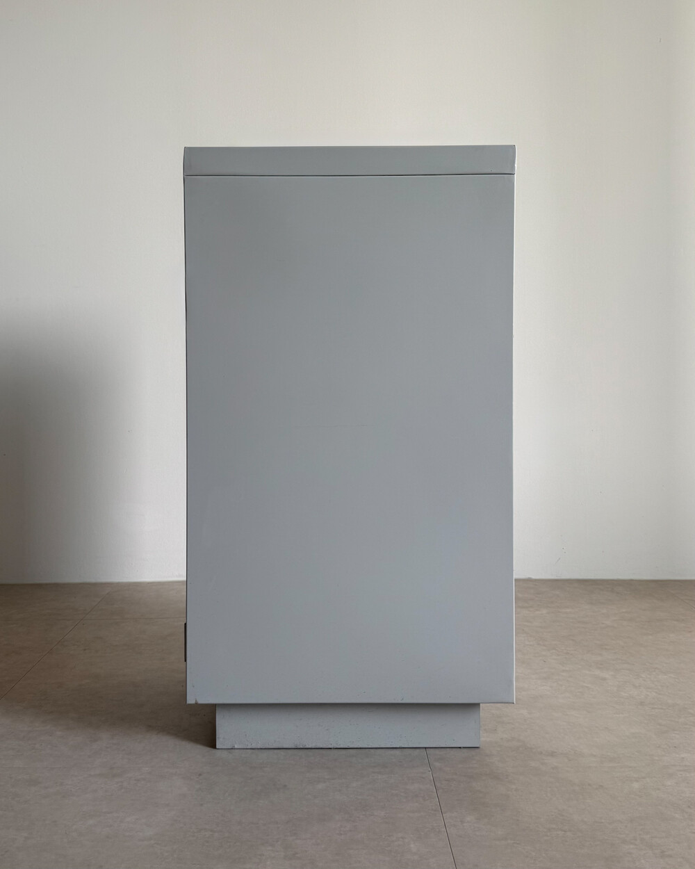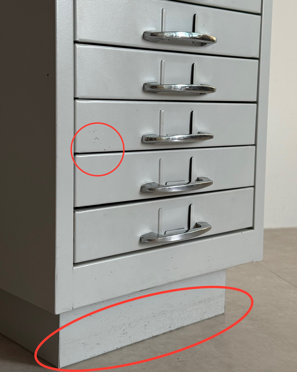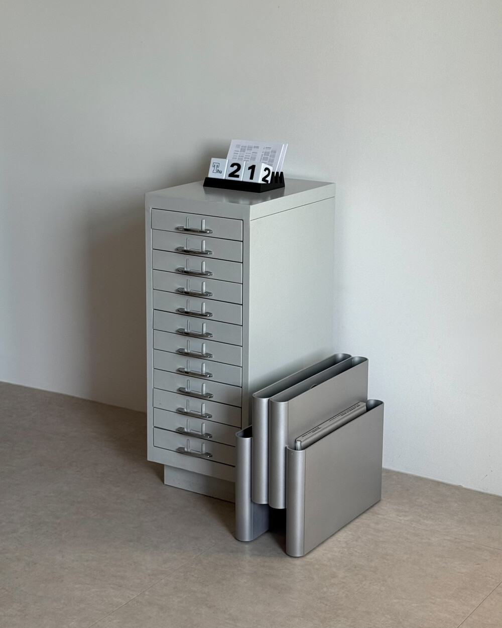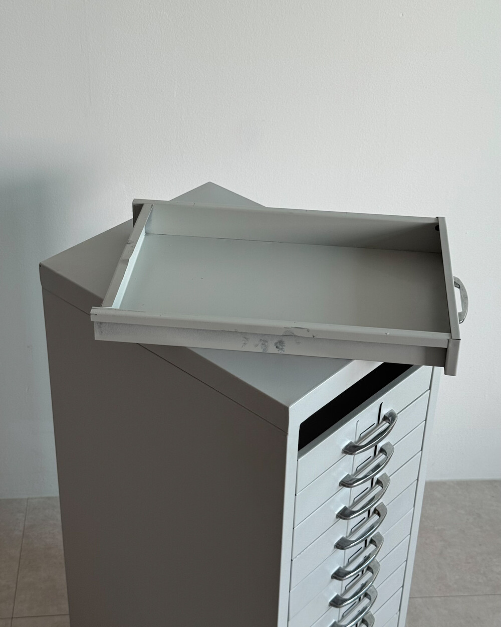 1980년대 네덜란드에서 제작된 빈티지 메탈 캐비닛입니다. 인더스트리얼 감성을 잘 보여주는 그레이 톤의 스틸 바디와 크롬 손잡이로 이루어져 있습니다. 11단의 안정적인 서랍 구조로 실용적으로 문서나 사무용 소품을 수납이 가능합니다.