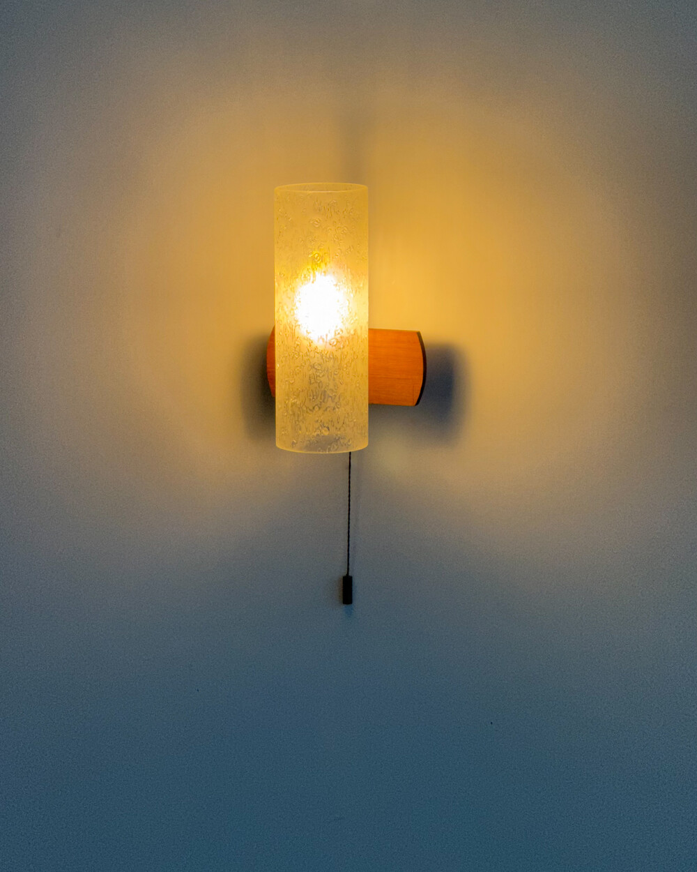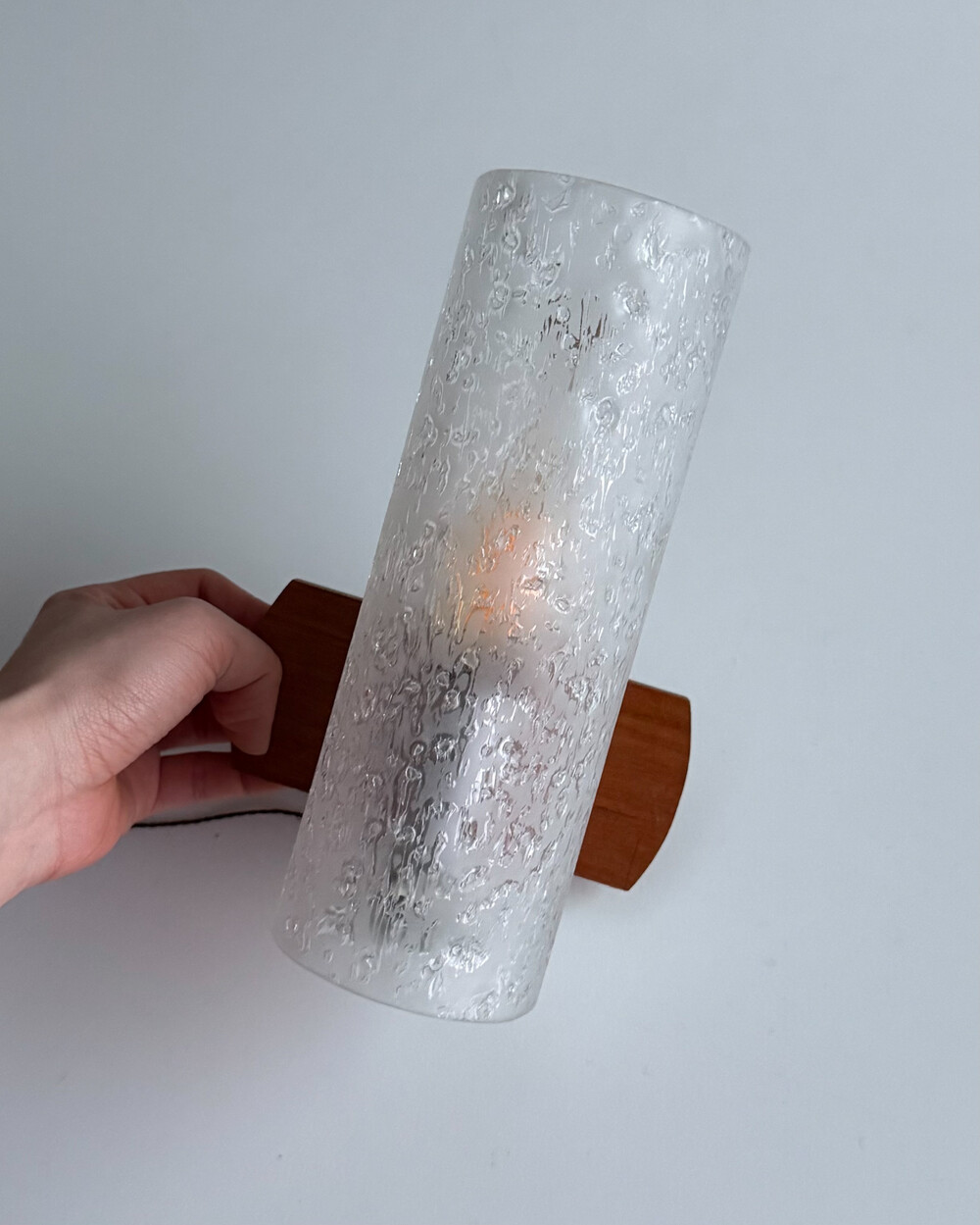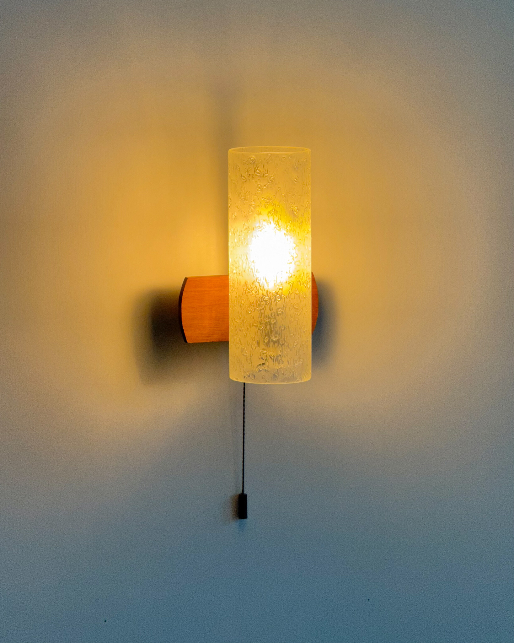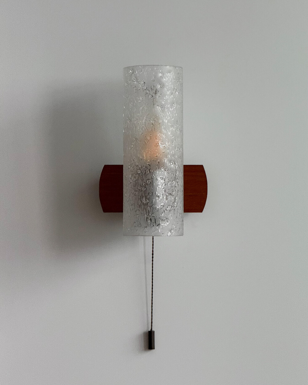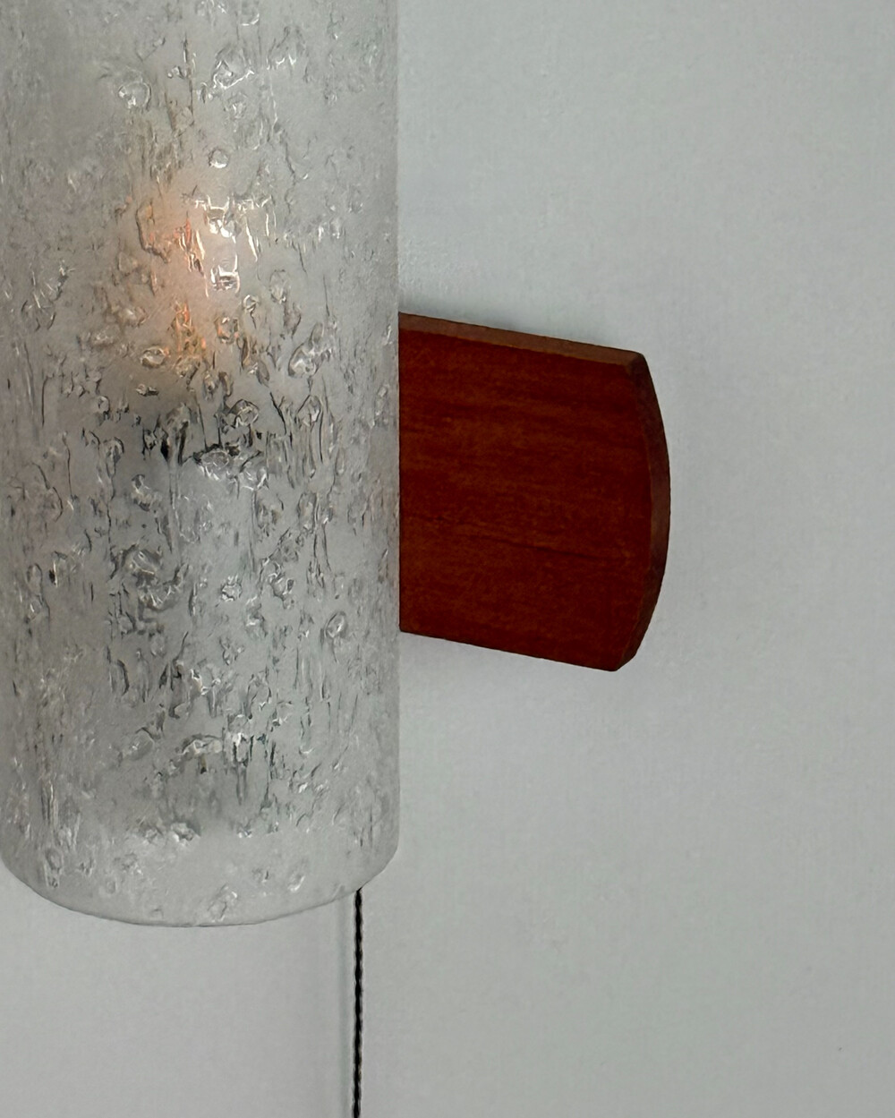 1970년대에 독일의 조명 브랜드 DORIA 사에서 제작된 빈티지 벽등입니다. 입체적인 질감이 살아있는 원통형 글라스 쉐이드와 티크 원목 베이스의 조화로 이루어져 있습니다. 조명을 켰을 때 빛이 굴절되며 벽면에 맺히는 은은한 실루엣이 공간의 분위기를 차분하게 완성합니다.