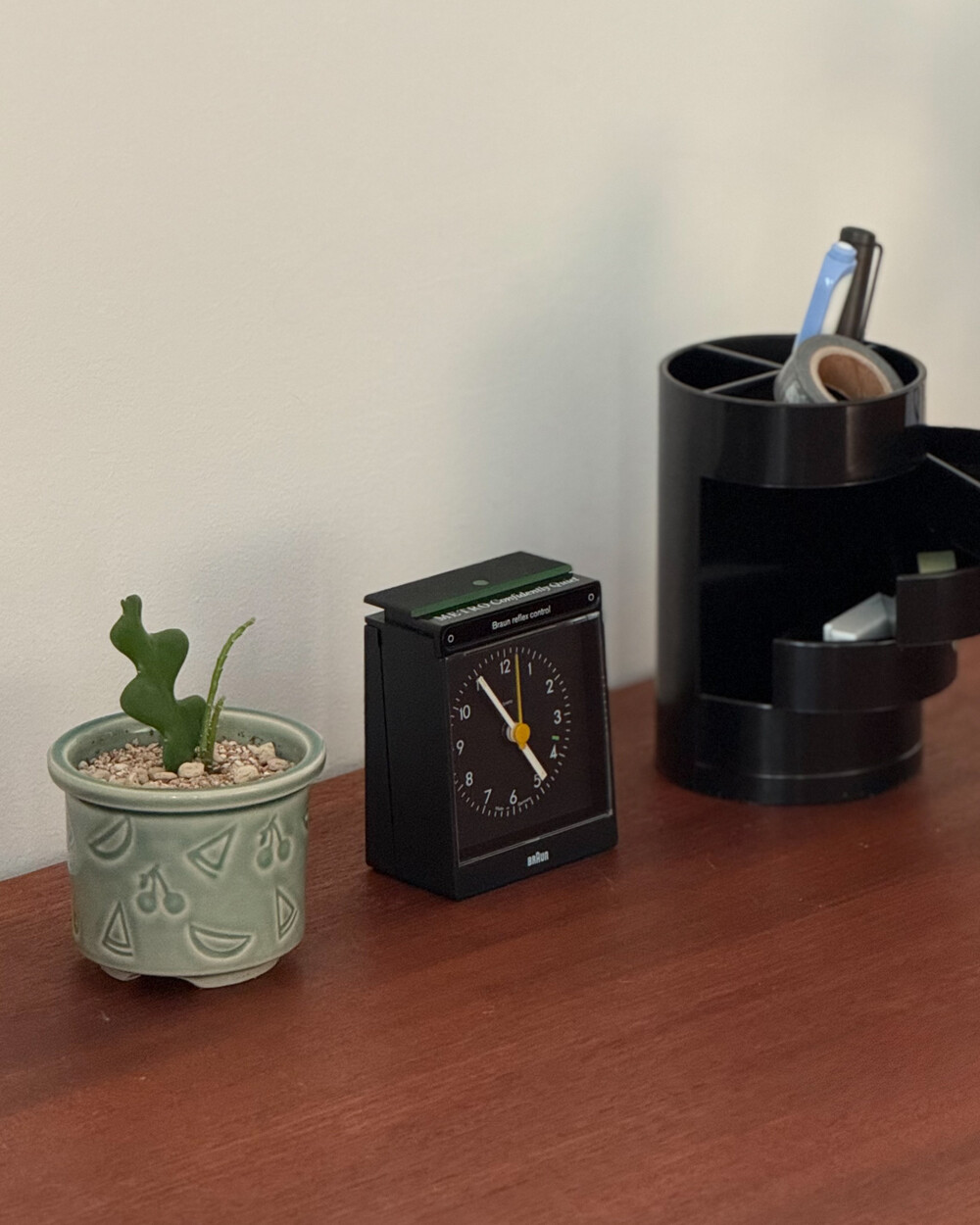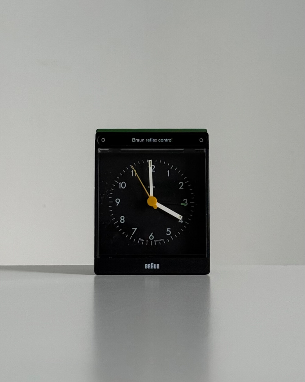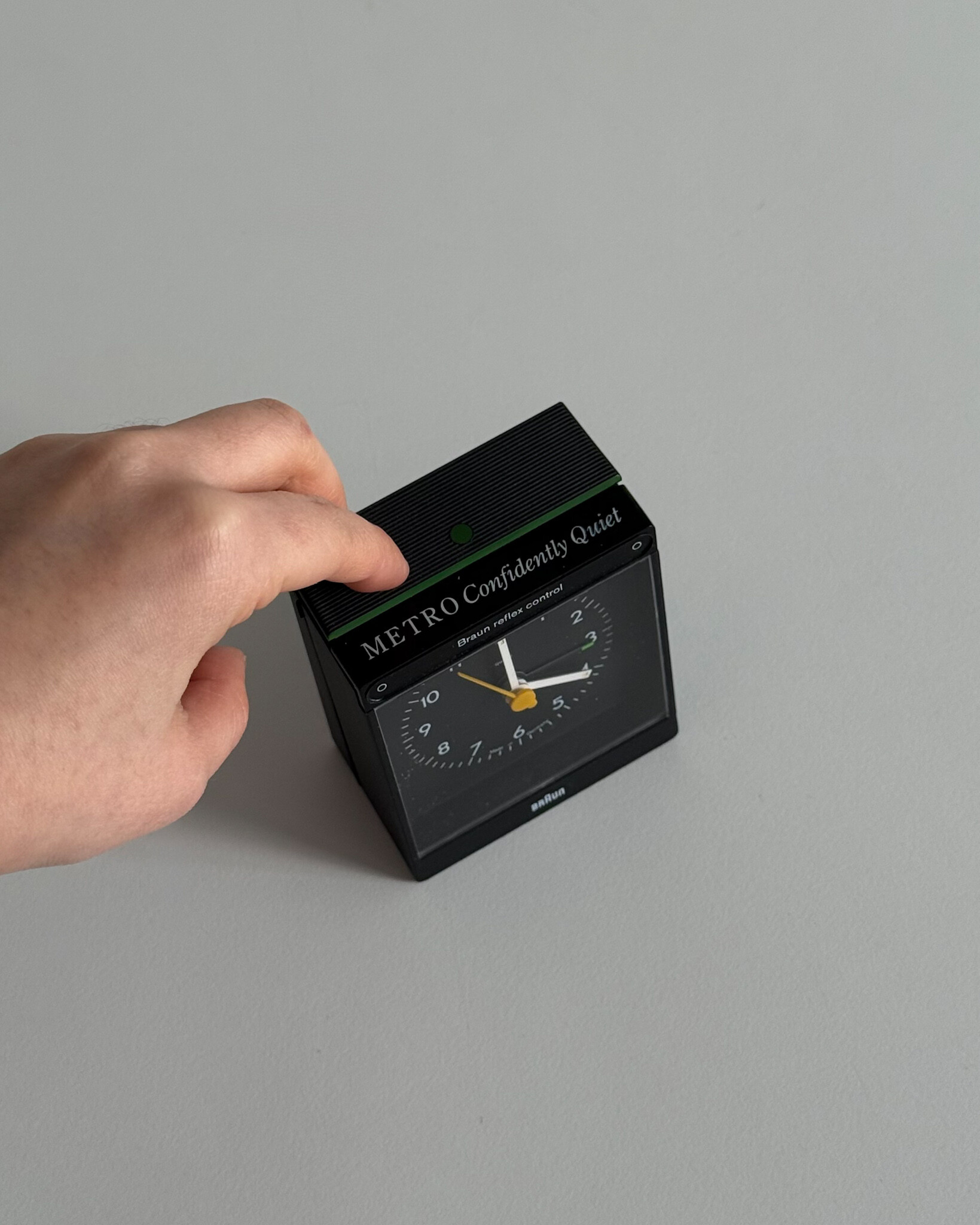 1980년대 후반 생산된 BRAUN 탁상시계 AB35 RS입니다. 1980년대 후반 생산된 BRAUN 탁상시계 AB35 RS입니다. 디터 람스가 구축한 디자인 철학이 안정적으로 자리 잡은 이후, 형태적 미니멀리즘을 유지하면서 사용자 경험 중심으로 기능이 발전하던 시기에 등장한 모델입니다. 모델명 RS는 'Reflex Control'과 'Silent' 기능을 의미하며, 알람이 울릴 때 시계 앞에 손을 가져가는 동작만으로 알람을 멈출 수 있는 비접촉 인터페이스와 저소음 설계를 갖춘 것이 특징입니다. 해당 제품은 영국 자동차 브랜드 Metro 프로모션을 통해 제공되었던 패키지 구성으로, 오리지널 박스가 함께 보존되었습니다.