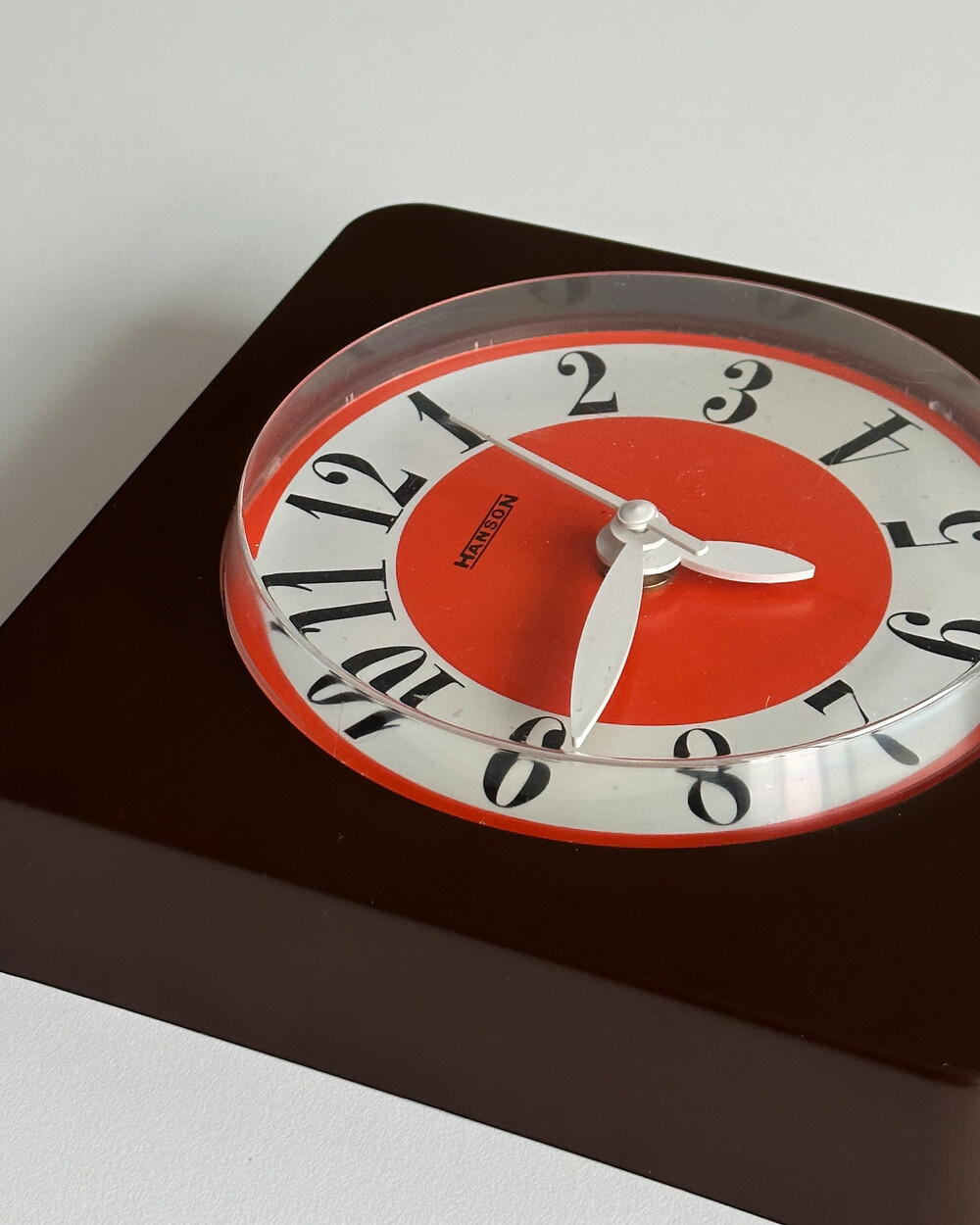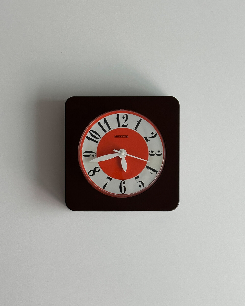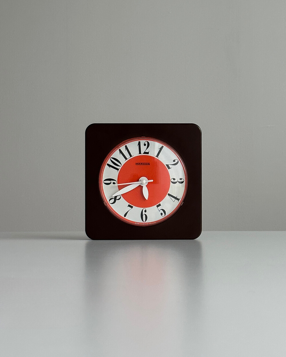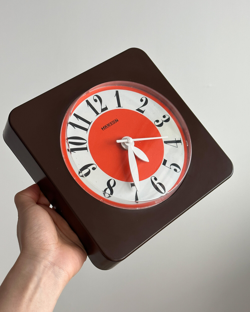 70년도 생산되었던 HANSON사의 빈티지 벽시계입니다. HANSON 사는 1888년 설립된 긴 역사를 자랑하는 아일랜드의 주방용품 브랜드입니다. 두툼한 직각 쉐입으로 이루어져 있으며, 오렌지-브라운 컬러 조화와 곡선 타이포그래피가 돋보이는 유니크한 디자인입니다.