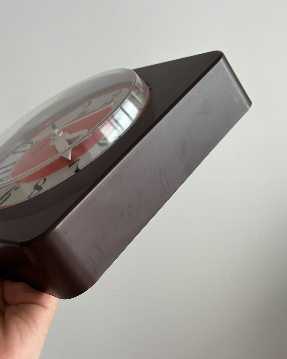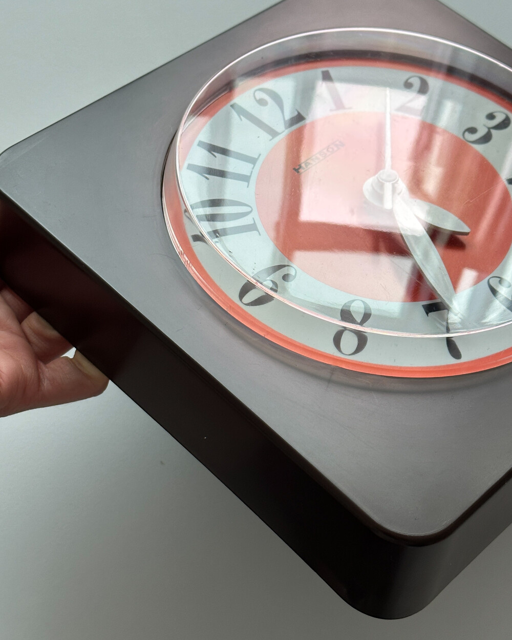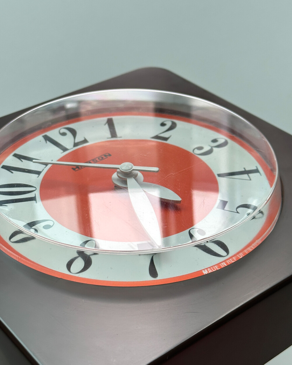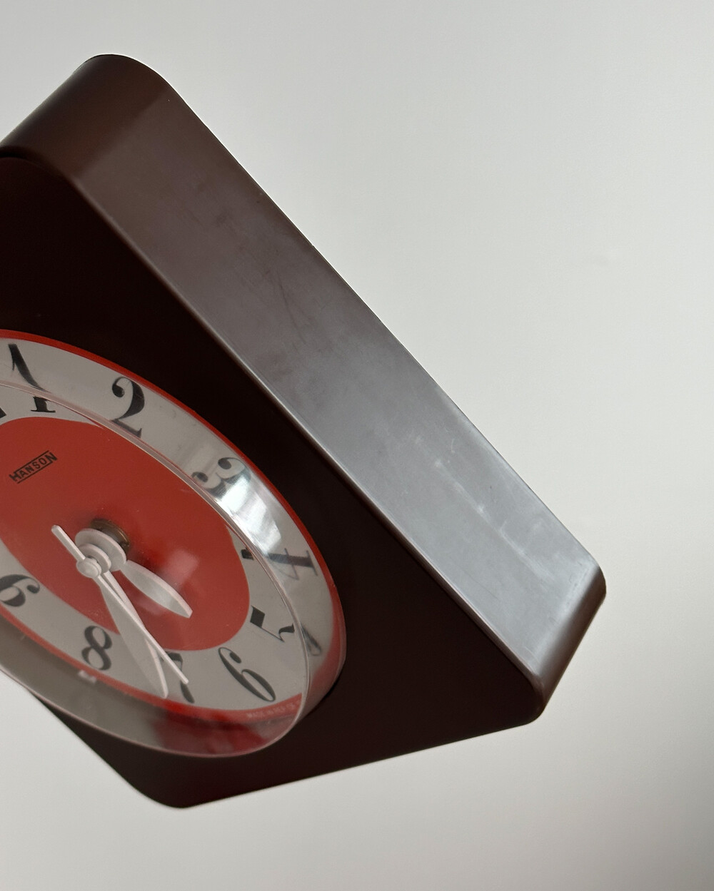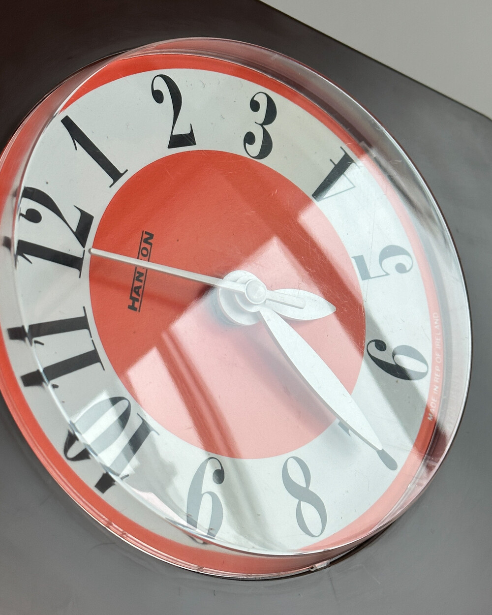 70년도 생산되었던 HANSON사의 빈티지 벽시계입니다. HANSON 사는 1888년 설립된 긴 역사를 자랑하는 아일랜드의 주방용품 브랜드입니다. 두툼한 직각 쉐입으로 이루어져 있으며, 오렌지-브라운 컬러 조화와 곡선 타이포그래피가 돋보이는 유니크한 디자인입니다.