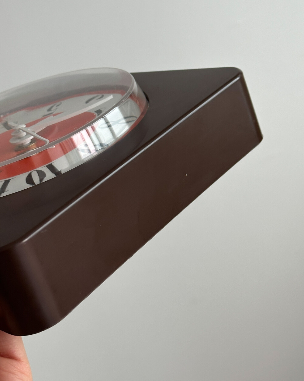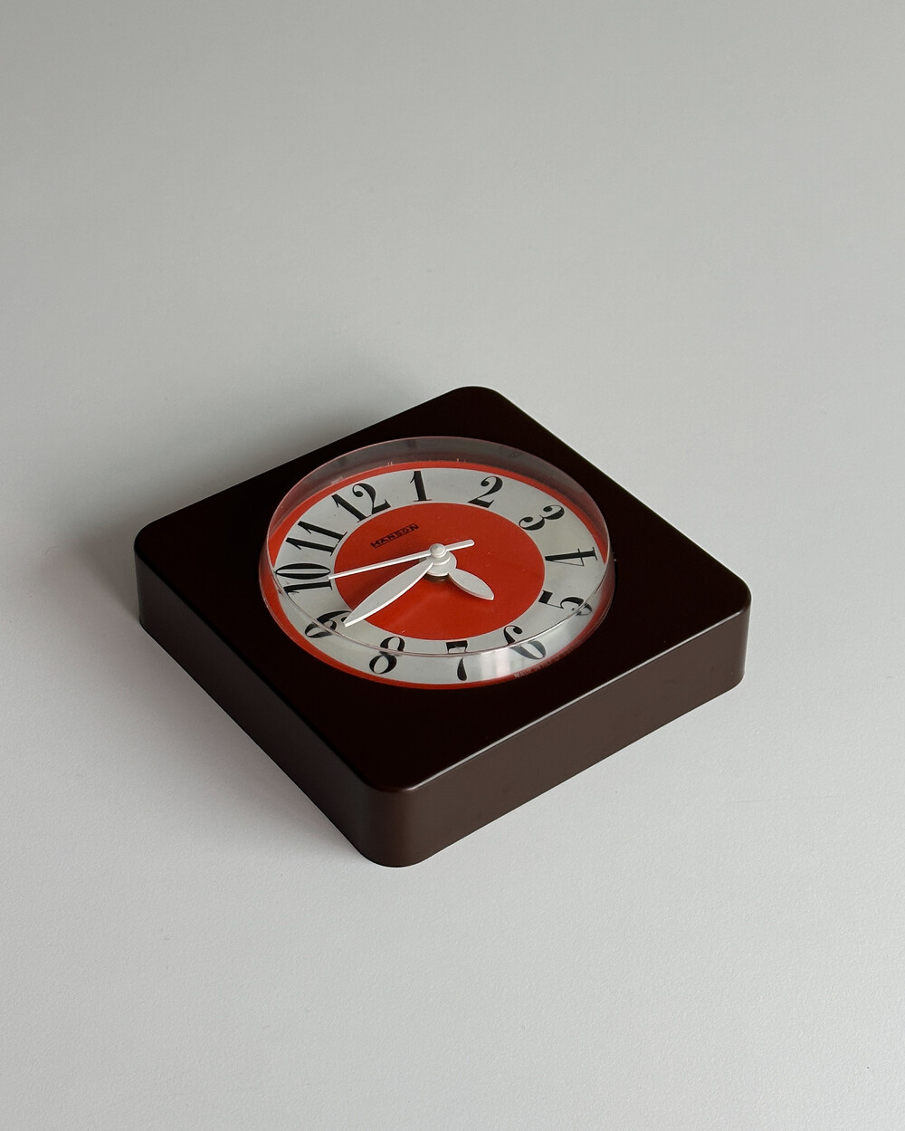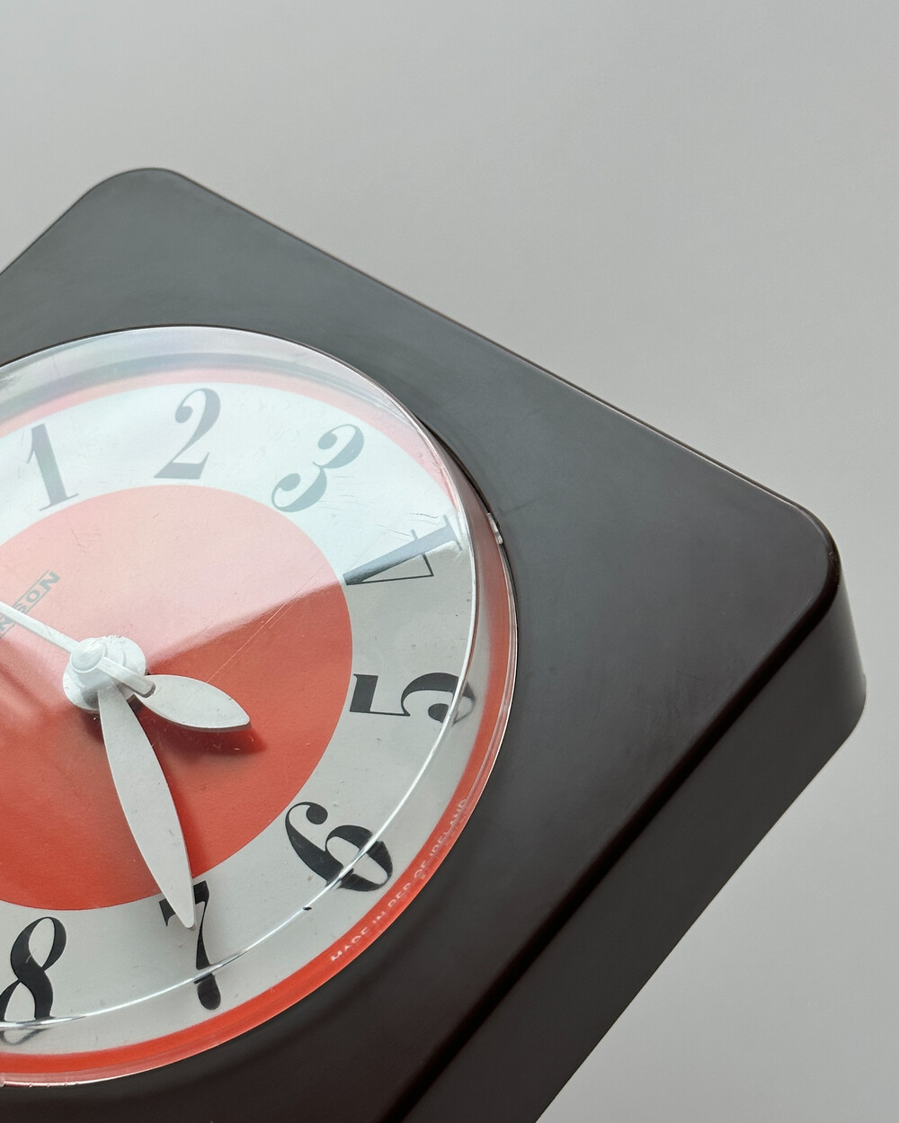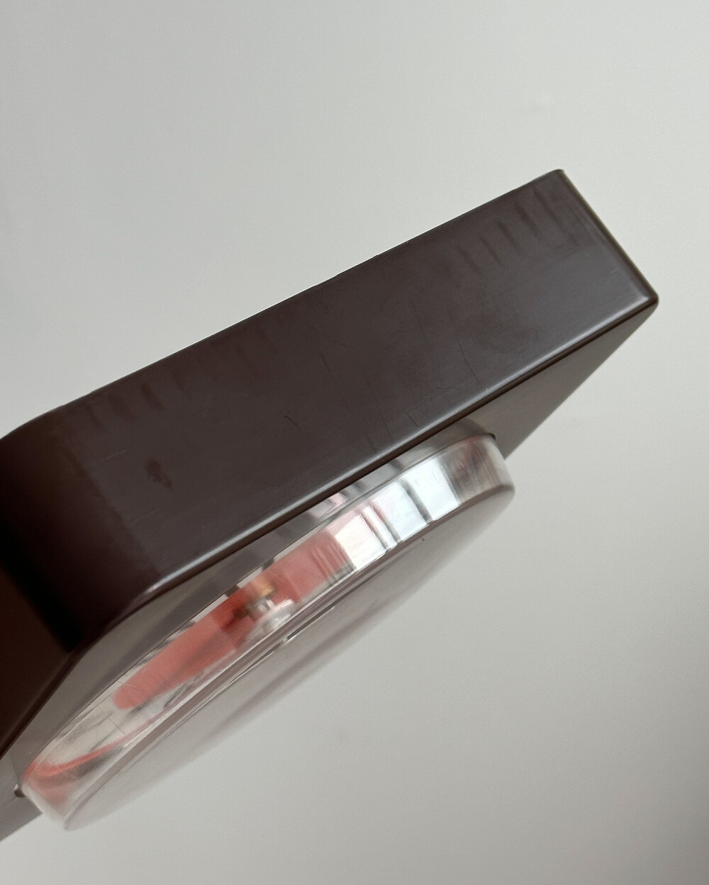 70년도 생산되었던 HANSON사의 빈티지 벽시계입니다. HANSON 사는 1888년 설립된 긴 역사를 자랑하는 아일랜드의 주방용품 브랜드입니다. 두툼한 직각 쉐입으로 이루어져 있으며, 오렌지-브라운 컬러 조화와 곡선 타이포그래피가 돋보이는 유니크한 디자인입니다.