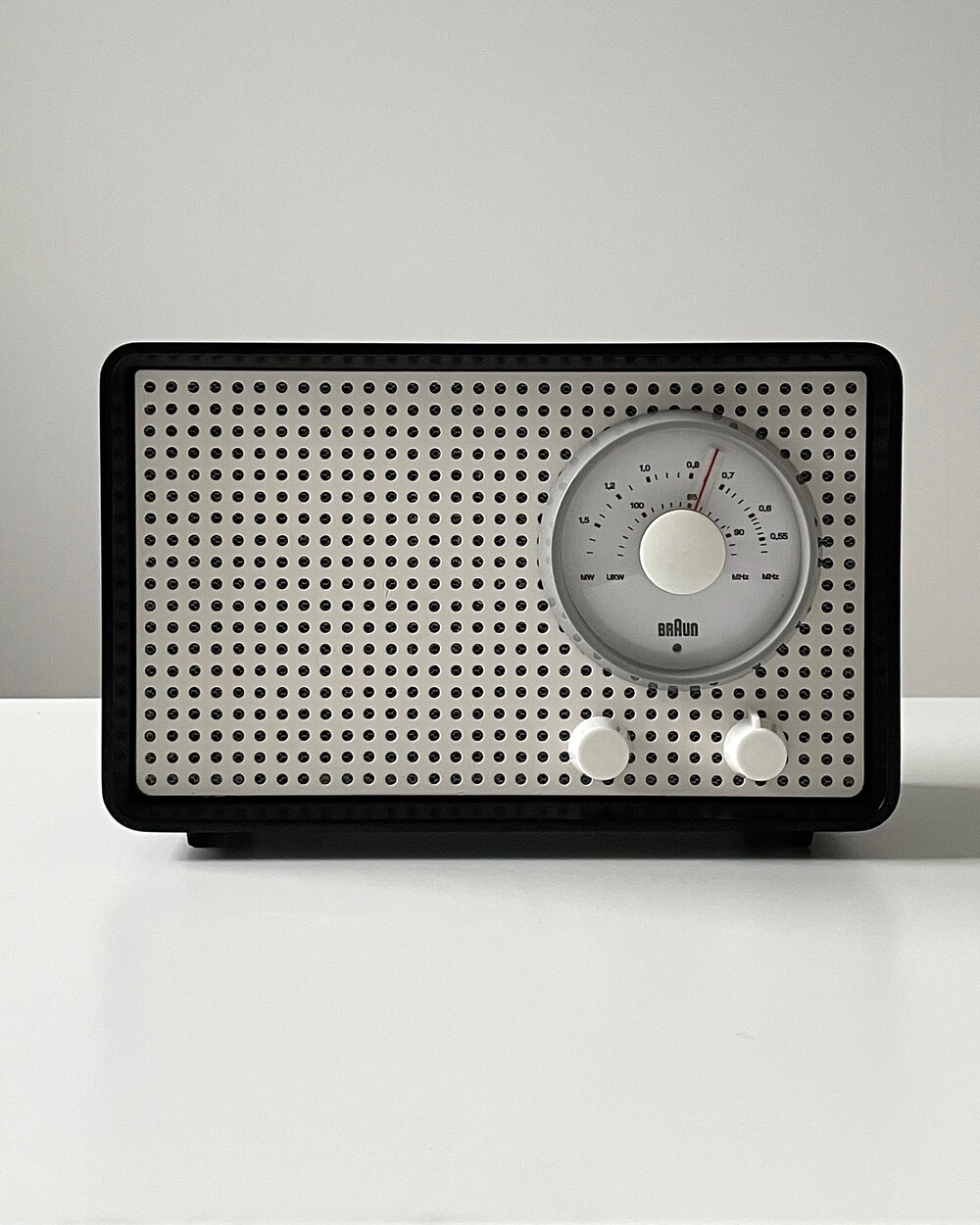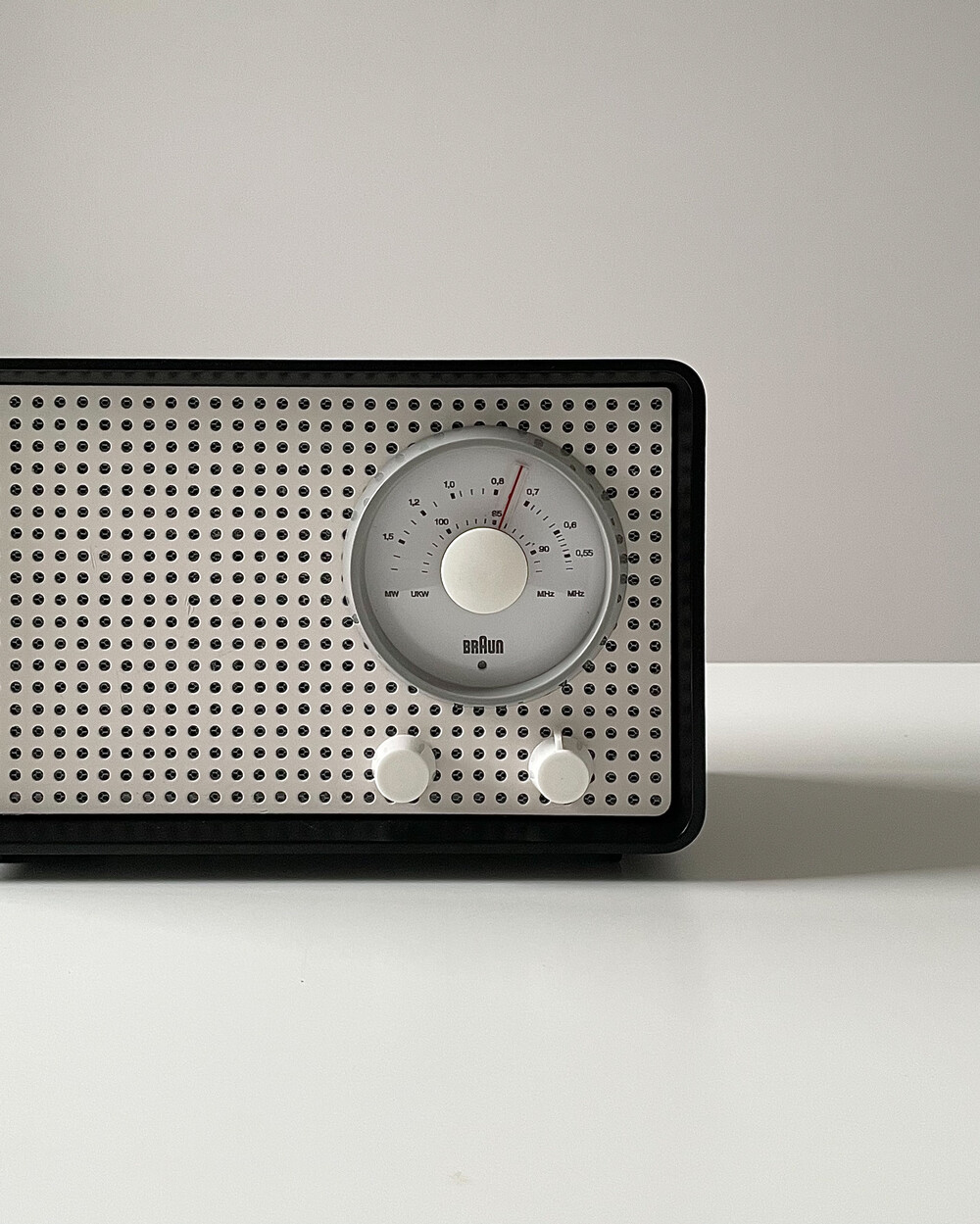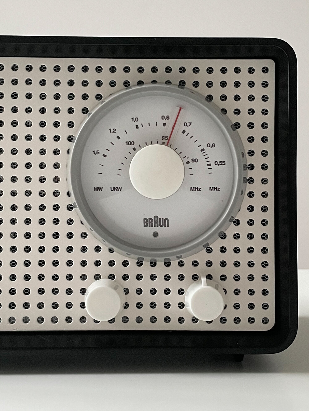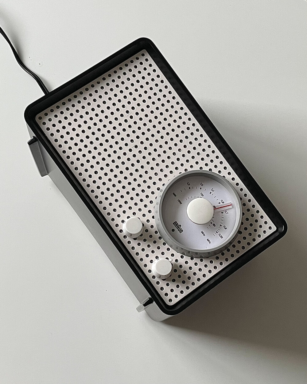 FM 전용 라디오로, 눈금의 빨간색 포인트로 채널을 표시합니다. BRAUN 로고가 크게 있고 반쯤 래커 처리되어 있습니다. 2개의 노브는 모두 표시되지 않습니다.