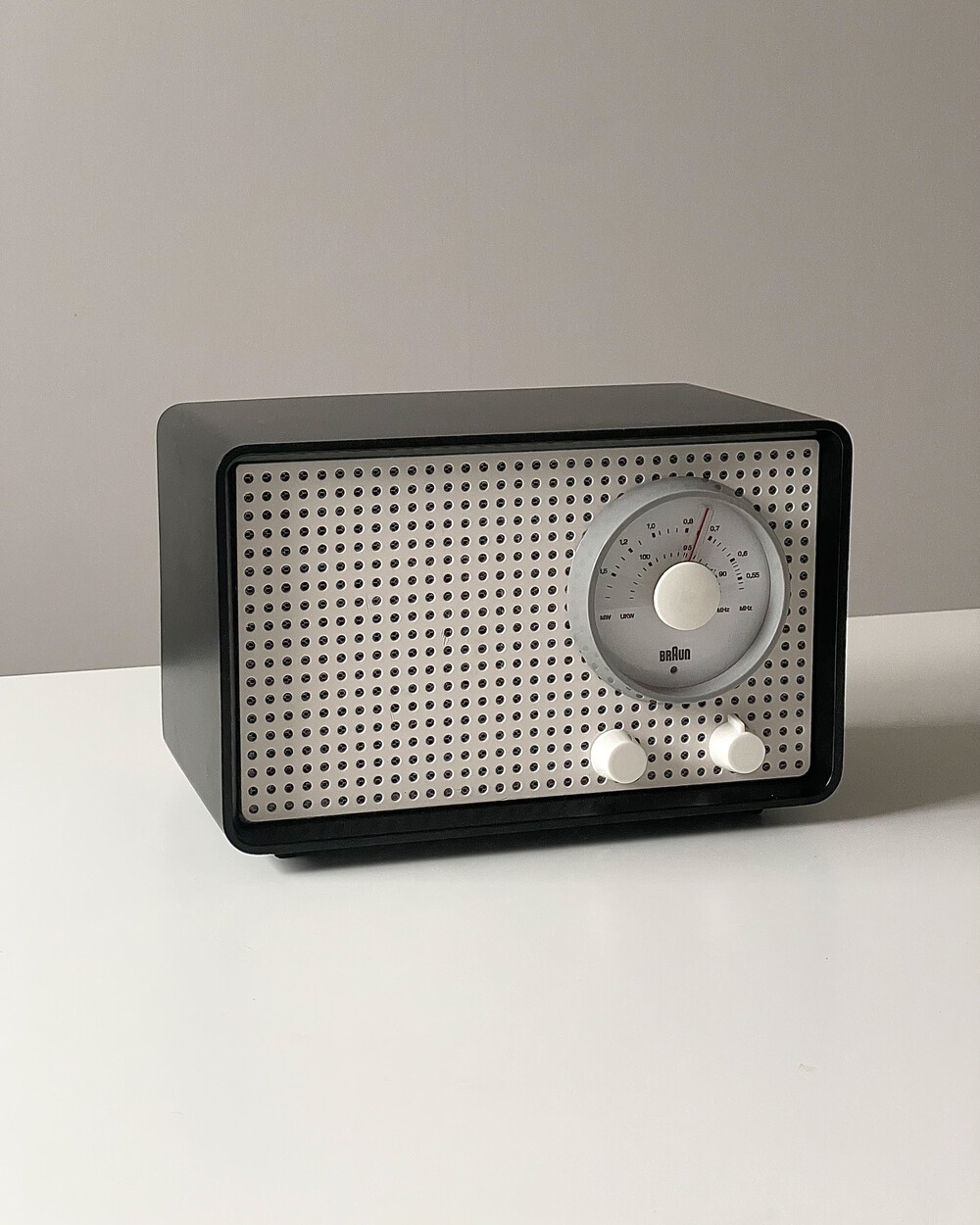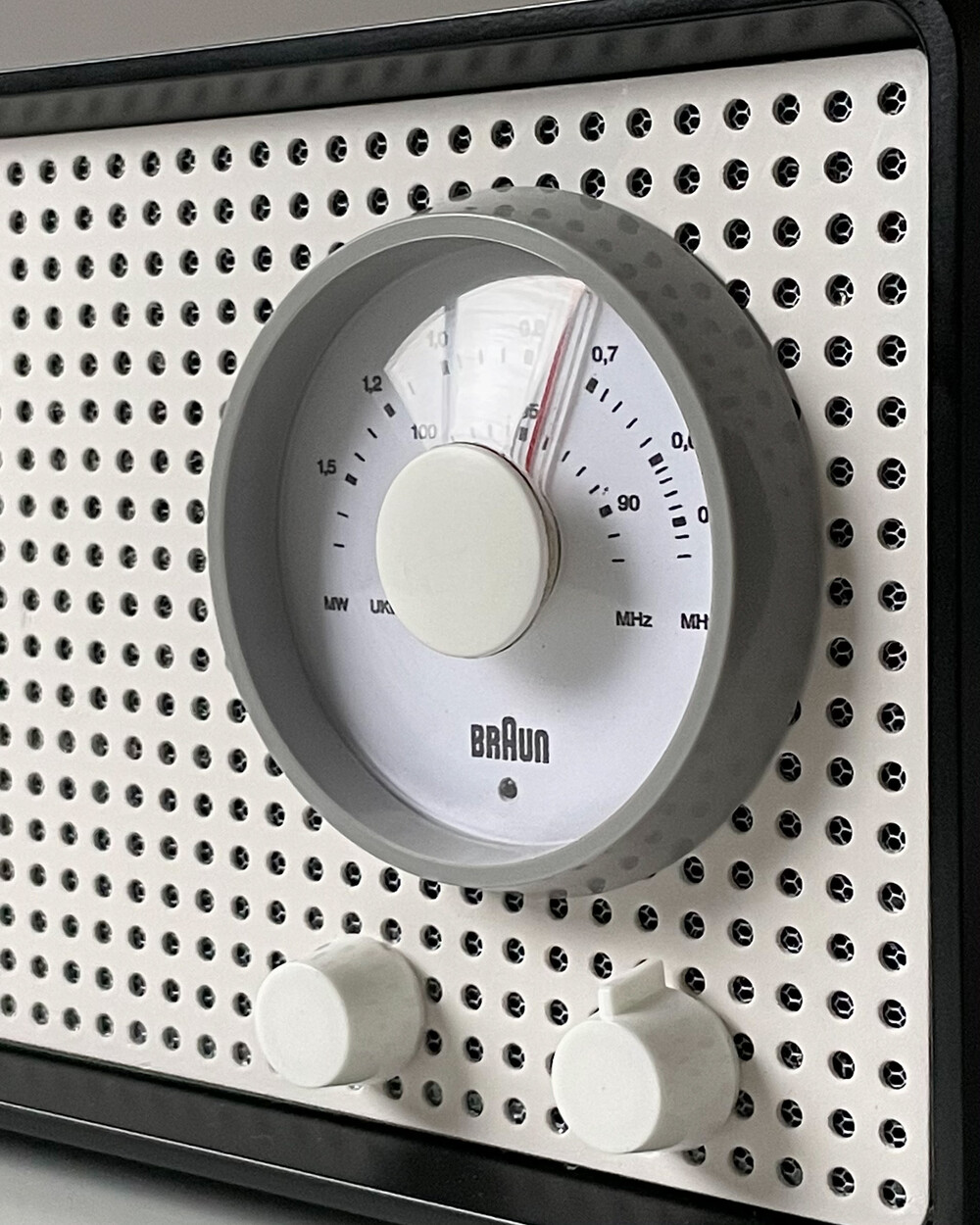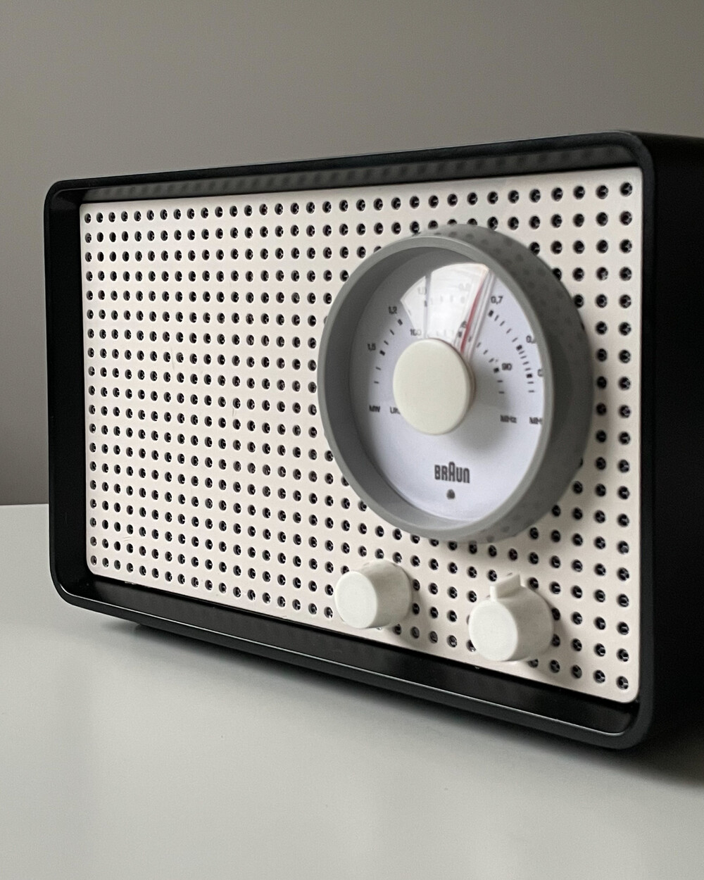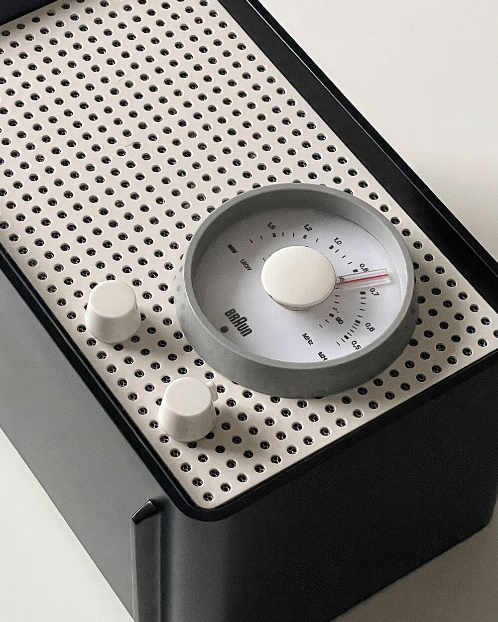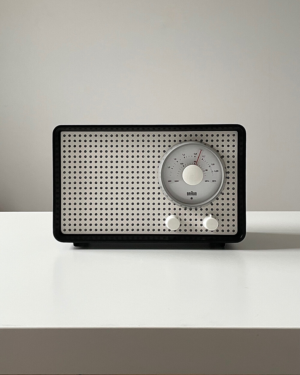 FM 전용 라디오로, 눈금의 빨간색 포인트로 채널을 표시합니다. BRAUN 로고가 크게 있고 반쯤 래커 처리되어 있습니다. 2개의 노브는 모두 표시되지 않습니다.