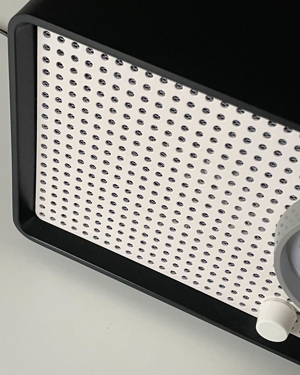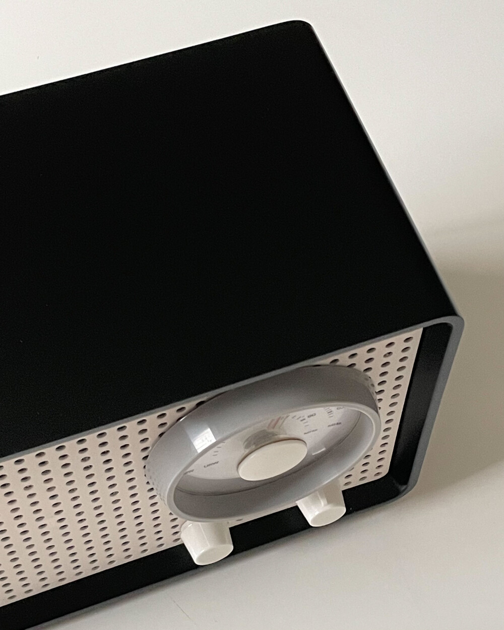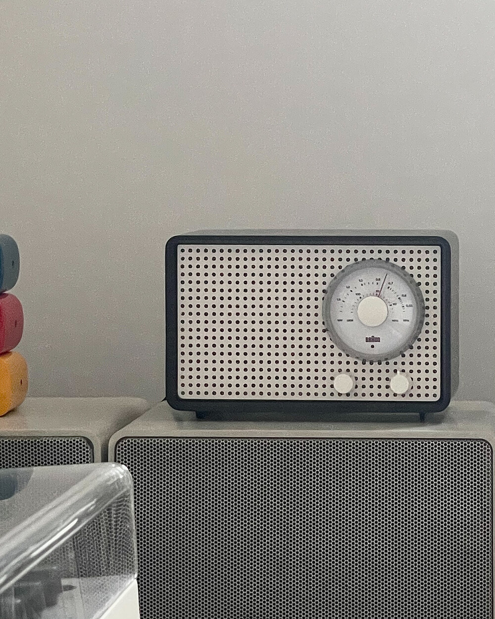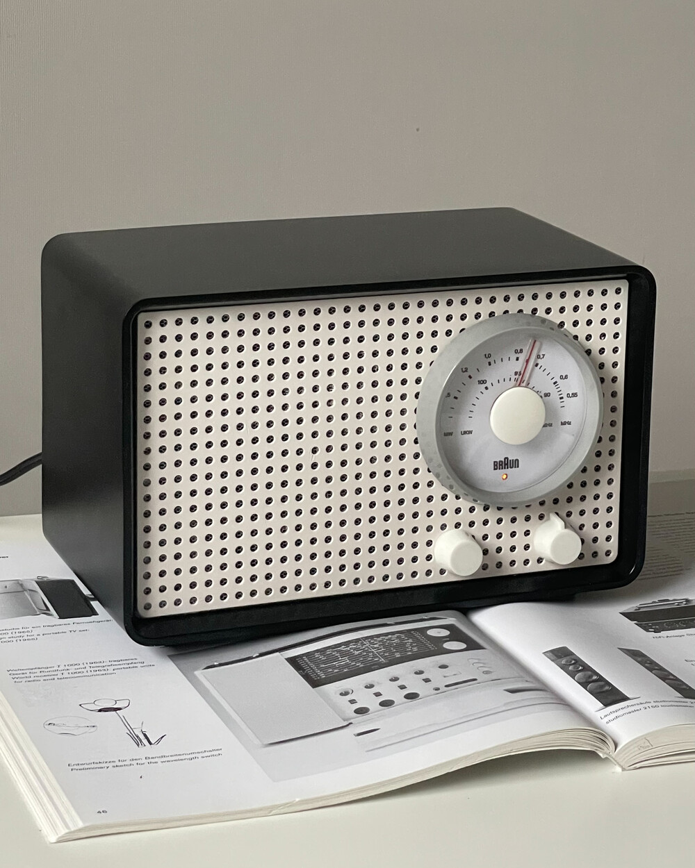FM 전용 라디오로, 눈금의 빨간색 포인트로 채널을 표시합니다. BRAUN 로고가 크게 있고 반쯤 래커 처리되어 있습니다. 2개의 노브는 모두 표시되지 않습니다.