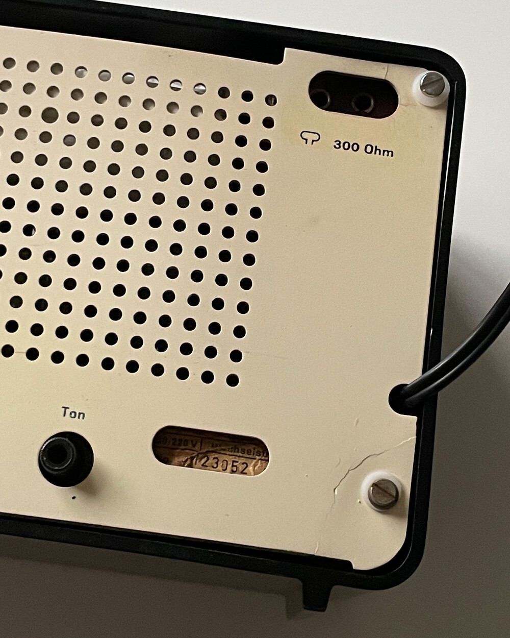 기어로 구동되는 빨간색의 선이 있는 눈금 표시기로 원하시는 채널을 선택할 수 있습니다. 눈금판은 화이트 바탕으로 되어있으며, BRAUN 로고가 비교적 작게 표시되어 있습니다. BRAUN 로고 아래에 작동 표시등 역할을 하는 작은 조명 점이 보입니다. 전면 베이클라이트와 후면 플라스틱 컨트롤 및 판지 재질로 구성되었습니다.