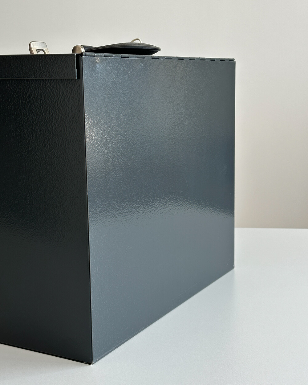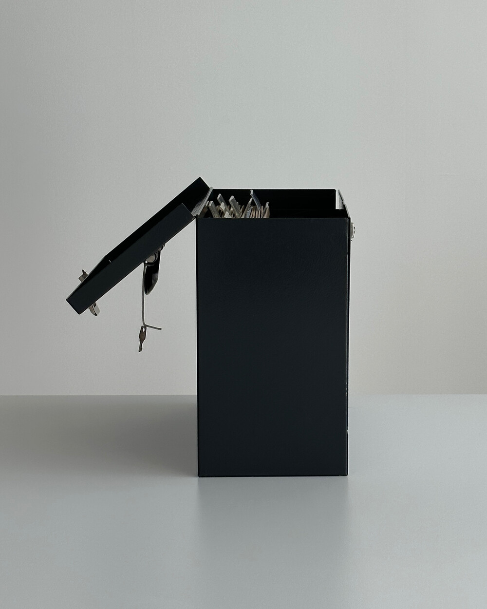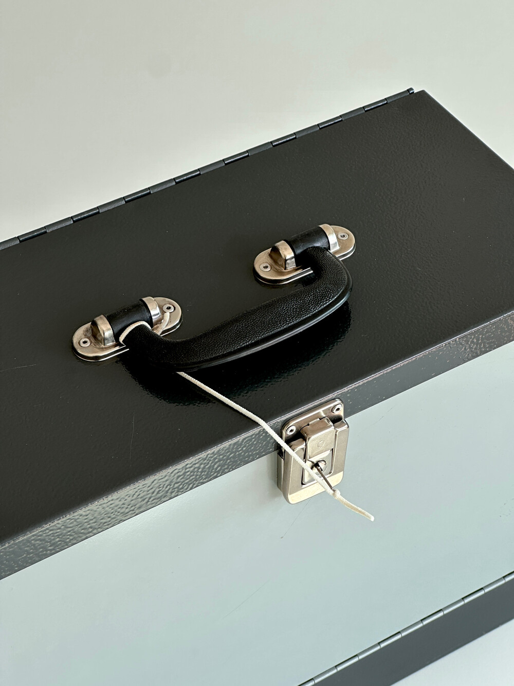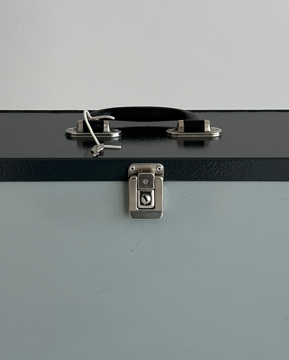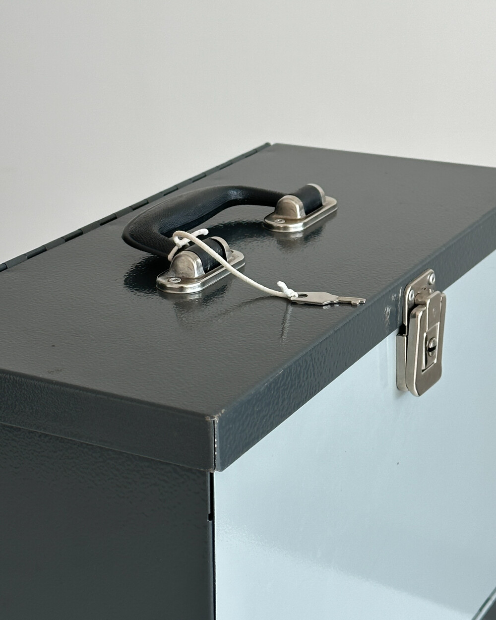 70년도 독일에서 생산되었던 오피스 파일 박스입니다. 그레이 컬러의 묵직한 메탈 소재로 이루어져 있습니다. A4 사이즈의 서류들을 넉넉히 수납할 수 있습니다. 별도의 잠금 장치가 있어 내용물을 안전하게 보관할 수 있습니다.