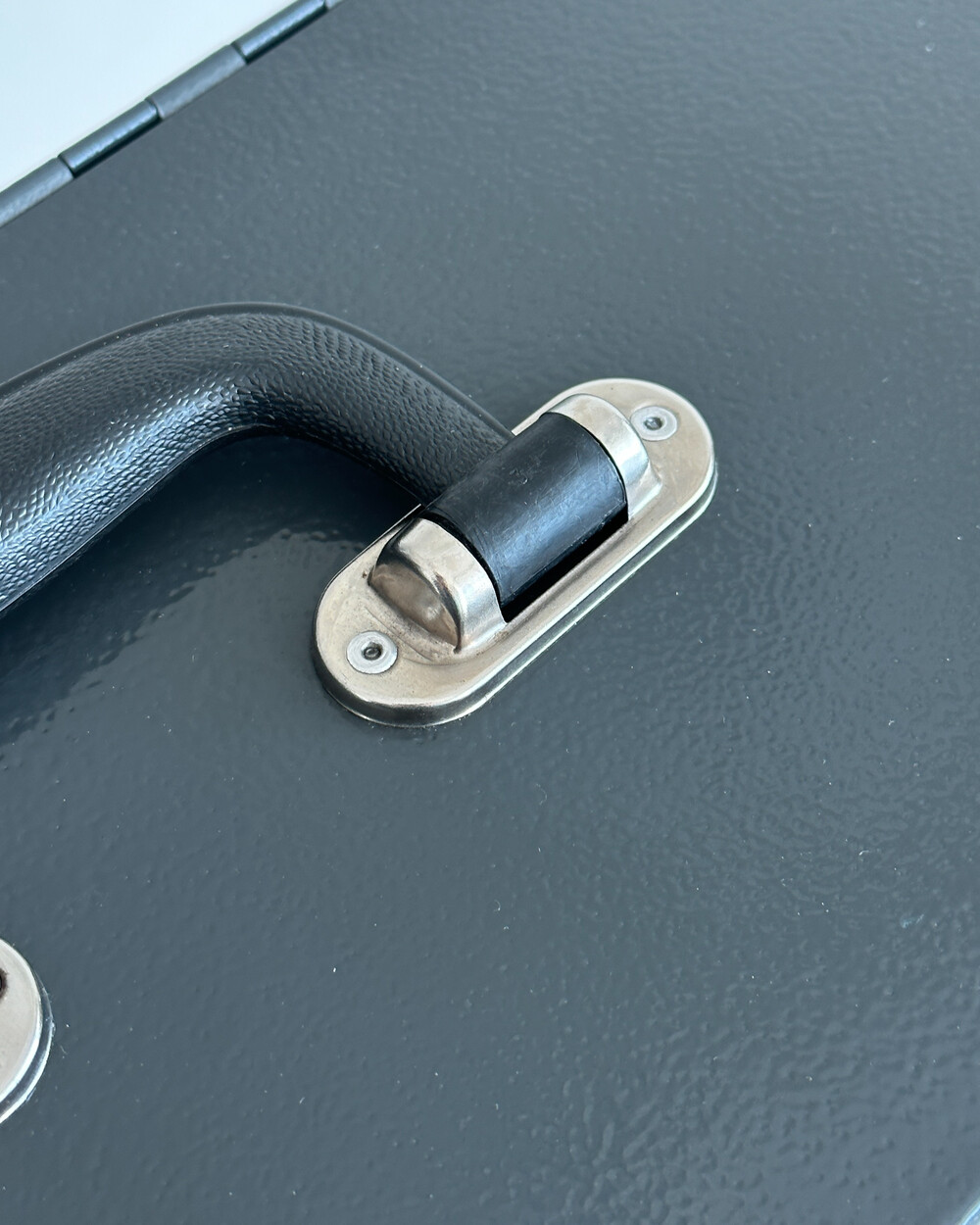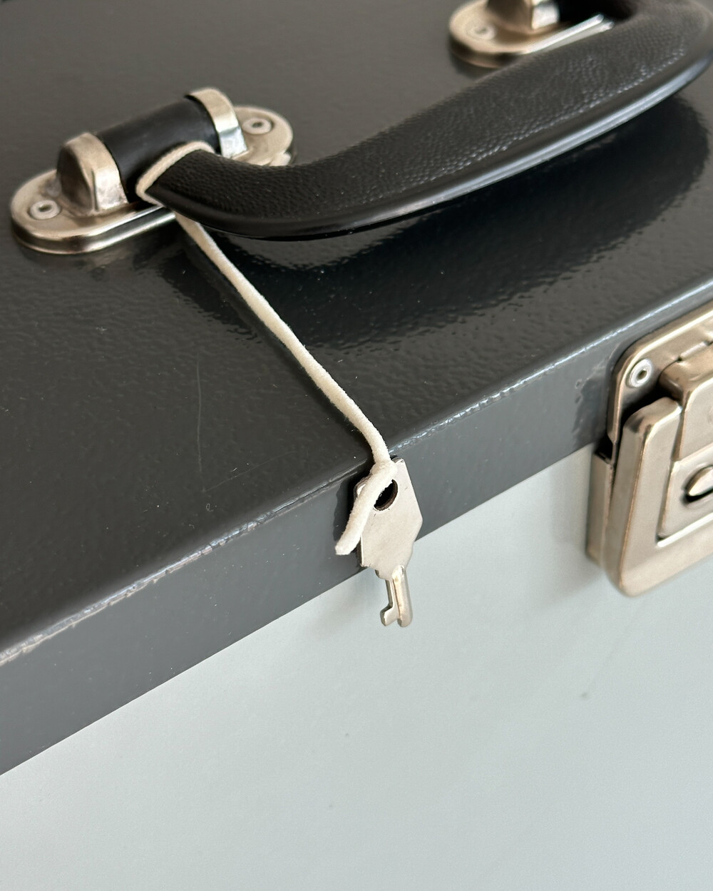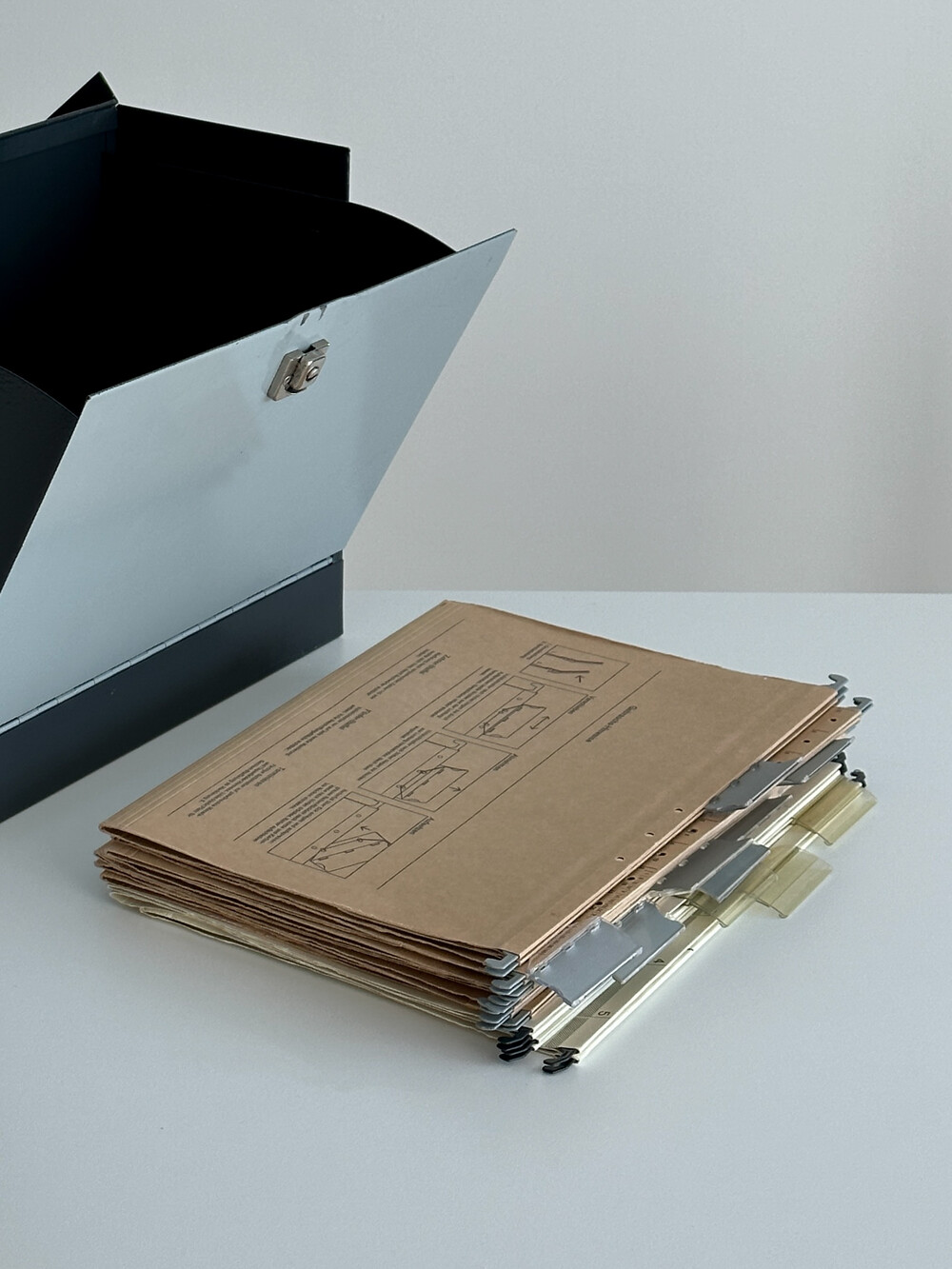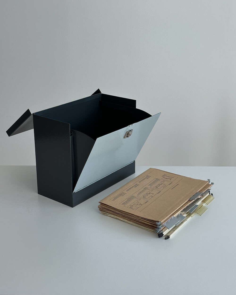 70년도 독일에서 생산되었던 오피스 파일 박스입니다. 그레이 컬러의 묵직한 메탈 소재로 이루어져 있습니다. A4 사이즈의 서류들을 넉넉히 수납할 수 있습니다. 별도의 잠금 장치가 있어 내용물을 안전하게 보관할 수 있습니다.