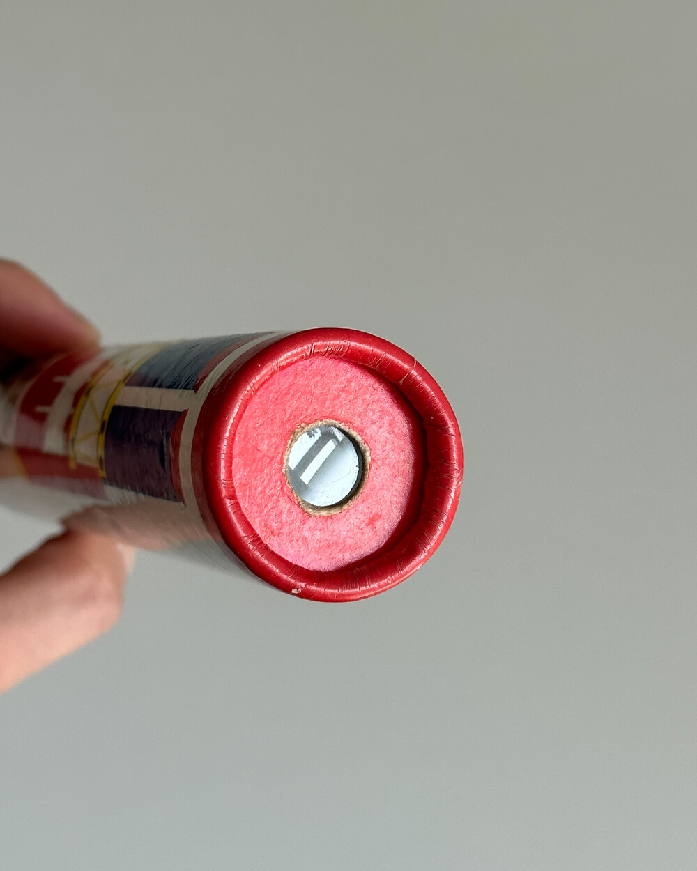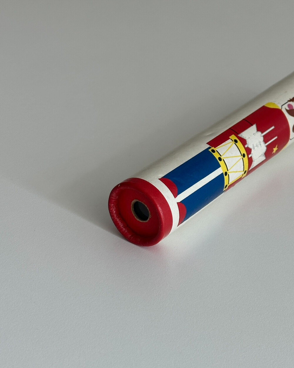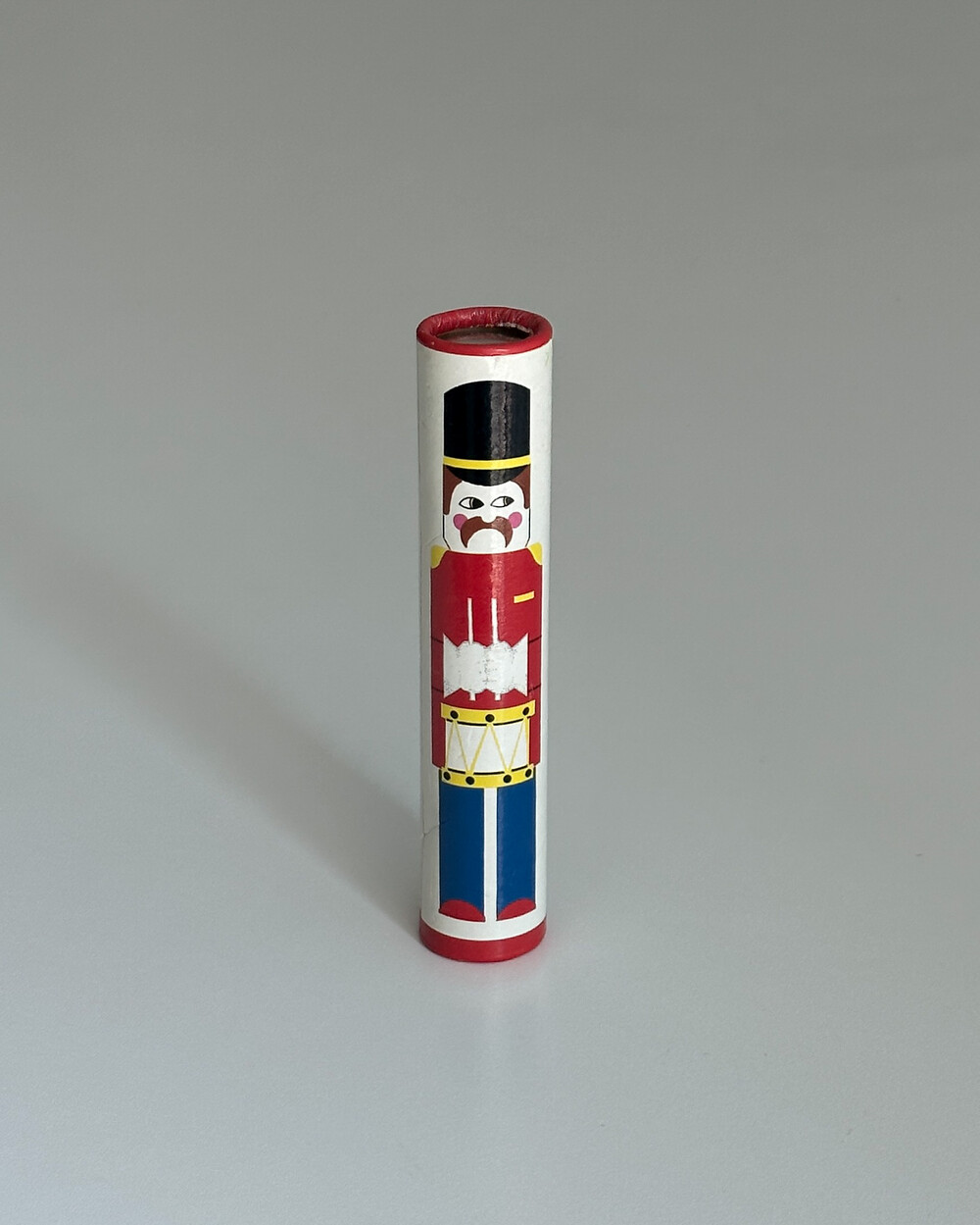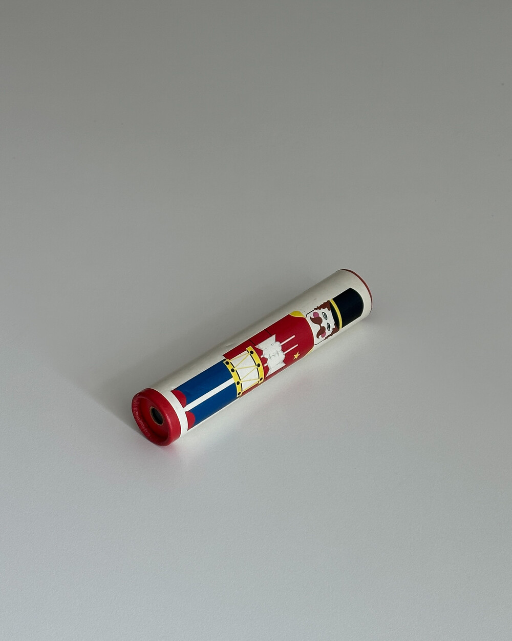 70년도 네덜란드에서 생산되었던 빈티지 만화경 토이입니다. 단단한 종이 소재의 원통형 바디에 병정 드러머 일러스트가 그려져 있습니다. 양 끝의 홀을 통해 원통을 돌리며 내부의 조각 패턴을 관찰하는 제품입니다.