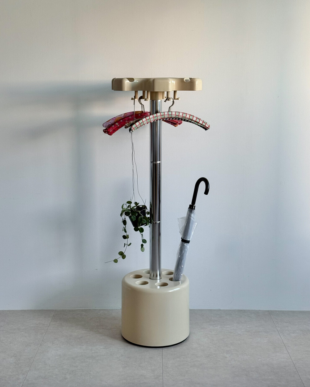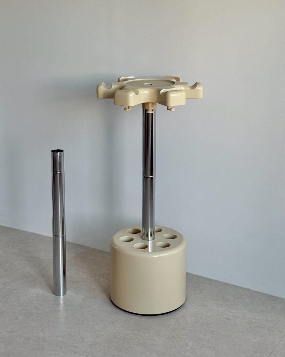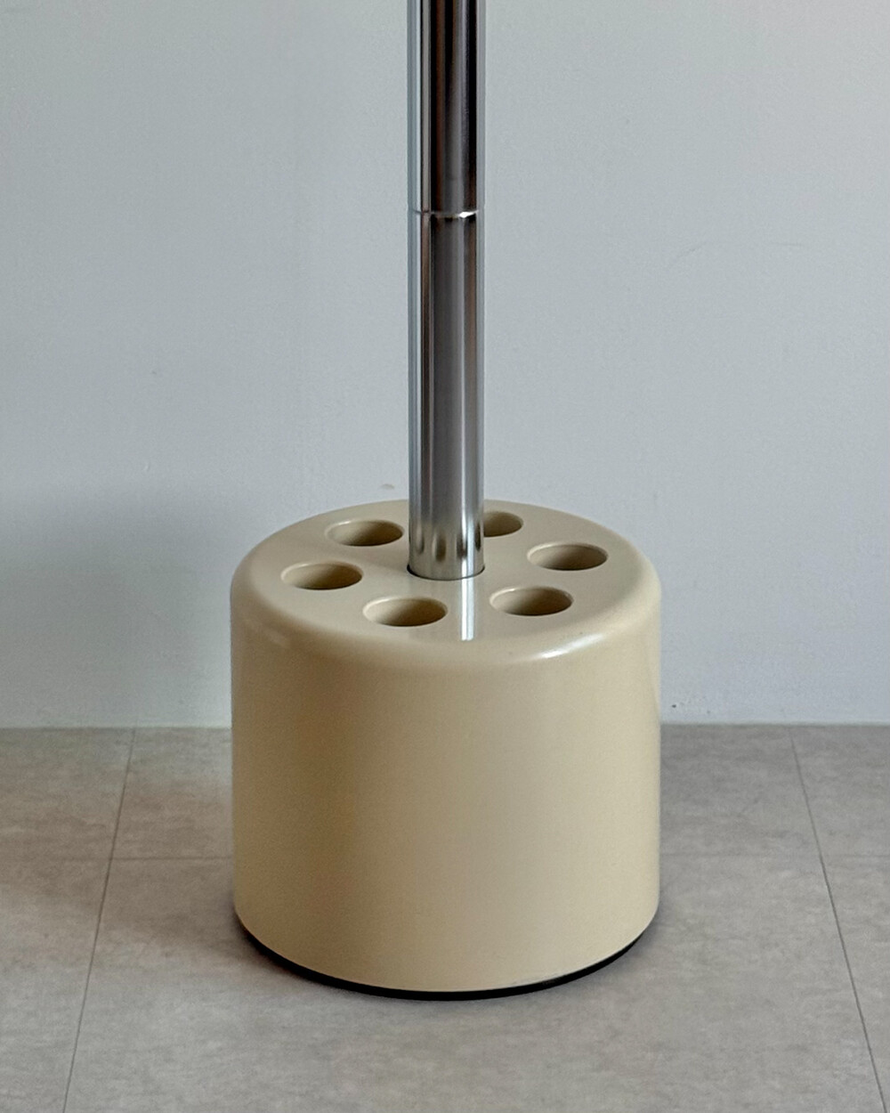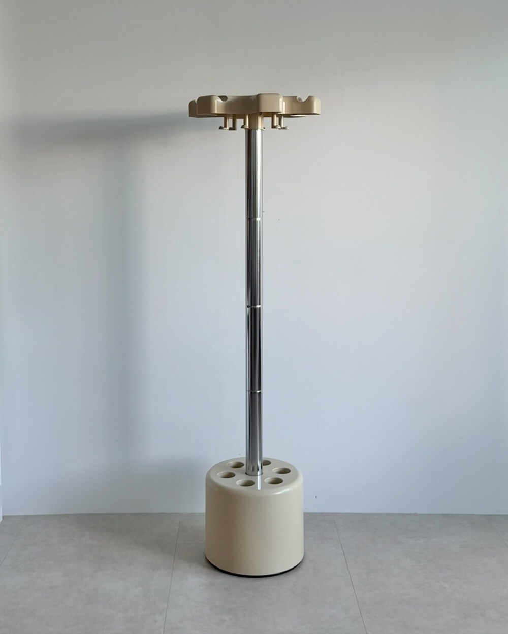 1970년대 이탈리아 Velca 사에서 제작된 코트/우산 스탠드입니다. 이탈리아의 산업디자이너 Roberto Lucci & Paolo Orlandini에 의해 디자인되었습니다. 상단은 옷걸이로 활용할 수 있으며, 하단 원통형 베이스는 원형 홀이 있어 우산이나 소품을 수납할 수 있습니다. 기둥이 분리식 모듈로 설계되어 있어 원하는 높이로 조절이 가능합니다. 당시 이탈리아 스페이스에이지의 유니크한 디자인이 잘 나타나는 제품으로 공간에서 독특한 존재감을 부여합니다.