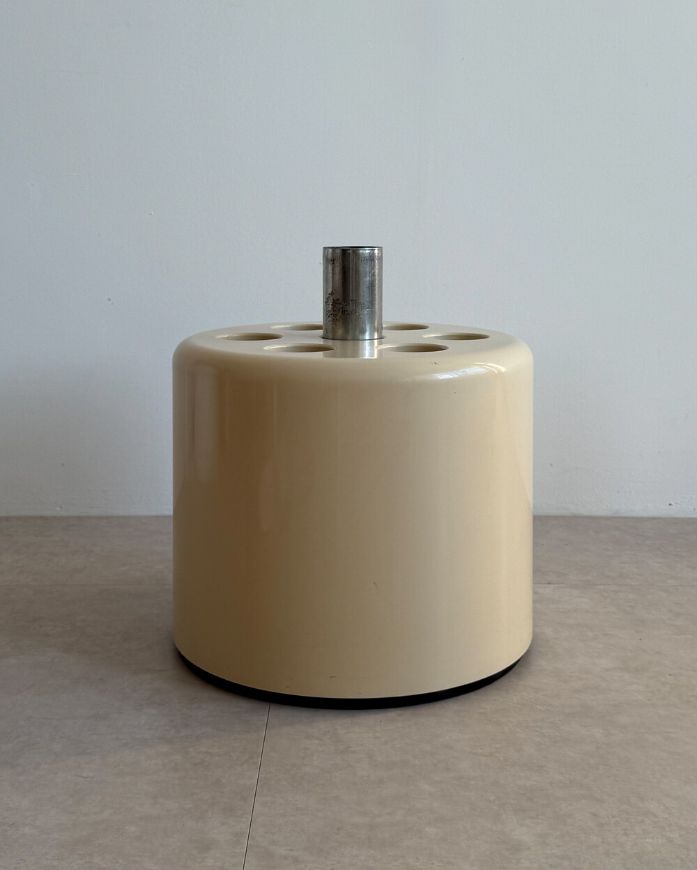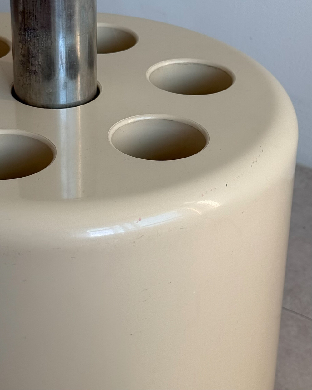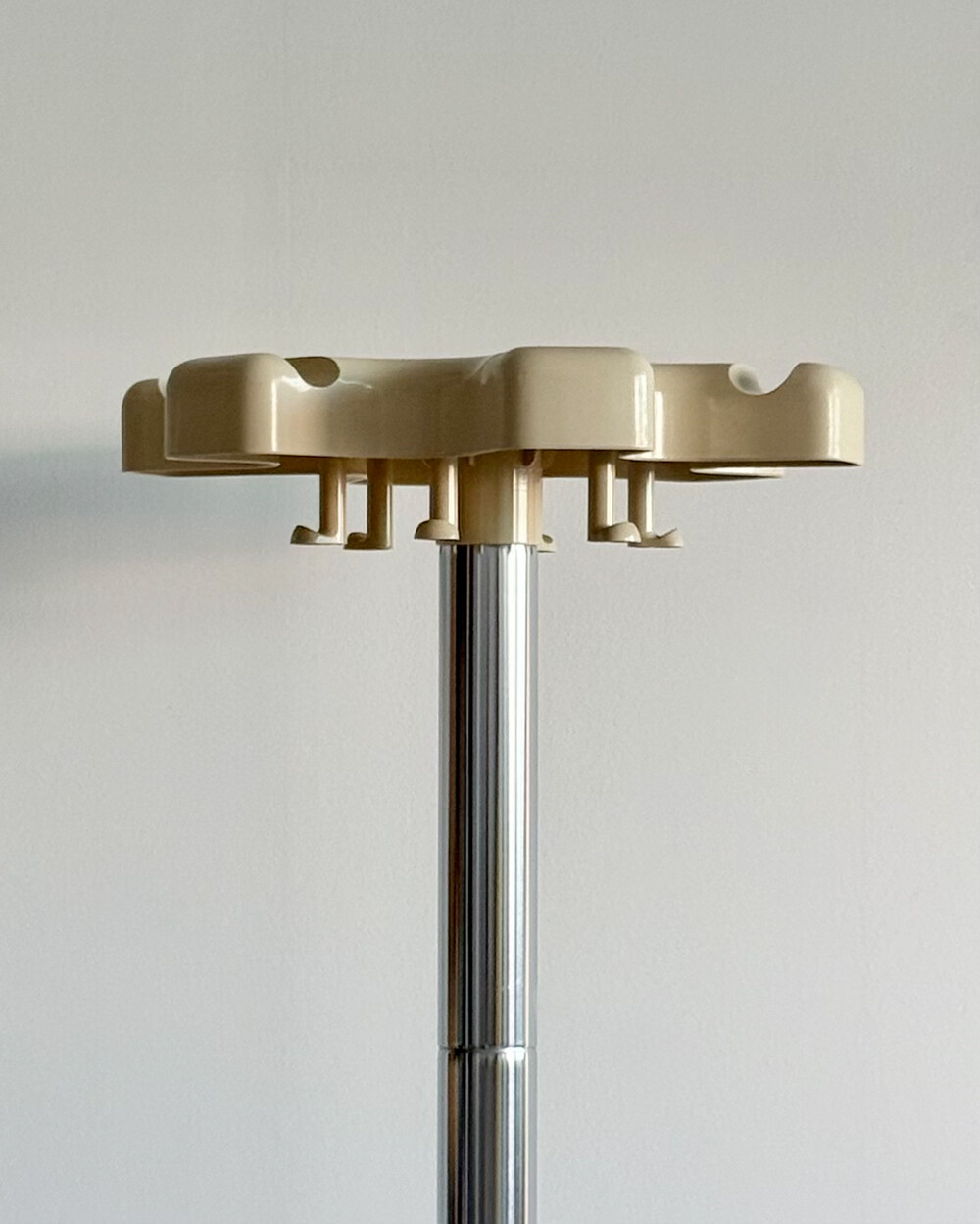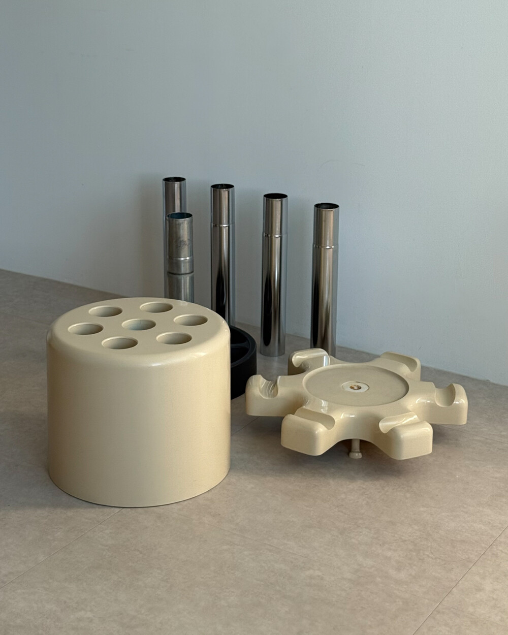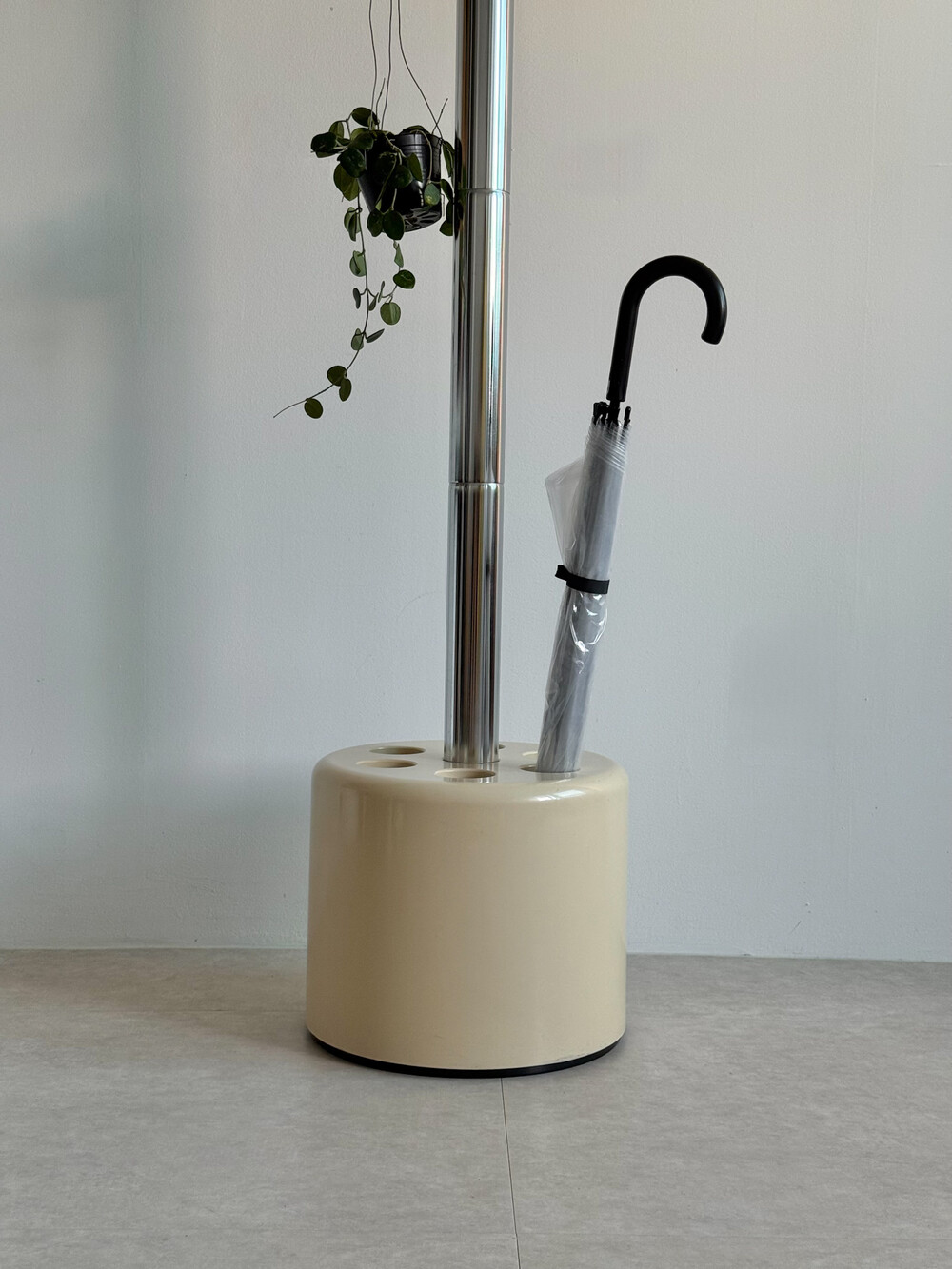 1970년대 이탈리아 Velca 사에서 제작된 코트/우산 스탠드입니다. 이탈리아의 산업디자이너 Roberto Lucci & Paolo Orlandini에 의해 디자인되었습니다. 상단은 옷걸이로 활용할 수 있으며, 하단 원통형 베이스는 원형 홀이 있어 우산이나 소품을 수납할 수 있습니다. 기둥이 분리식 모듈로 설계되어 있어 원하는 높이로 조절이 가능합니다. 당시 이탈리아 스페이스에이지의 유니크한 디자인이 잘 나타나는 제품으로 공간에서 독특한 존재감을 부여합니다.