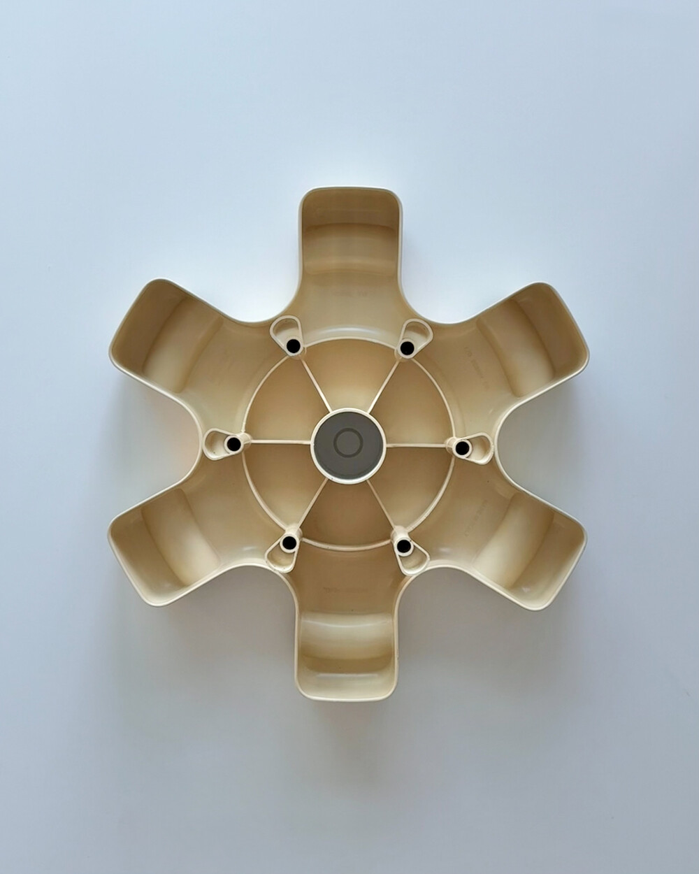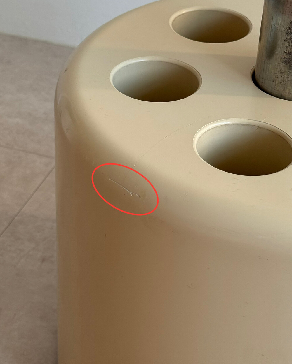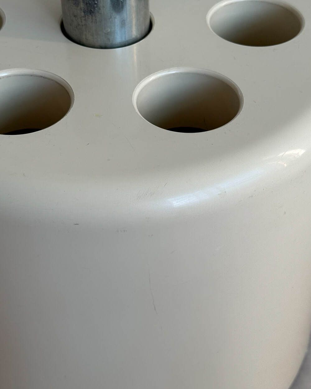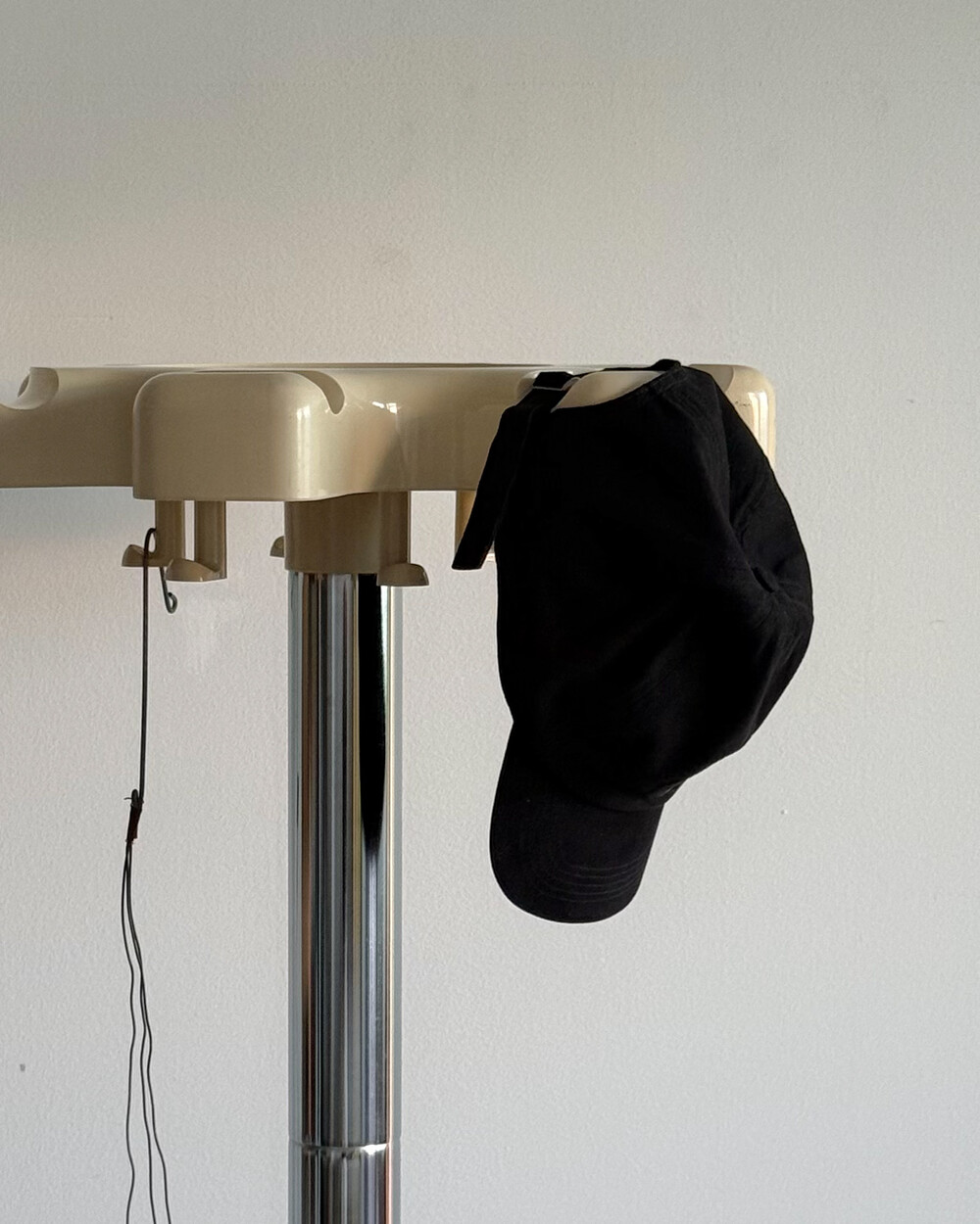 1970년대 이탈리아 Velca 사에서 제작된 코트/우산 스탠드입니다. 이탈리아의 산업디자이너 Roberto Lucci & Paolo Orlandini에 의해 디자인되었습니다. 상단은 옷걸이로 활용할 수 있으며, 하단 원통형 베이스는 원형 홀이 있어 우산이나 소품을 수납할 수 있습니다. 기둥이 분리식 모듈로 설계되어 있어 원하는 높이로 조절이 가능합니다. 당시 이탈리아 스페이스에이지의 유니크한 디자인이 잘 나타나는 제품으로 공간에서 독특한 존재감을 부여합니다.