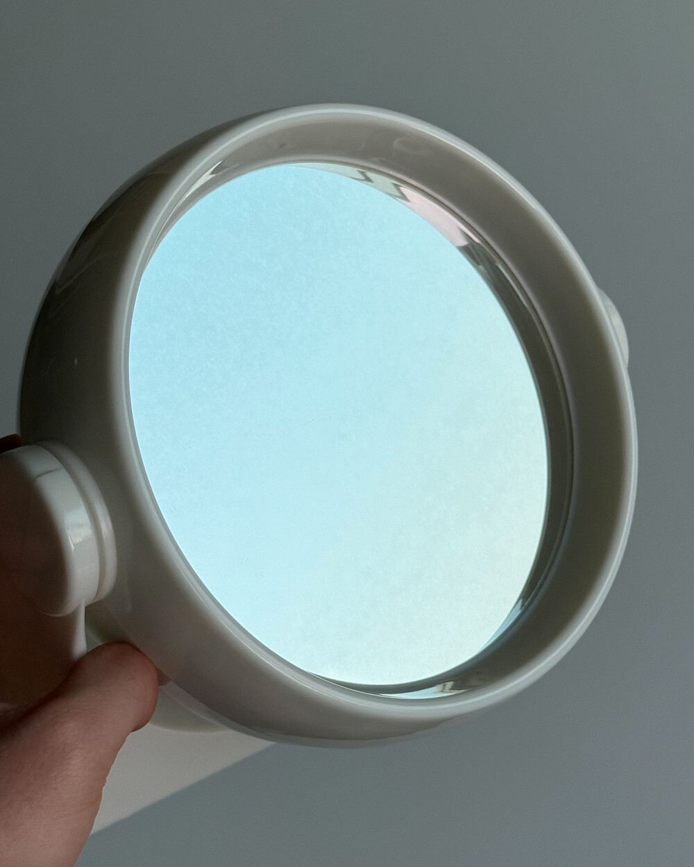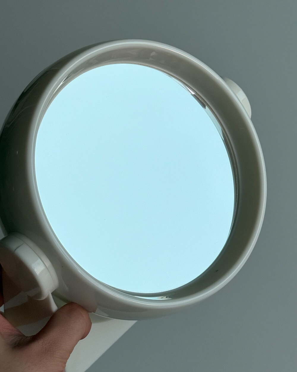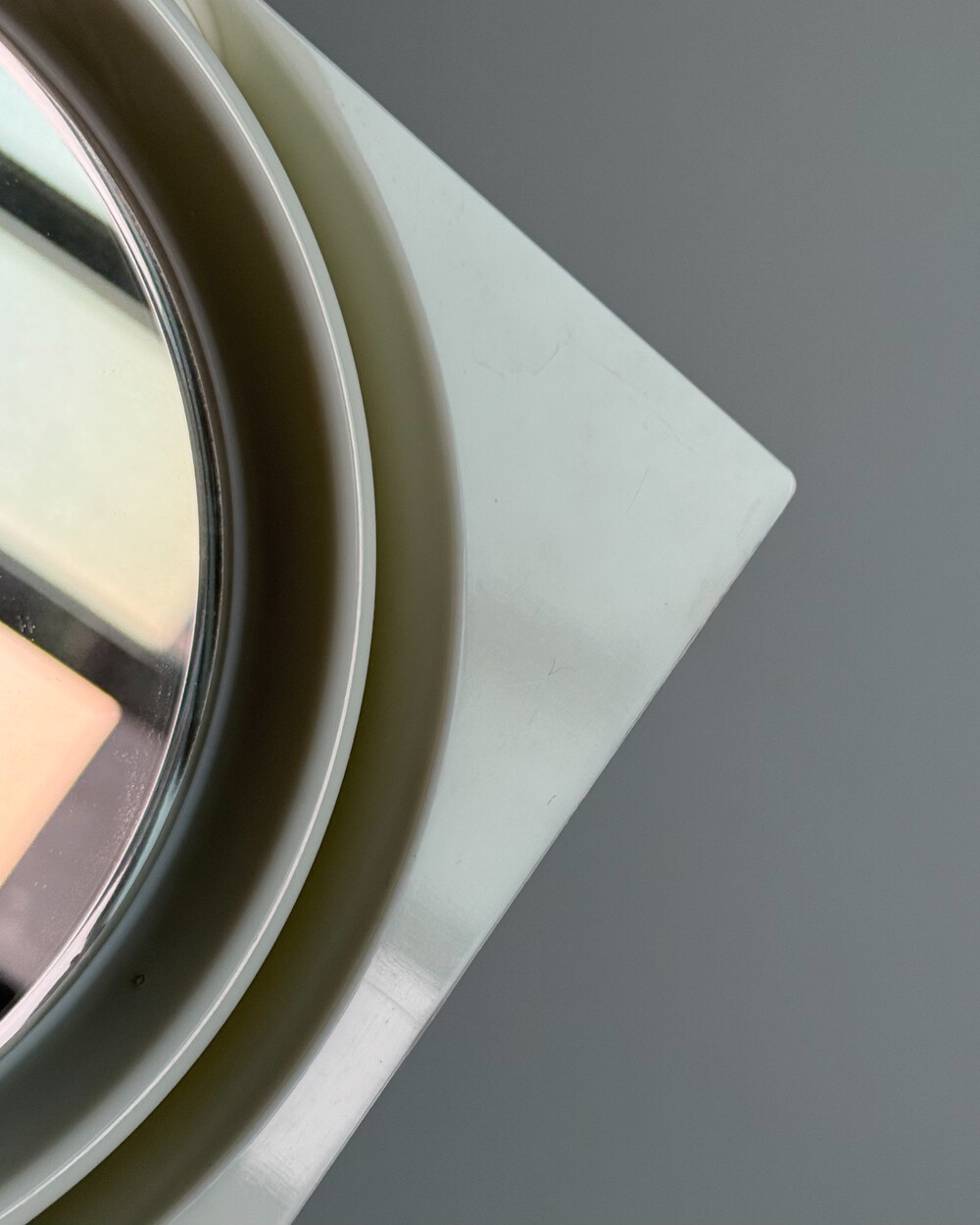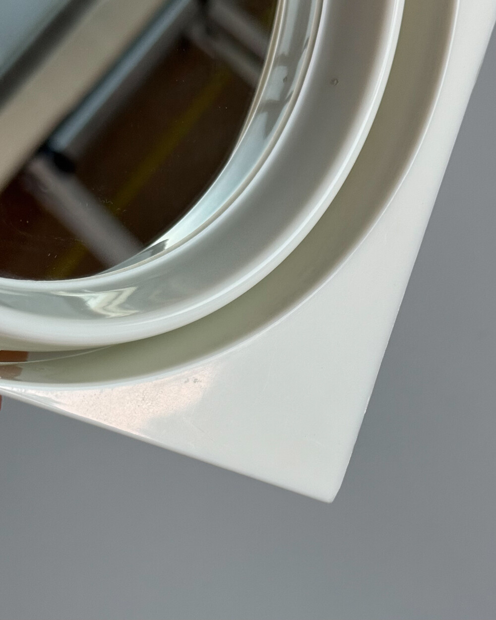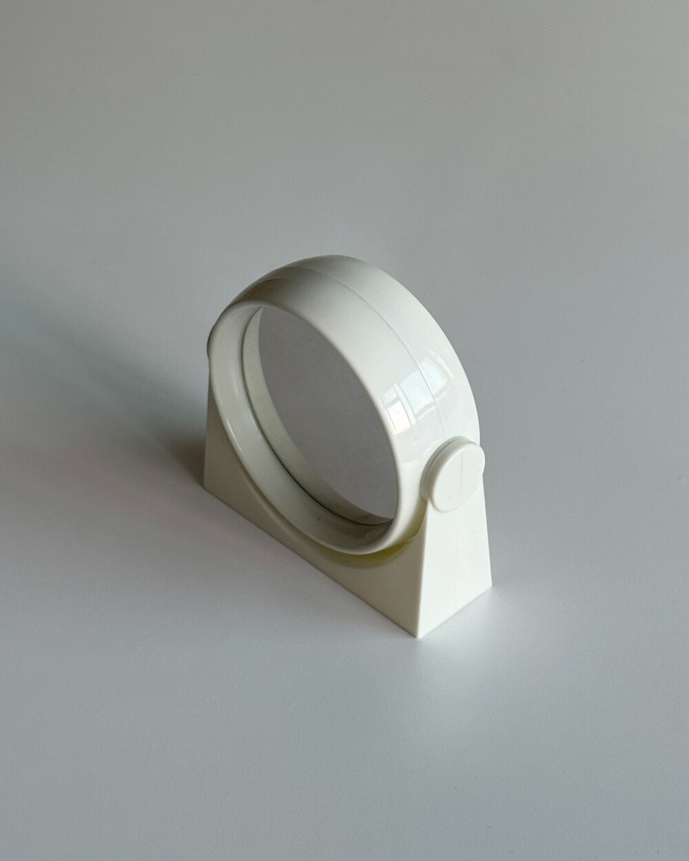 1970년대 독일 빈티지 탁상용 거울입니다. 프레임은 화이트 컬러의 단단한 플라스틱 소재로 이루어져 있습니다. 확대경과 일반경, 2개의 양면 거울로 구성되었습니다.