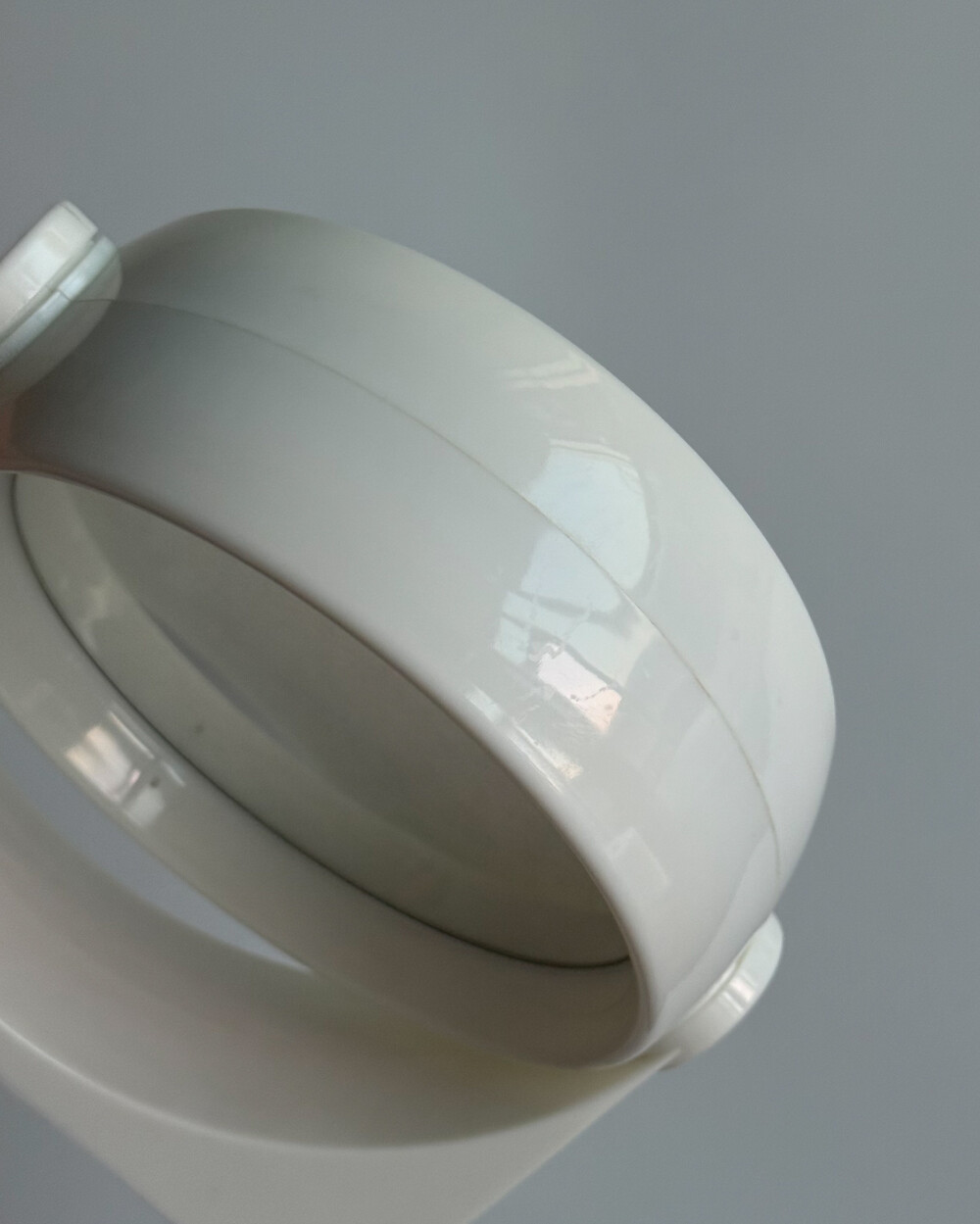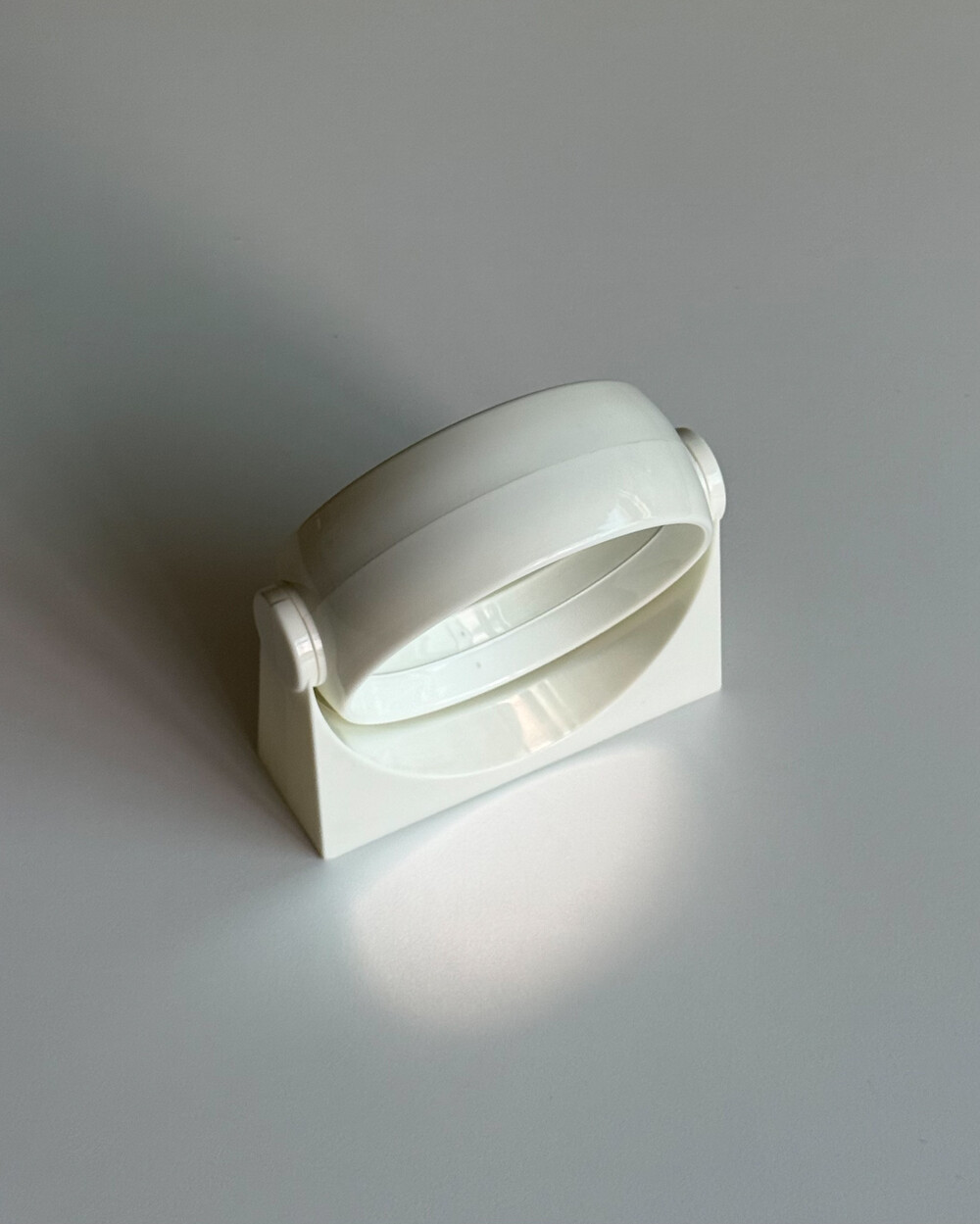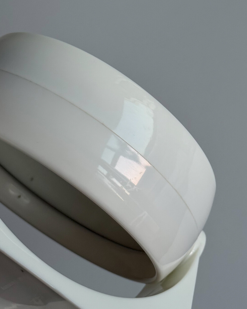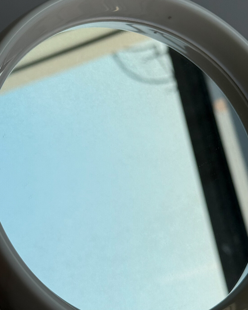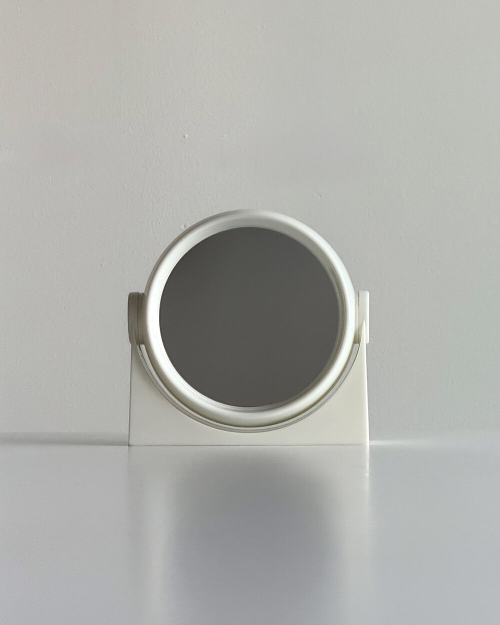1970년대 독일 빈티지 탁상용 거울입니다. 프레임은 화이트 컬러의 단단한 플라스틱 소재로 이루어져 있습니다. 확대경과 일반경, 2개의 양면 거울로 구성되었습니다.