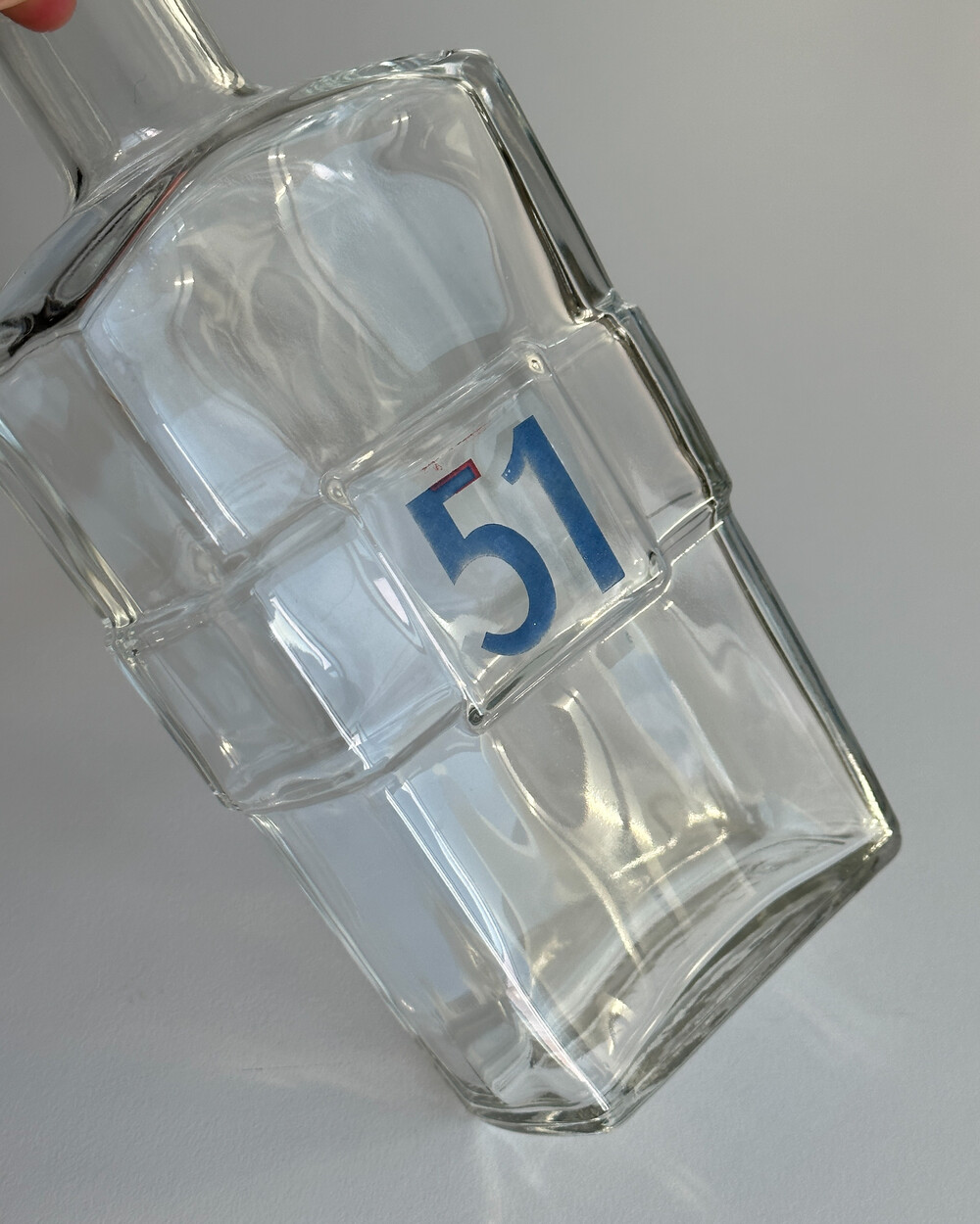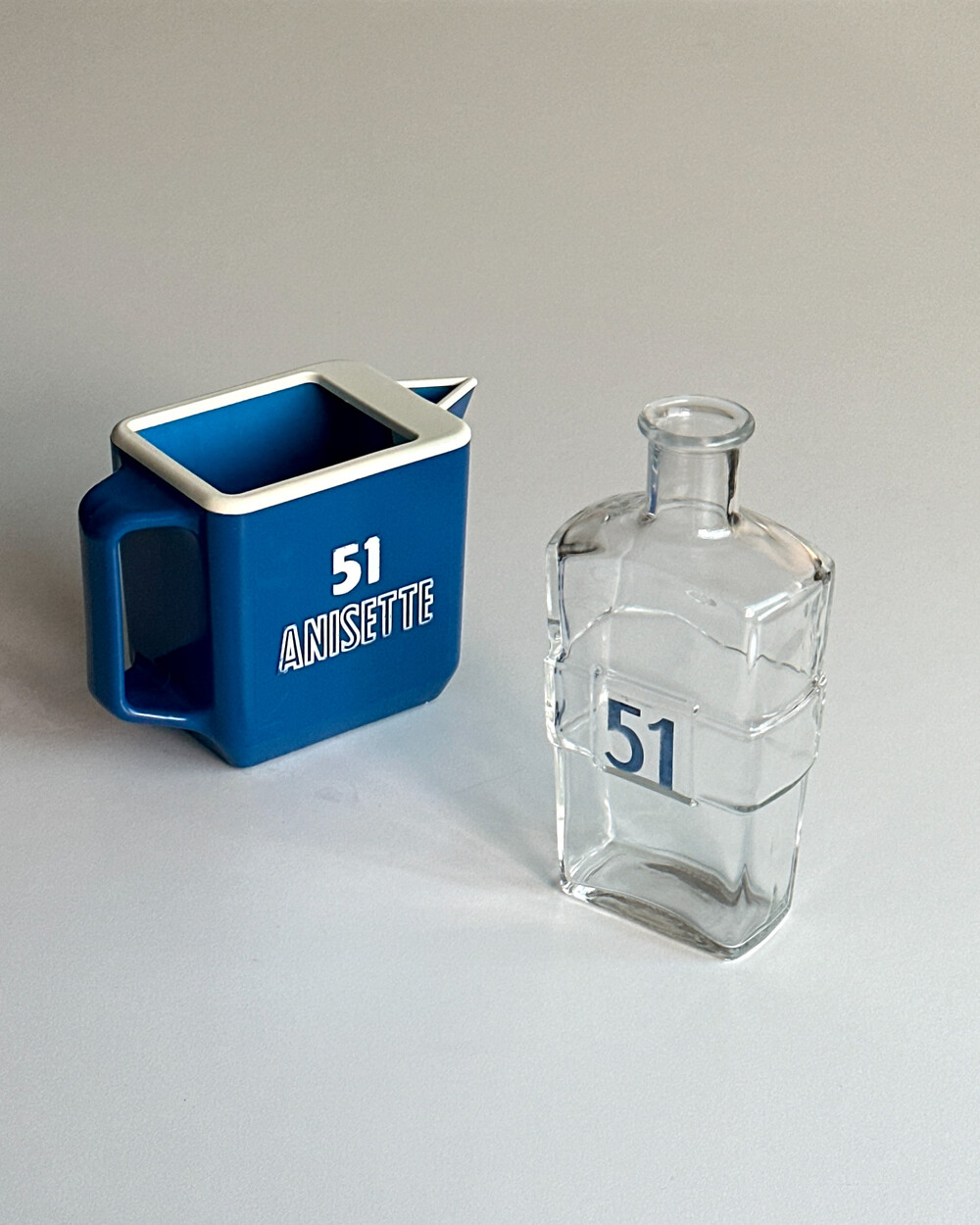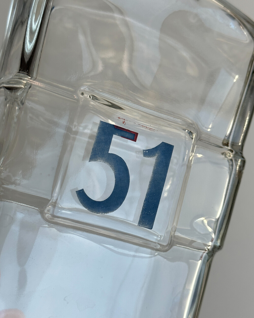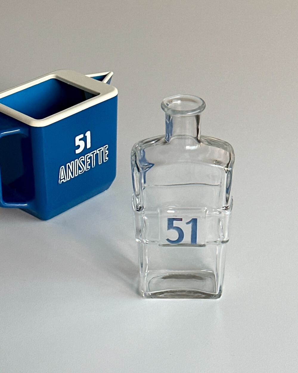 80년도 프랑스 Anisette 리큐어 브랜드 RICARD 51의 빈티지 피처와 유리병입니다. 숫자 51은 1951년 ‘Pastis 51’이라는 제품 이름에서 유래되었습니다. 레트로한 무드를 주는 매력적인 디자인으로 포인트 소품으로 활용하기 좋습니다.