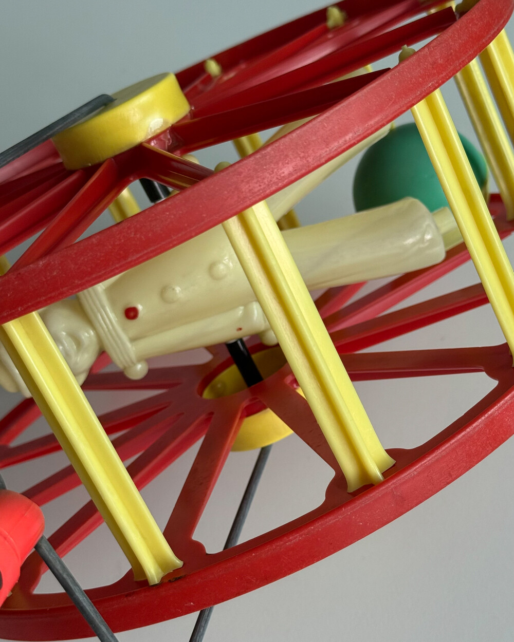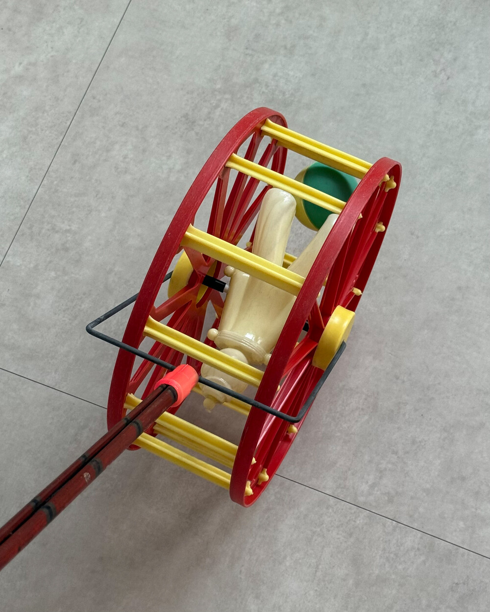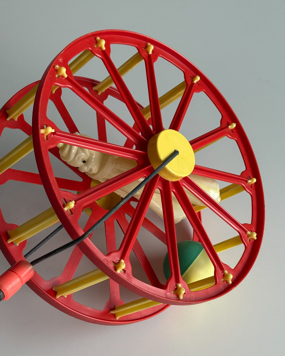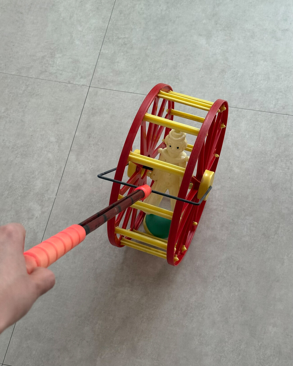 1960년대 네덜란드에서 제작된 빈티지 푸시 토이(duwspeelgoed)입니다. 원형 바퀴 속에 피에로와 공이 함께 들어 있어 바닥 위에서 밀면 인형이 움직이며 공이 덜그럭거리는 소리를 냅니다. 본래는 어린 아이가 걷기를 연습할 때 흥미를 주기 위한 장난감으로 제작되었습니다. 알록달록한 컬러감과 유쾌한 조형으로 빈티지한 포인트 오브제로 활용하실 수 있습니다.