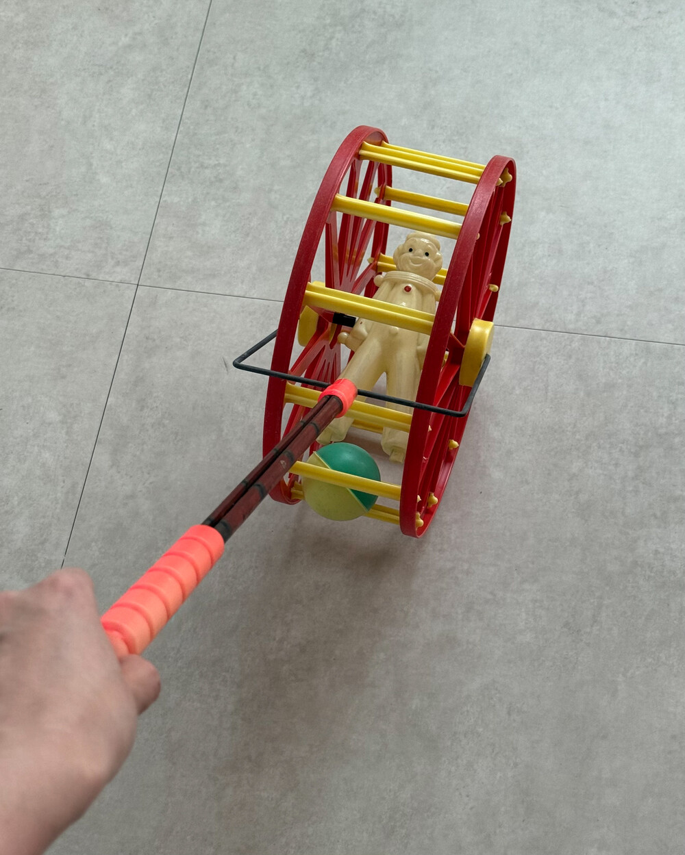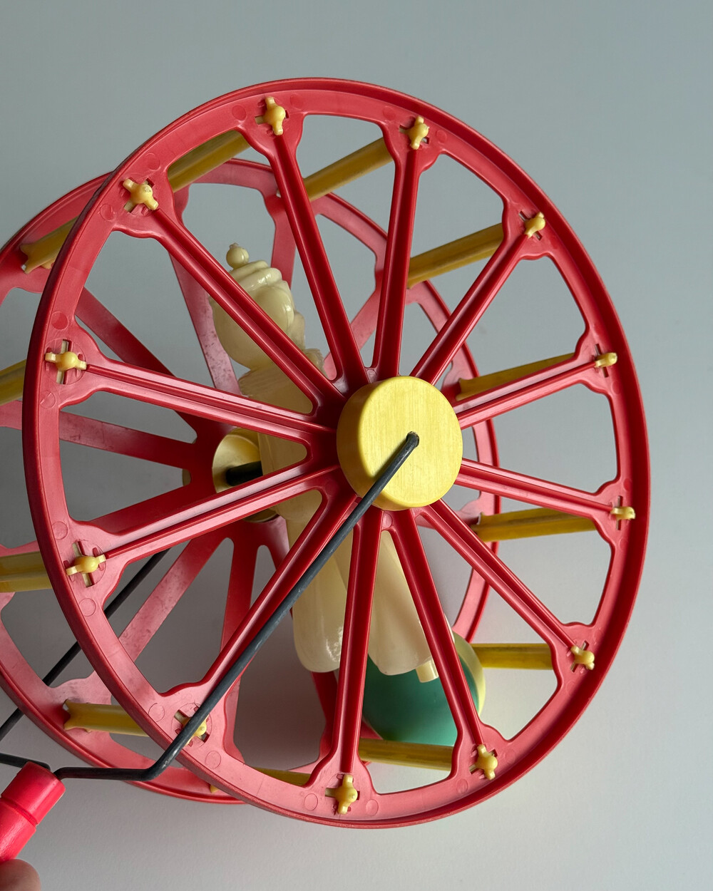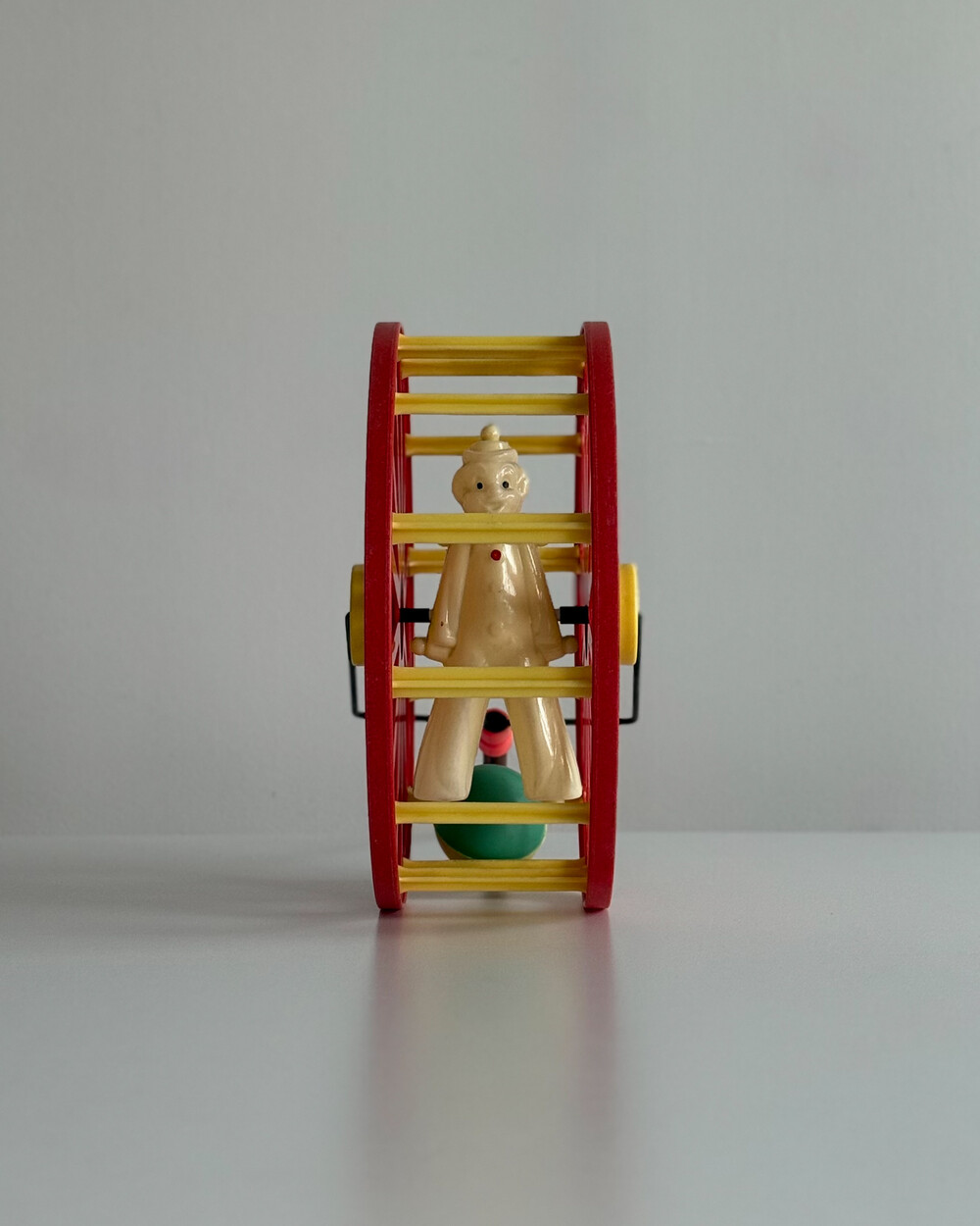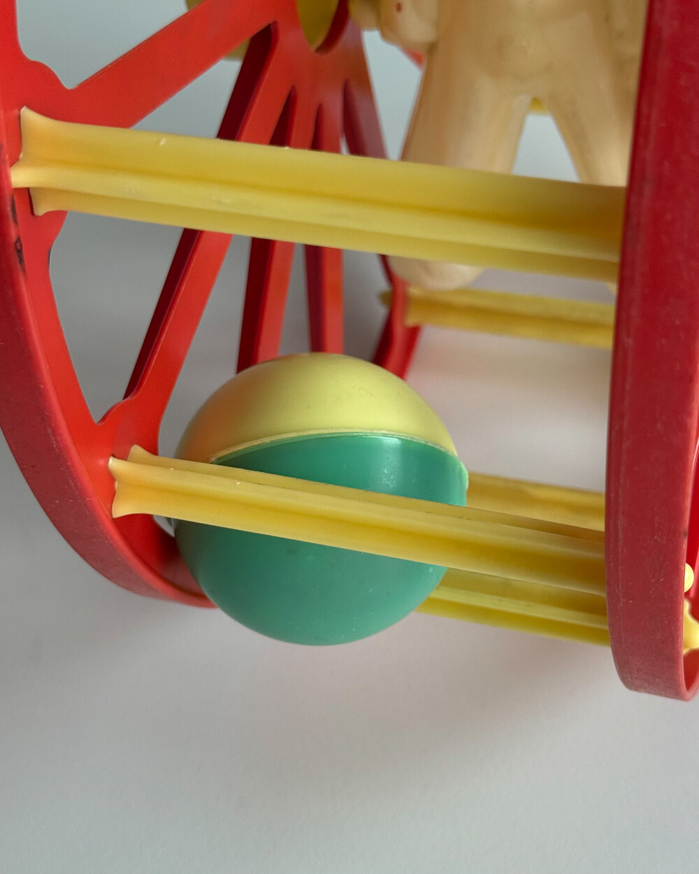 1960년대 네덜란드에서 제작된 빈티지 푸시 토이(duwspeelgoed)입니다. 원형 바퀴 속에 피에로와 공이 함께 들어 있어 바닥 위에서 밀면 인형이 움직이며 공이 덜그럭거리는 소리를 냅니다. 본래는 어린 아이가 걷기를 연습할 때 흥미를 주기 위한 장난감으로 제작되었습니다. 알록달록한 컬러감과 유쾌한 조형으로 빈티지한 포인트 오브제로 활용하실 수 있습니다.