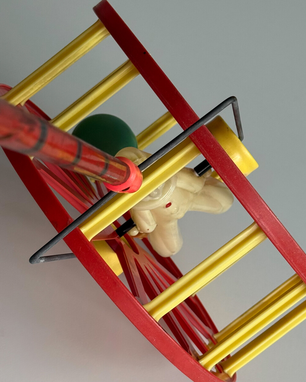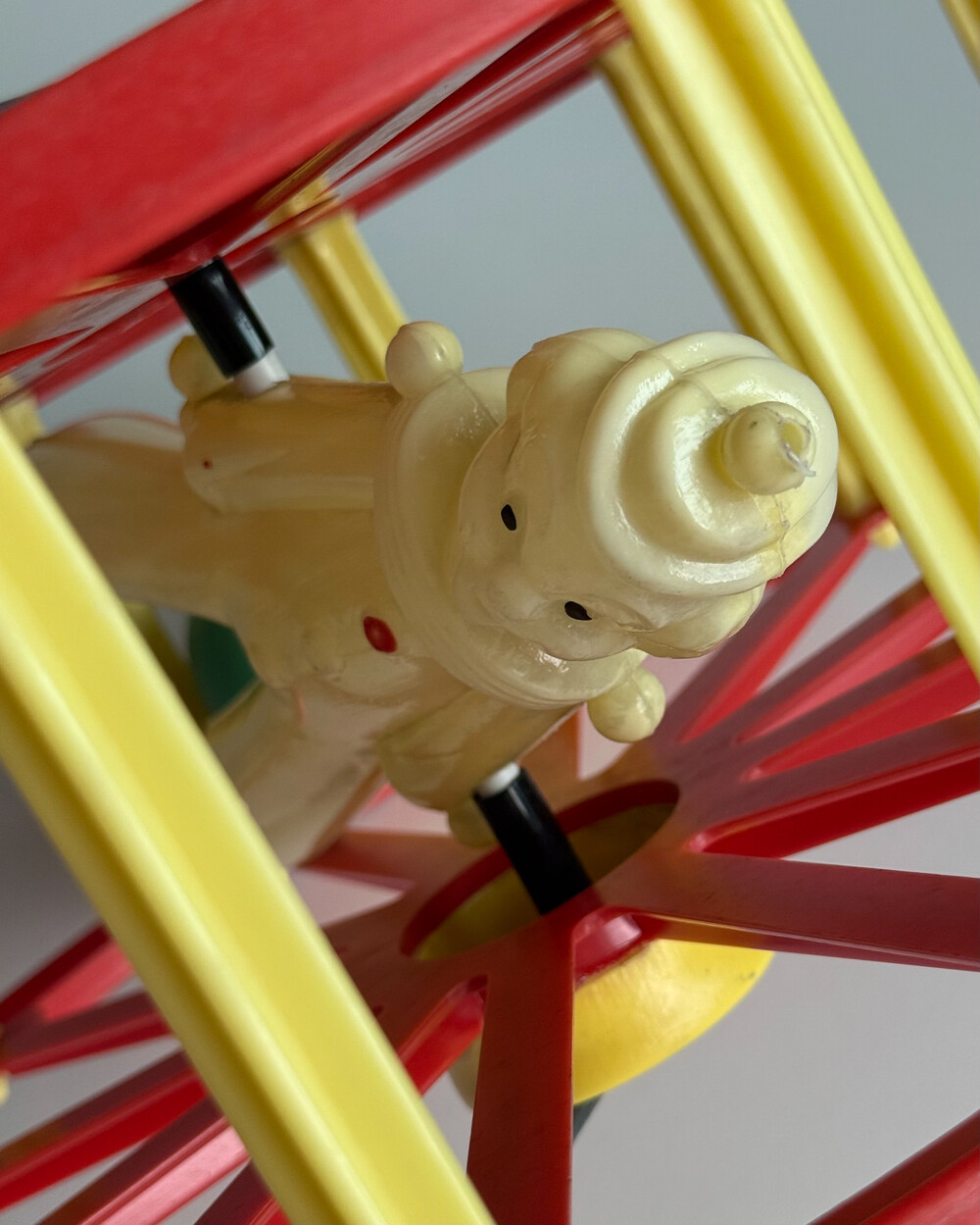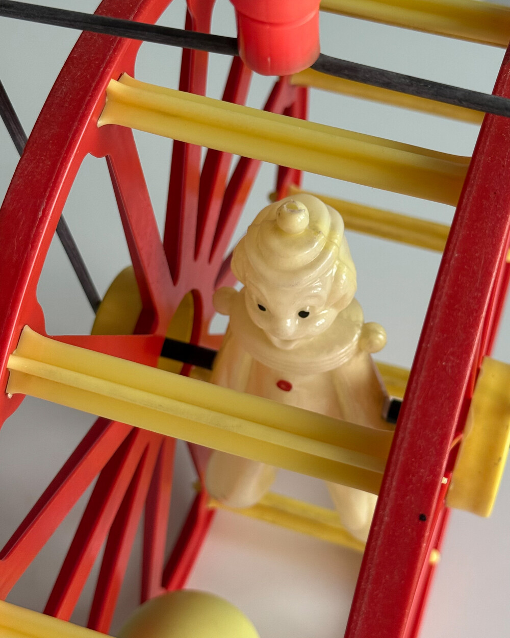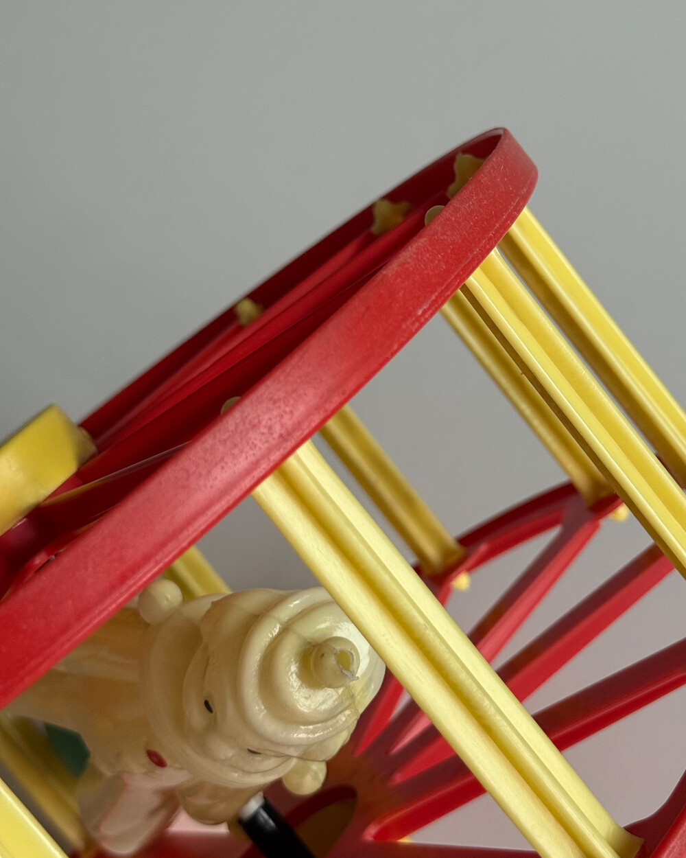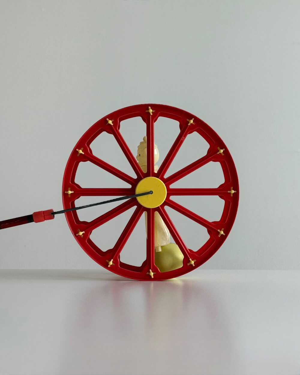1960년대 네덜란드에서 제작된 빈티지 푸시 토이(duwspeelgoed)입니다. 원형 바퀴 속에 피에로와 공이 함께 들어 있어 바닥 위에서 밀면 인형이 움직이며 공이 덜그럭거리는 소리를 냅니다. 본래는 어린 아이가 걷기를 연습할 때 흥미를 주기 위한 장난감으로 제작되었습니다. 알록달록한 컬러감과 유쾌한 조형으로 빈티지한 포인트 오브제로 활용하실 수 있습니다.
