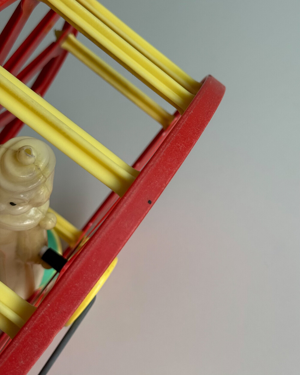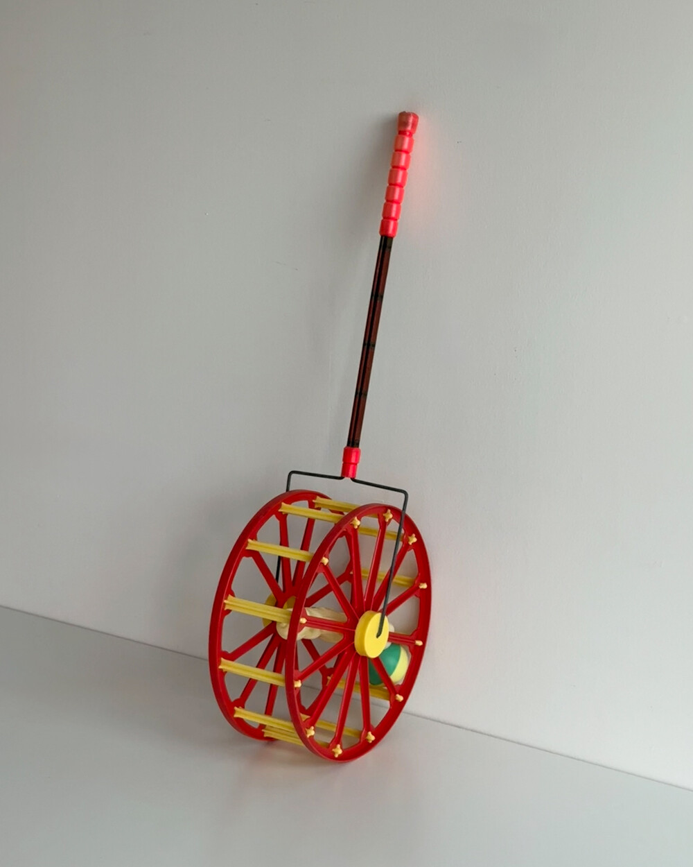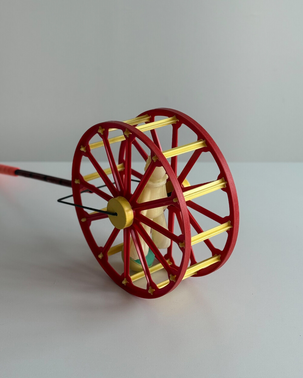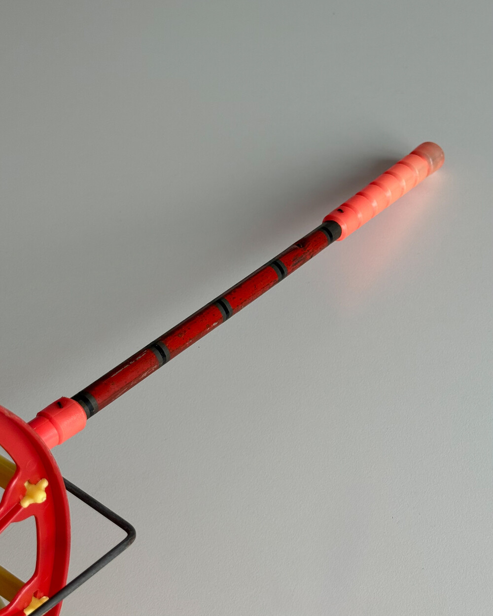 1960년대 네덜란드에서 제작된 빈티지 푸시 토이(duwspeelgoed)입니다. 원형 바퀴 속에 피에로와 공이 함께 들어 있어 바닥 위에서 밀면 인형이 움직이며 공이 덜그럭거리는 소리를 냅니다. 본래는 어린 아이가 걷기를 연습할 때 흥미를 주기 위한 장난감으로 제작되었습니다. 알록달록한 컬러감과 유쾌한 조형으로 빈티지한 포인트 오브제로 활용하실 수 있습니다.