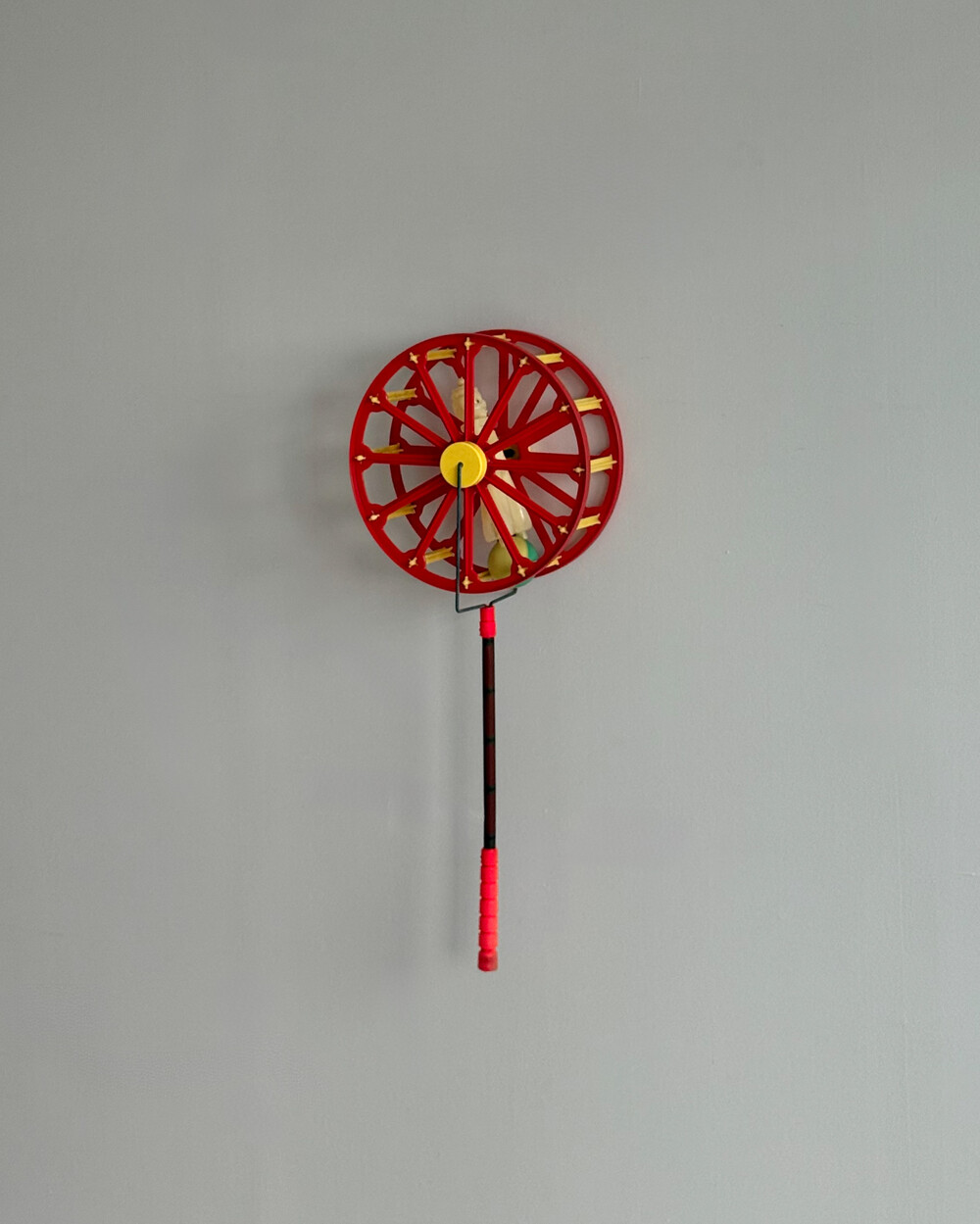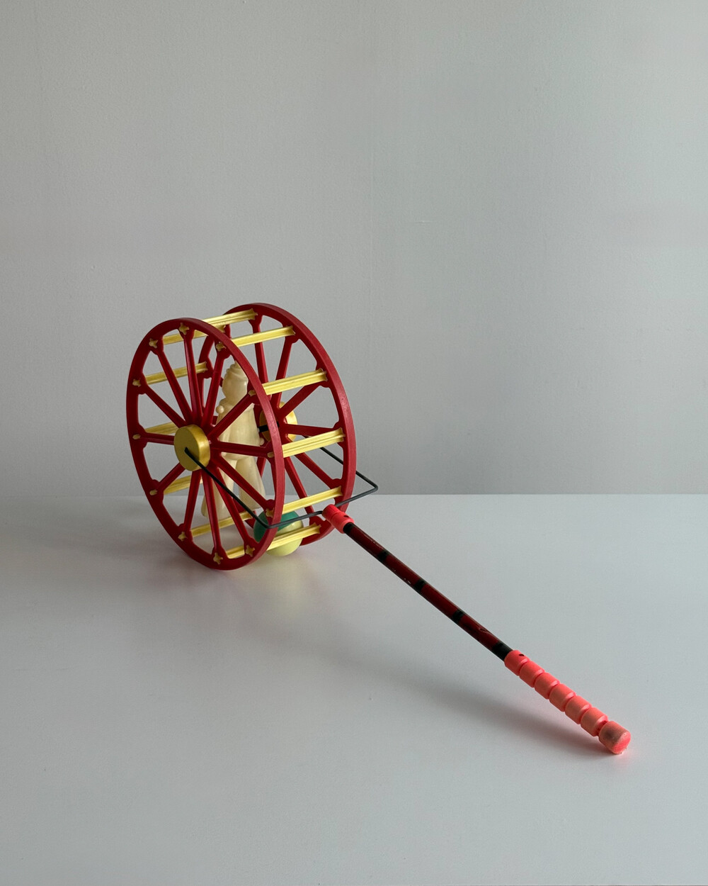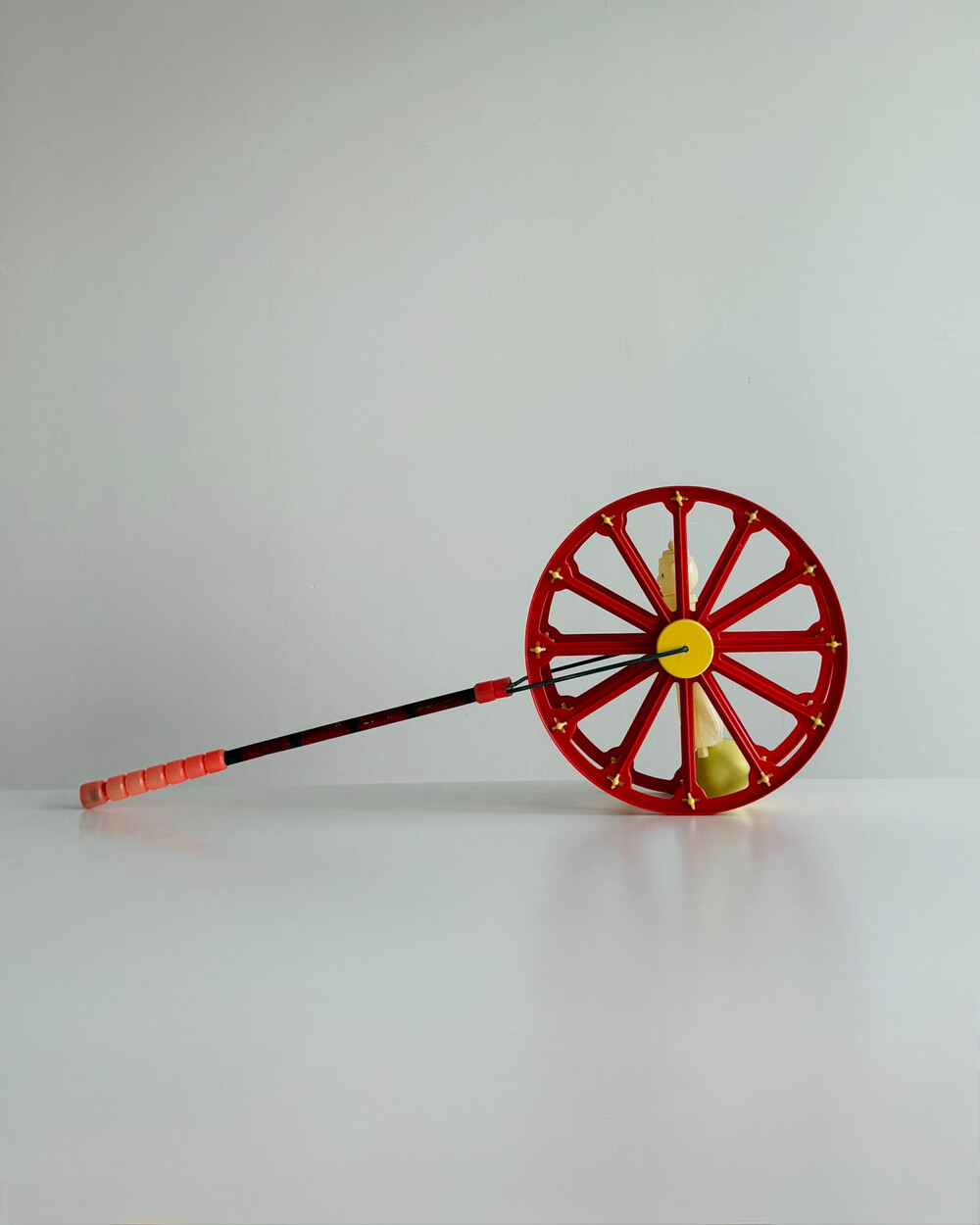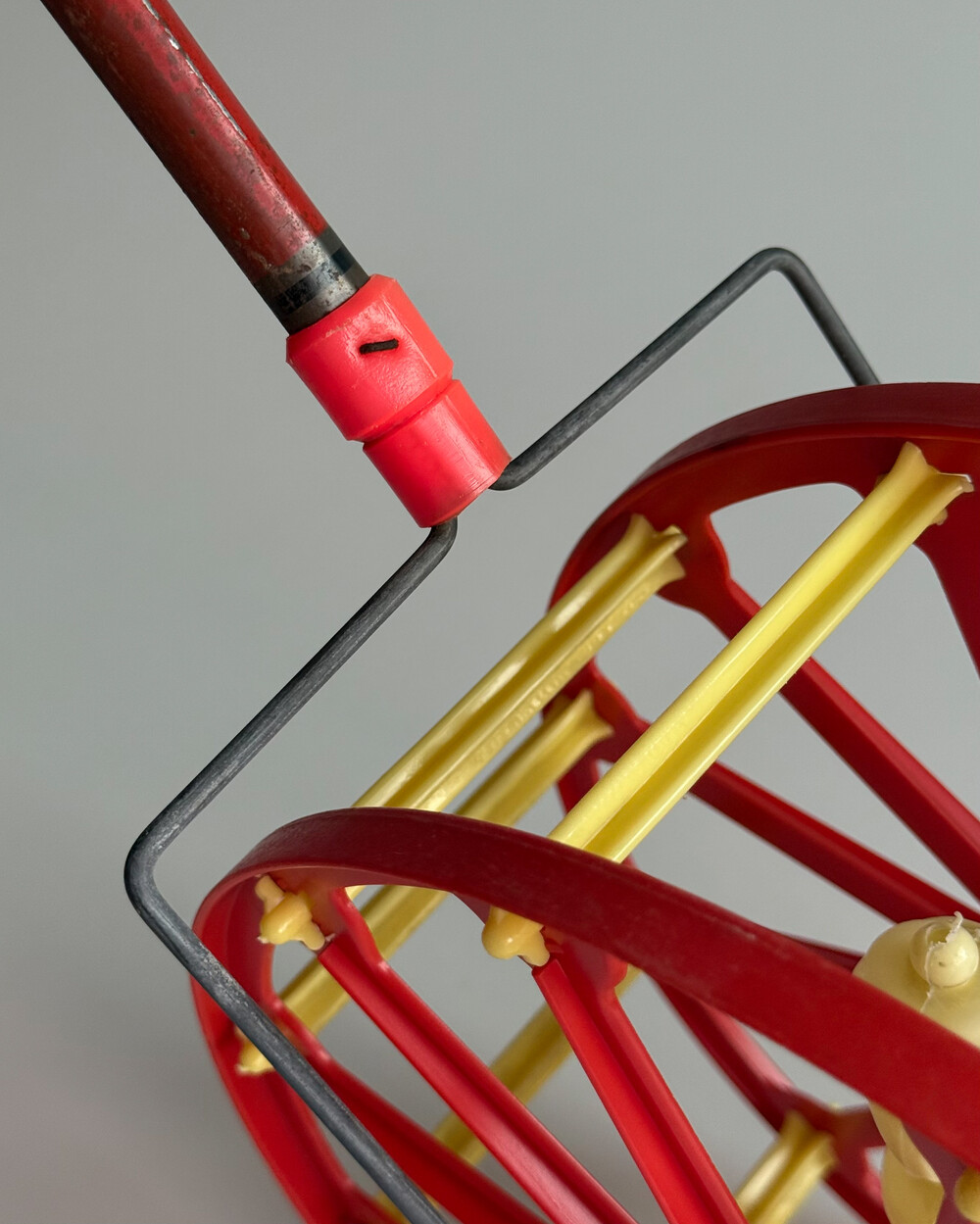 1960년대 네덜란드에서 제작된 빈티지 푸시 토이(duwspeelgoed)입니다. 원형 바퀴 속에 피에로와 공이 함께 들어 있어 바닥 위에서 밀면 인형이 움직이며 공이 덜그럭거리는 소리를 냅니다. 본래는 어린 아이가 걷기를 연습할 때 흥미를 주기 위한 장난감으로 제작되었습니다. 알록달록한 컬러감과 유쾌한 조형으로 빈티지한 포인트 오브제로 활용하실 수 있습니다.