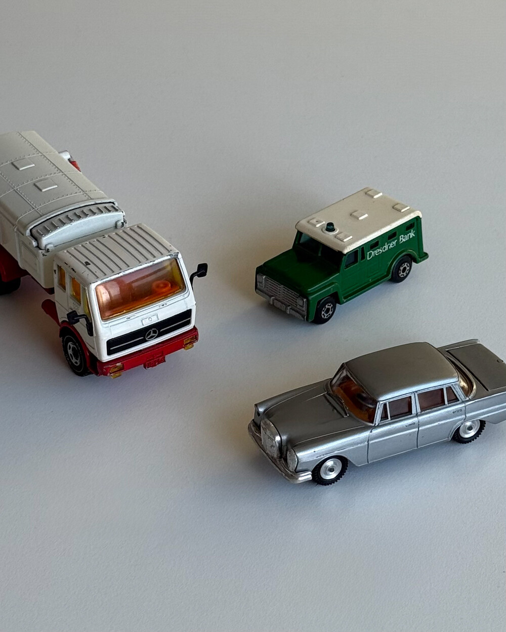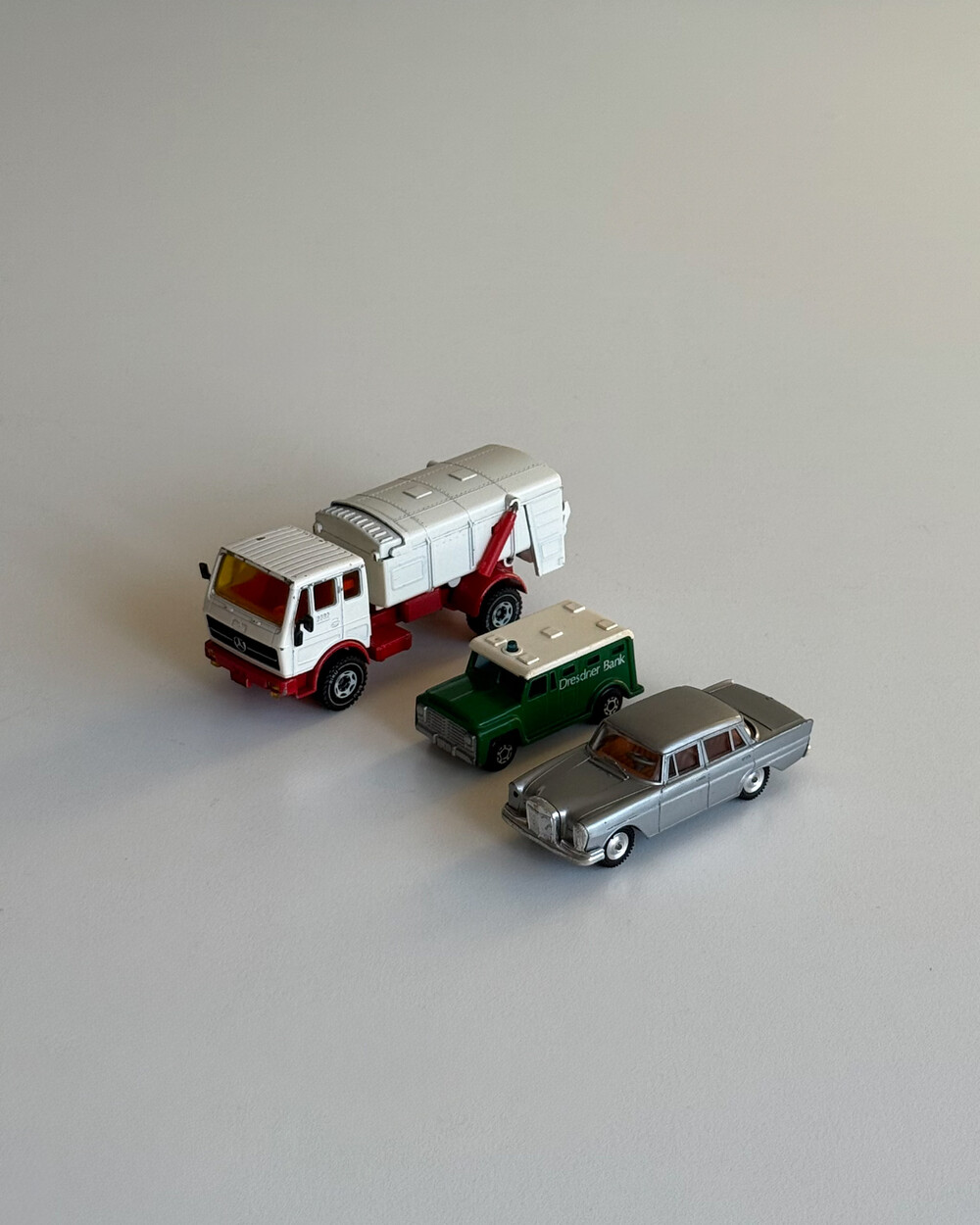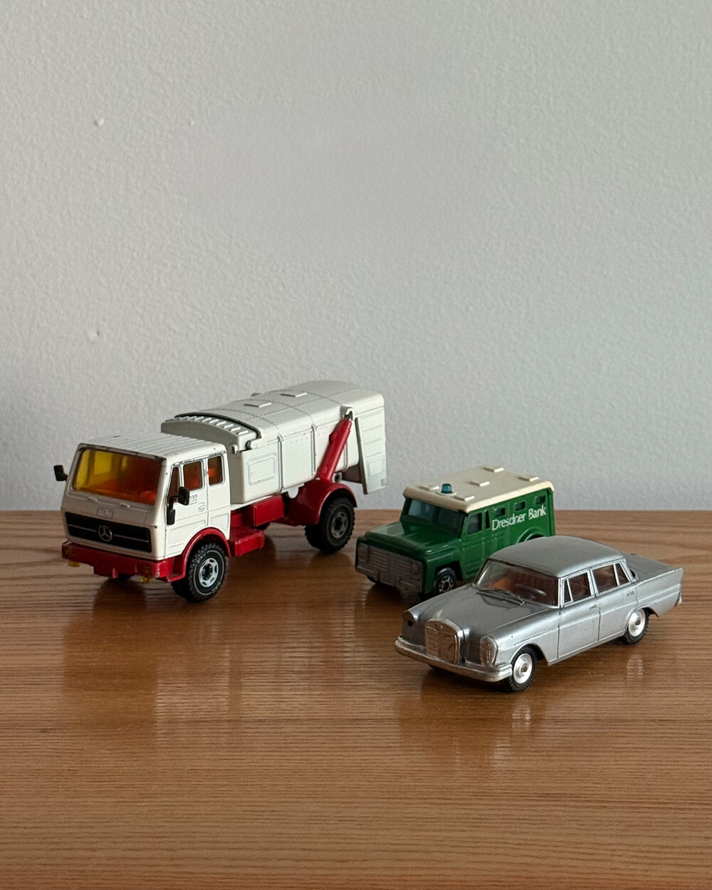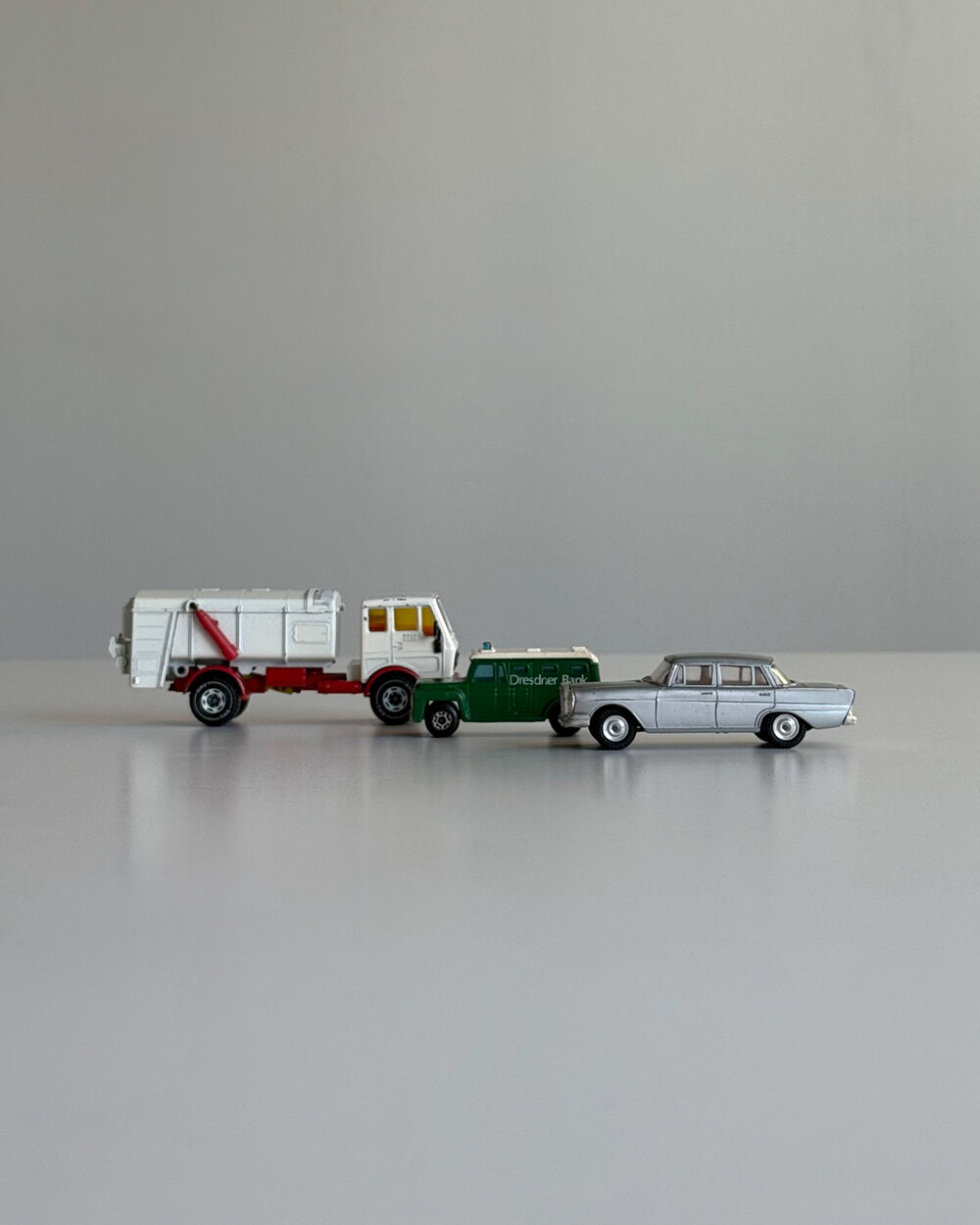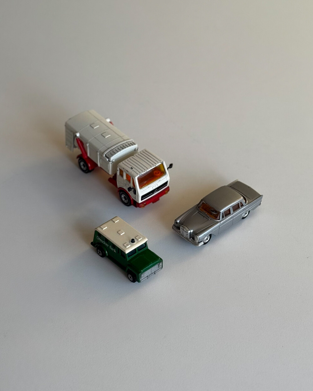 1960~80년대에 제작된 오리지널 빈티지 다이캐스트 미니카입니다. 서독 GAMA의 Mercedes-Benz 220 S , 영국 Matchbox의 Armored Truck, 서독 SIKU의 Mercedes-Benz 2232 Garbage Truck 3가지 미니어처가 입고되었습니다. 모두 다이캐스트로 섬세하게 제작되었습니다. 귀여운 포인츠 소품으로 활용하시기에 좋습니다.