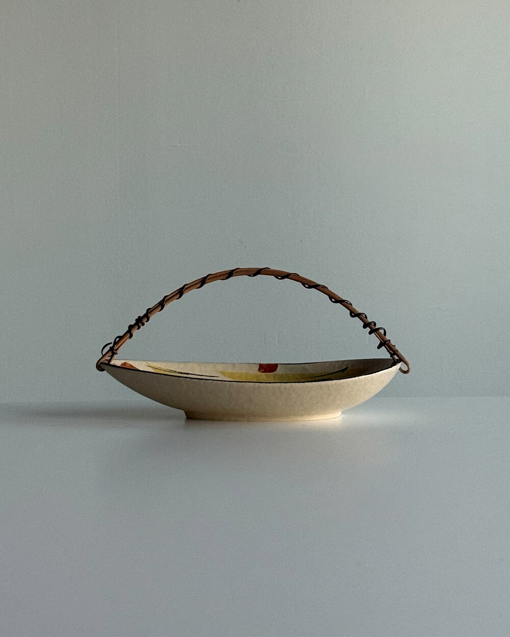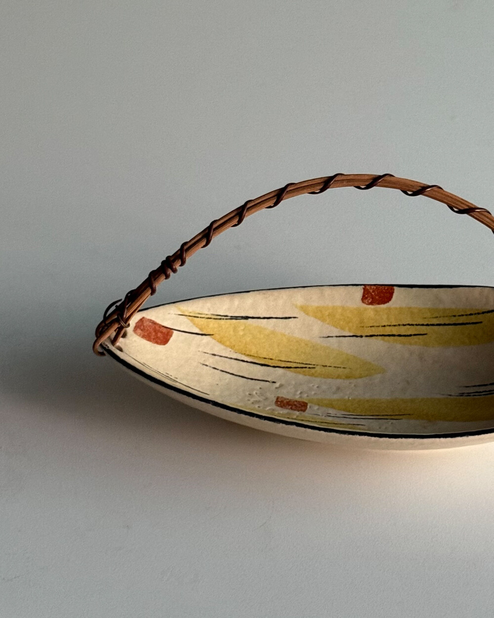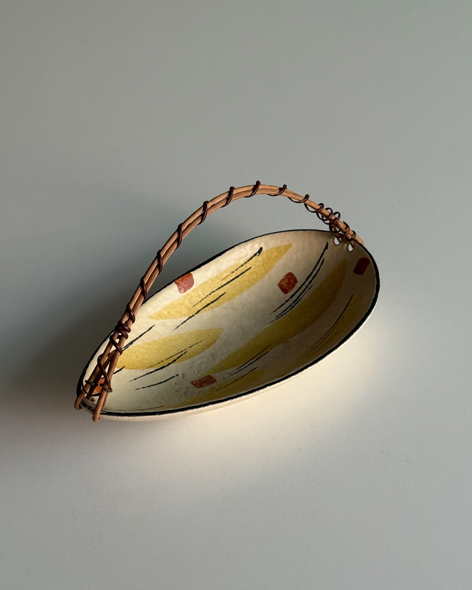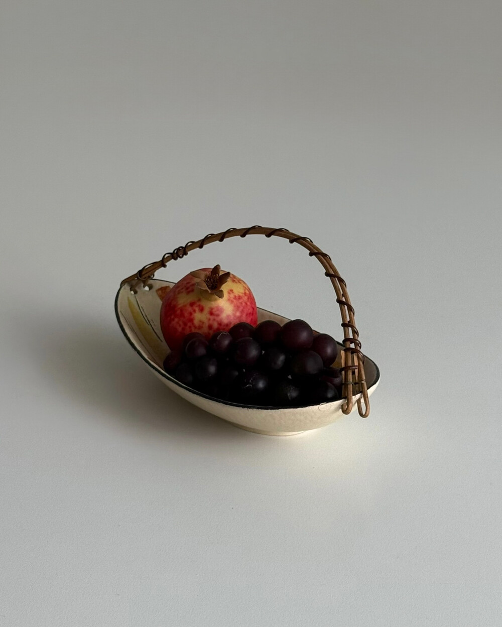 1960년대에 서독 제작된 세라믹 볼입니다. 타원형 바디와 라탄 손잡이로 이루어져 있으며, 고급스러운 매트마감 위로 핸드페인팅 라인 패턴이 매력적인 디자인입니다. 과일 바스켓, 소품 보관 트레이 등 다양하게 활용하실 수 있습니다.