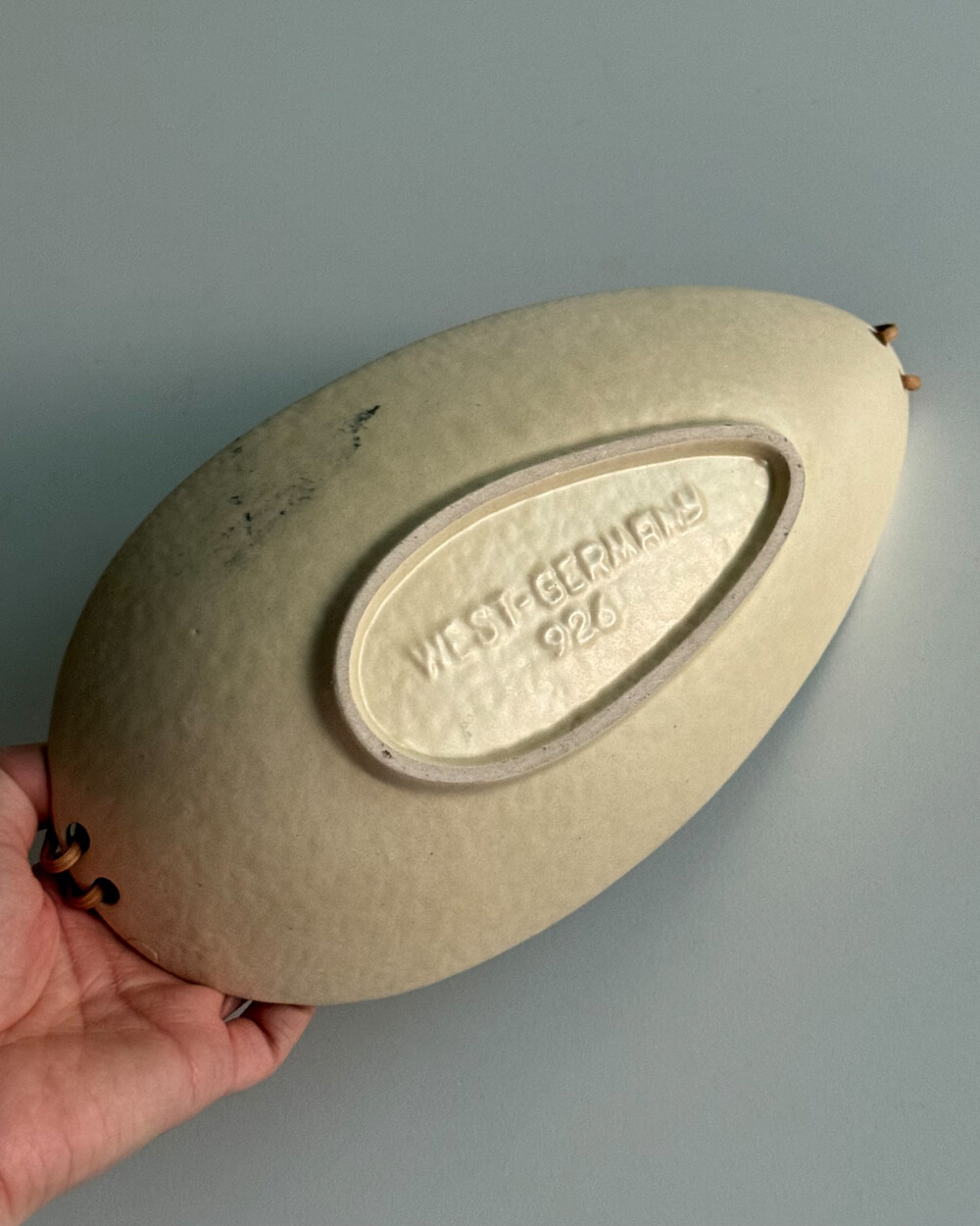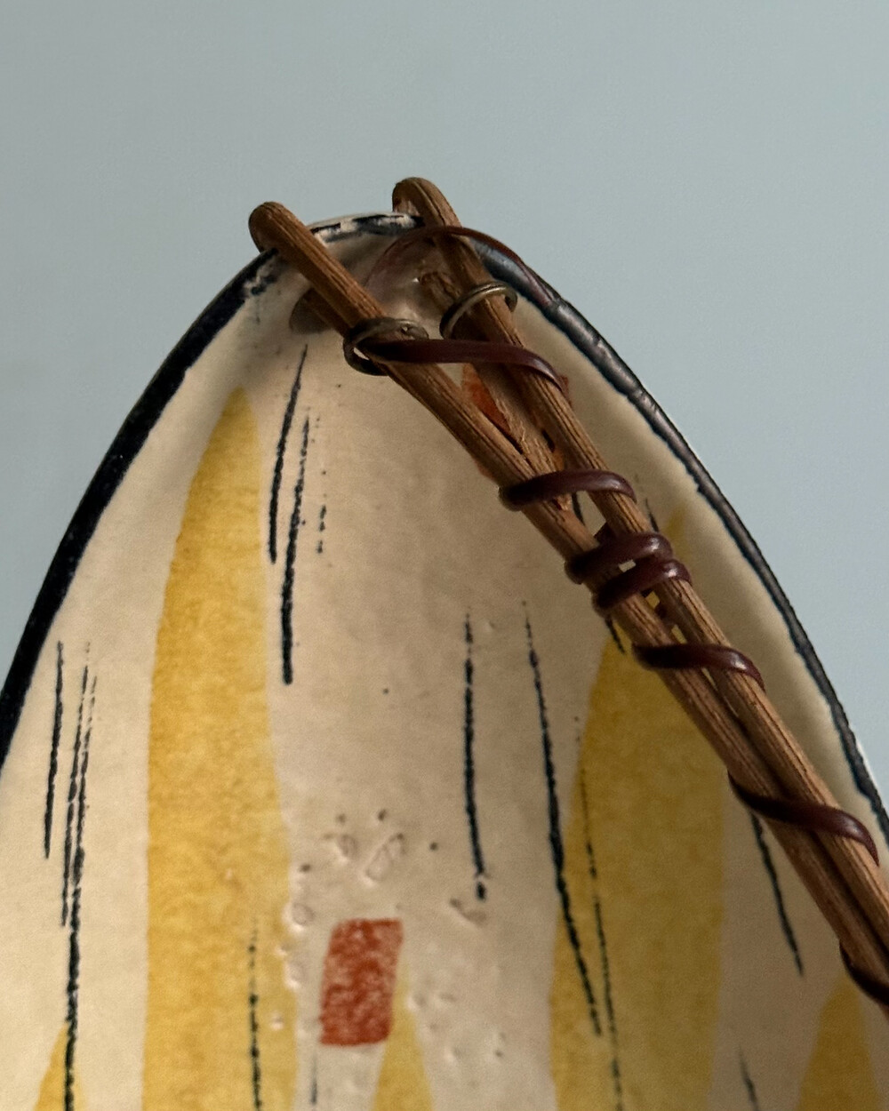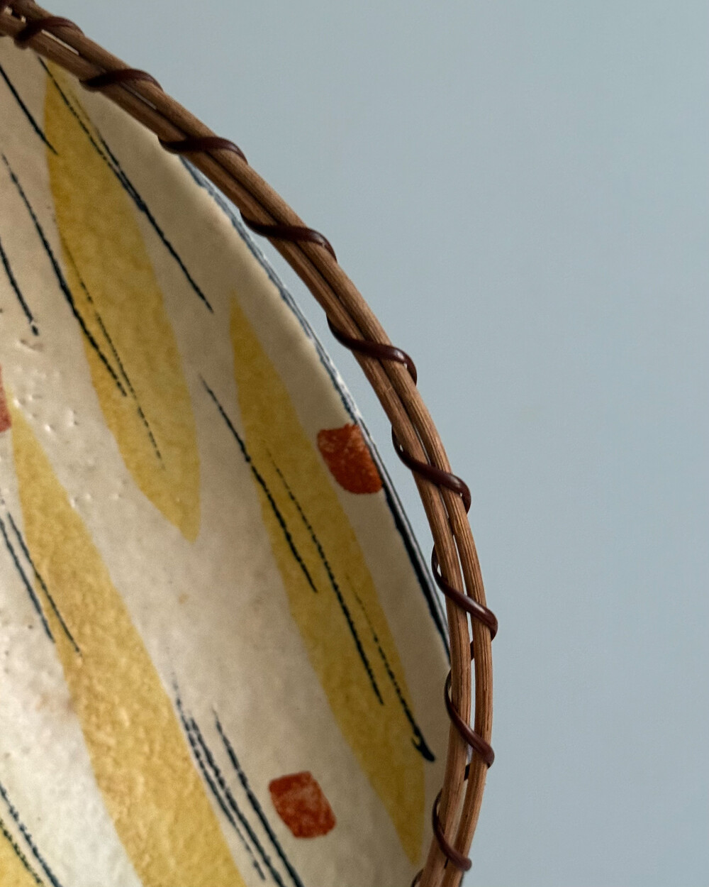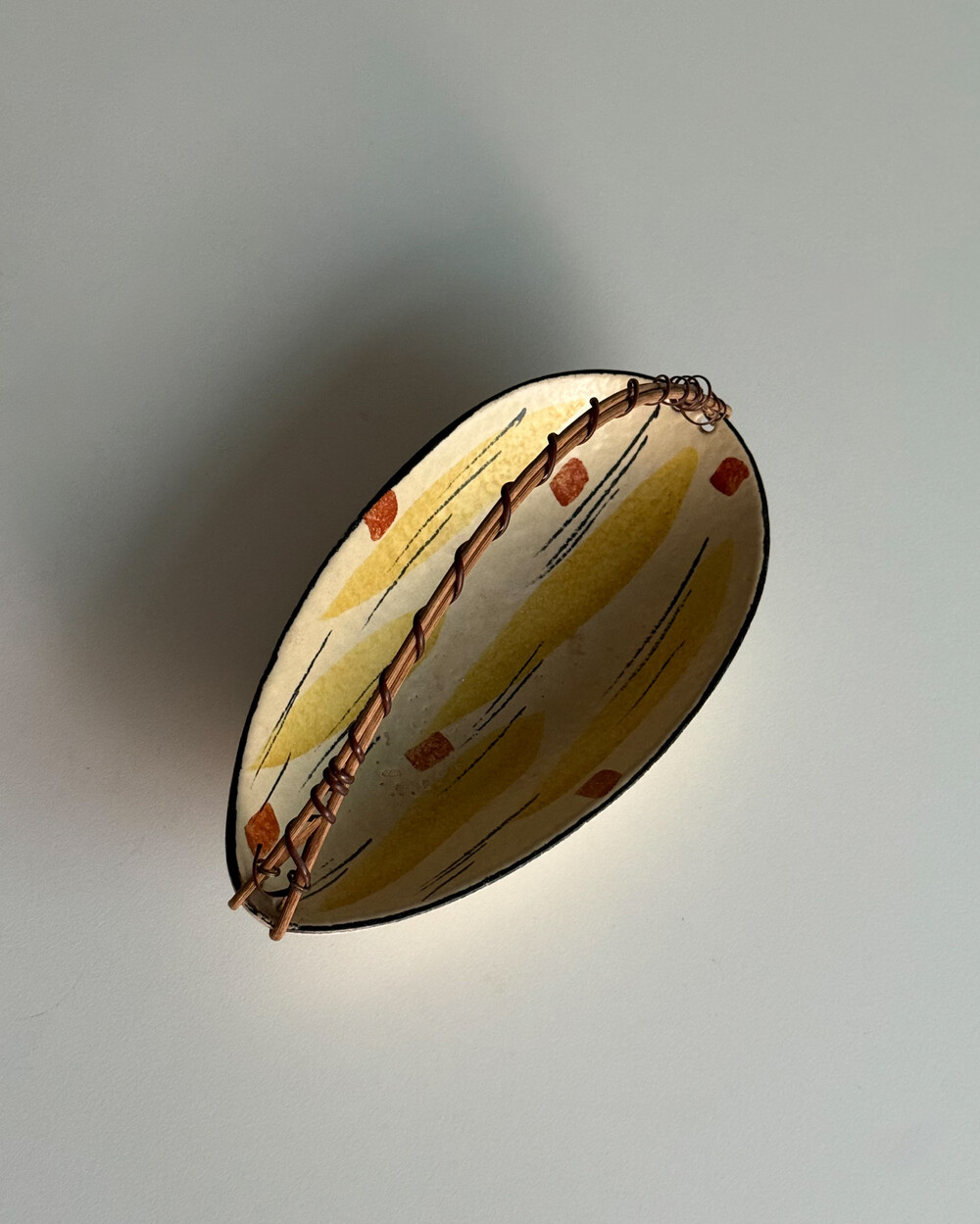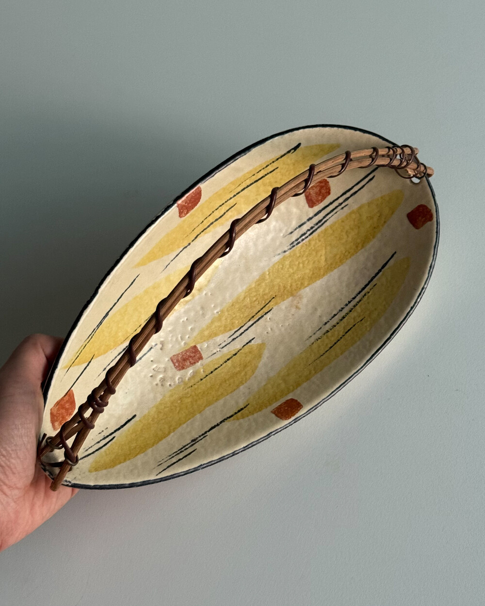 1960년대에 서독 제작된 세라믹 볼입니다. 타원형 바디와 라탄 손잡이로 이루어져 있으며, 고급스러운 매트마감 위로 핸드페인팅 라인 패턴이 매력적인 디자인입니다. 과일 바스켓, 소품 보관 트레이 등 다양하게 활용하실 수 있습니다.