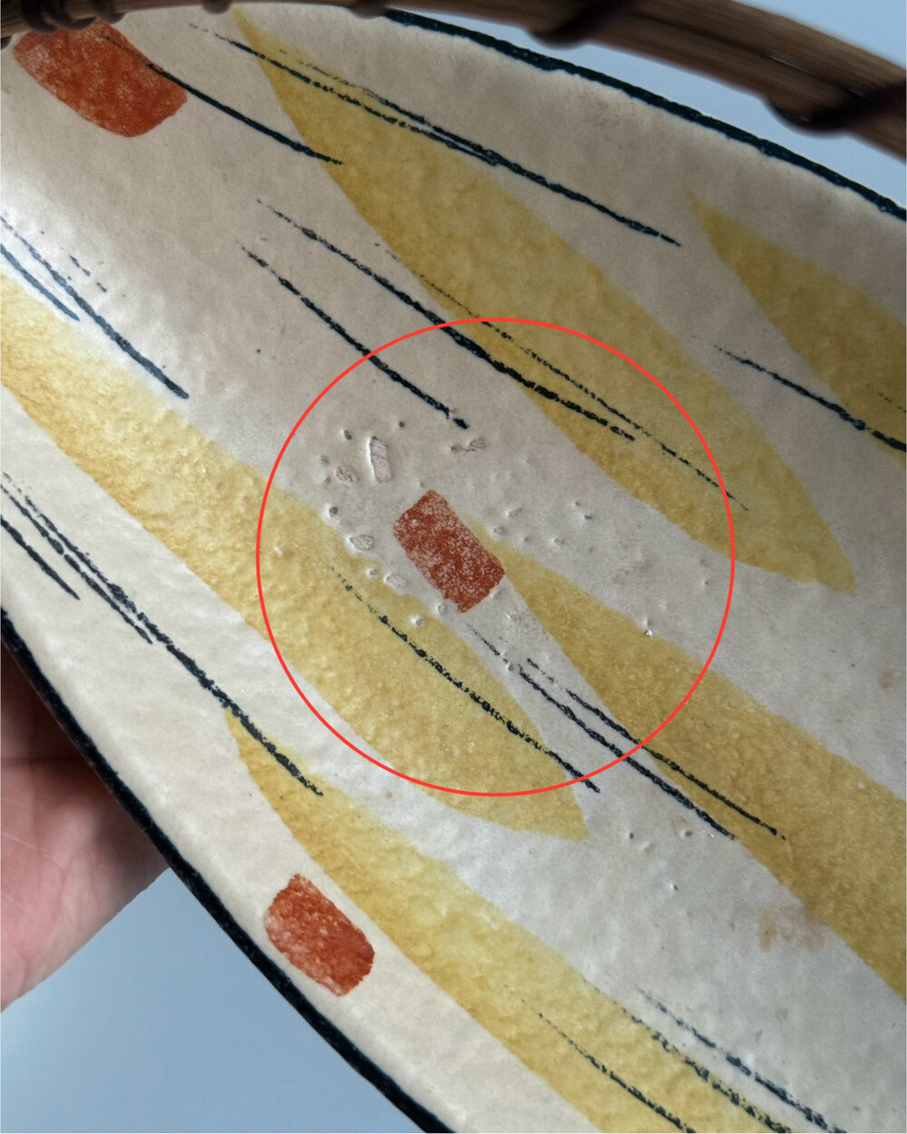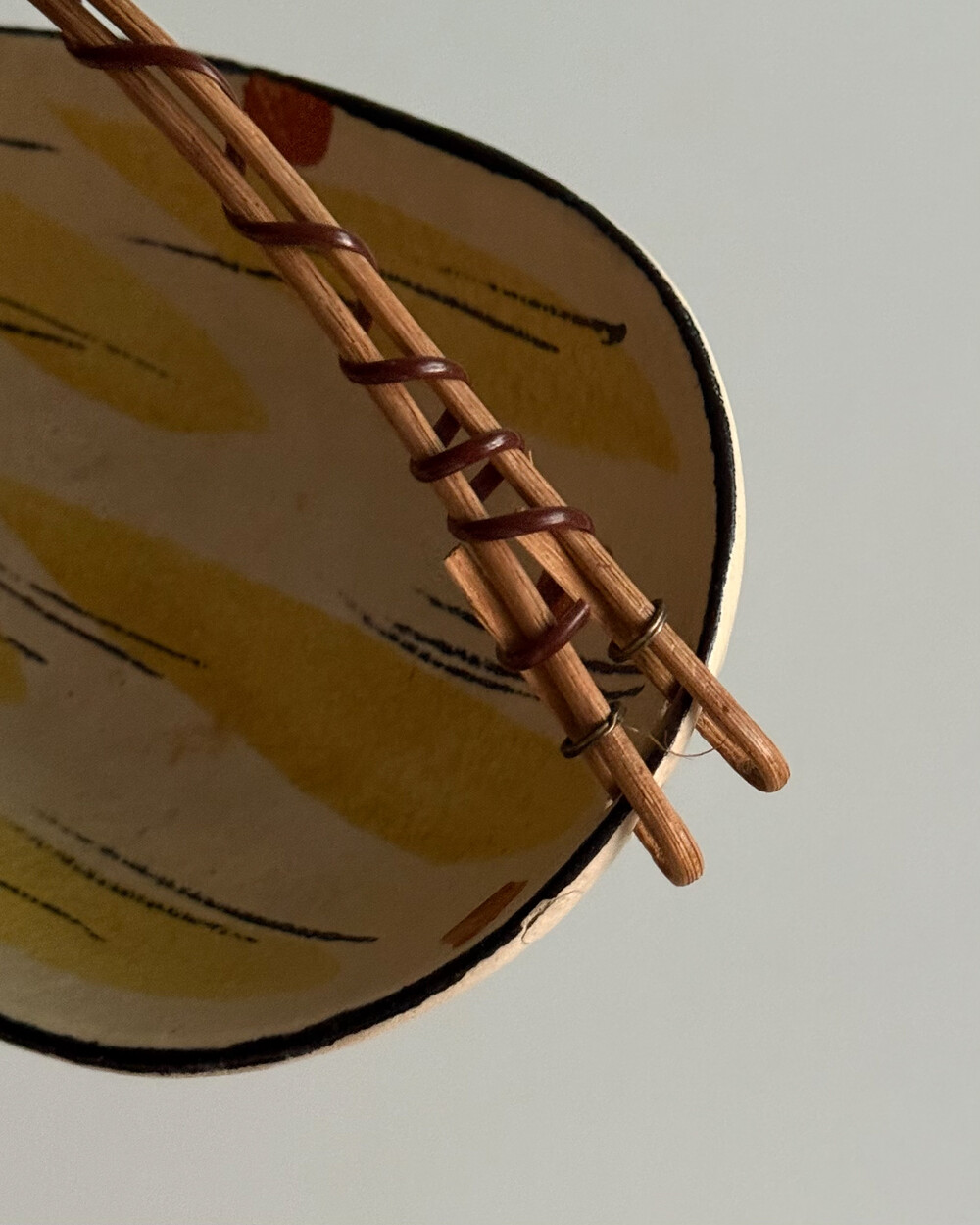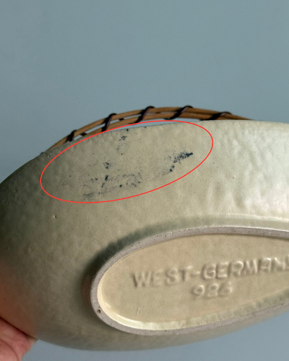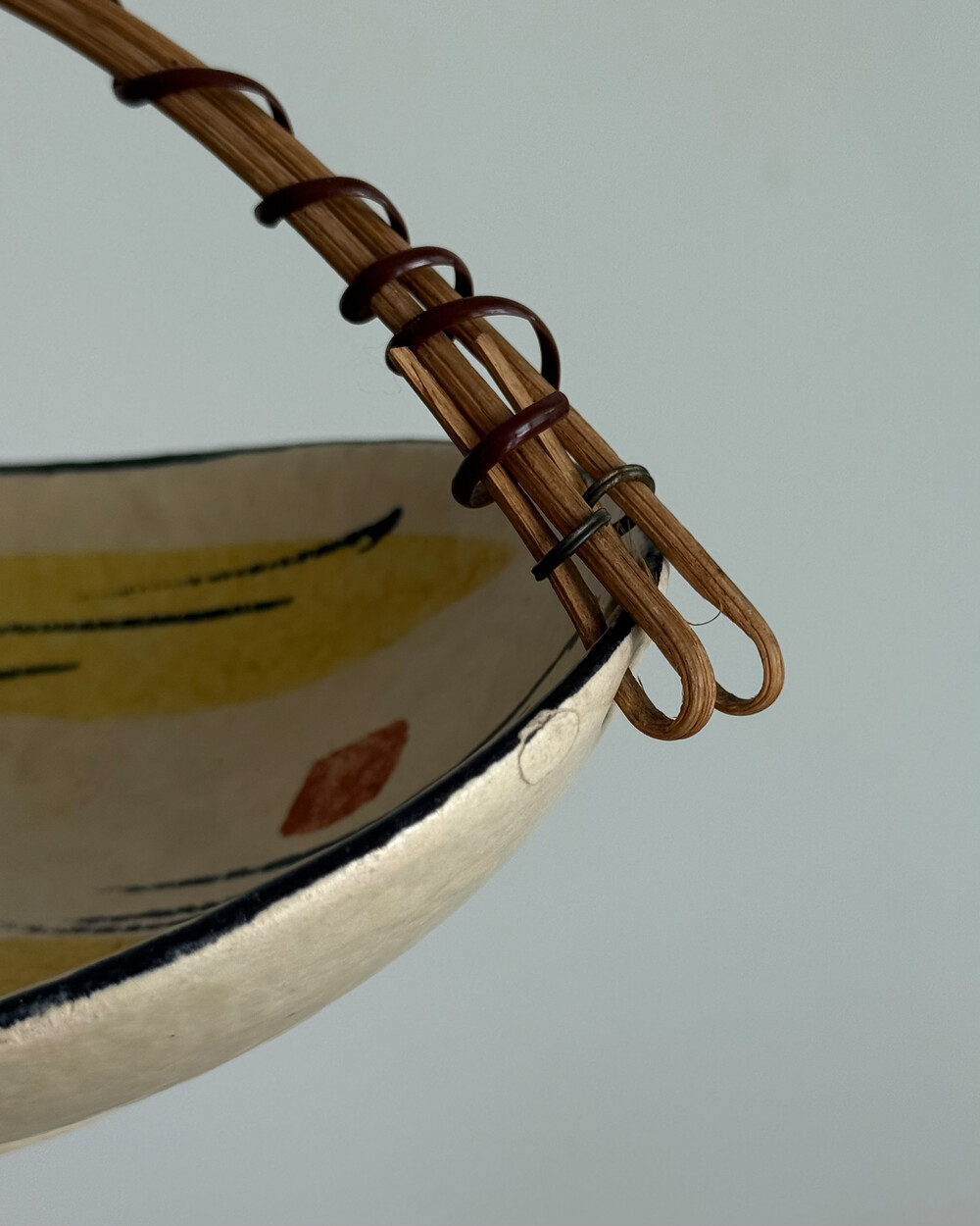 1960년대에 서독 제작된 세라믹 볼입니다. 타원형 바디와 라탄 손잡이로 이루어져 있으며, 고급스러운 매트마감 위로 핸드페인팅 라인 패턴이 매력적인 디자인입니다. 과일 바스켓, 소품 보관 트레이 등 다양하게 활용하실 수 있습니다.