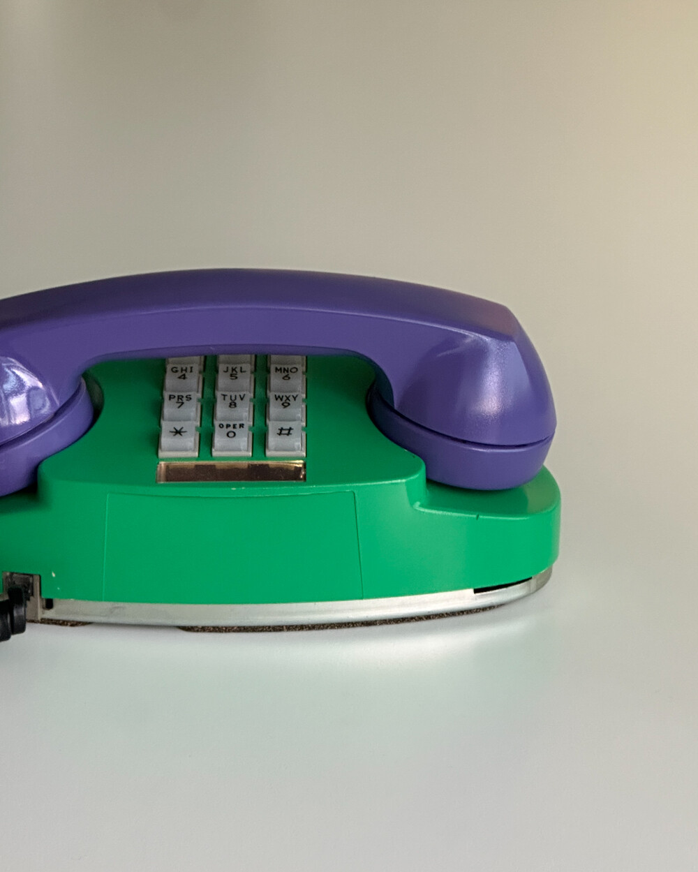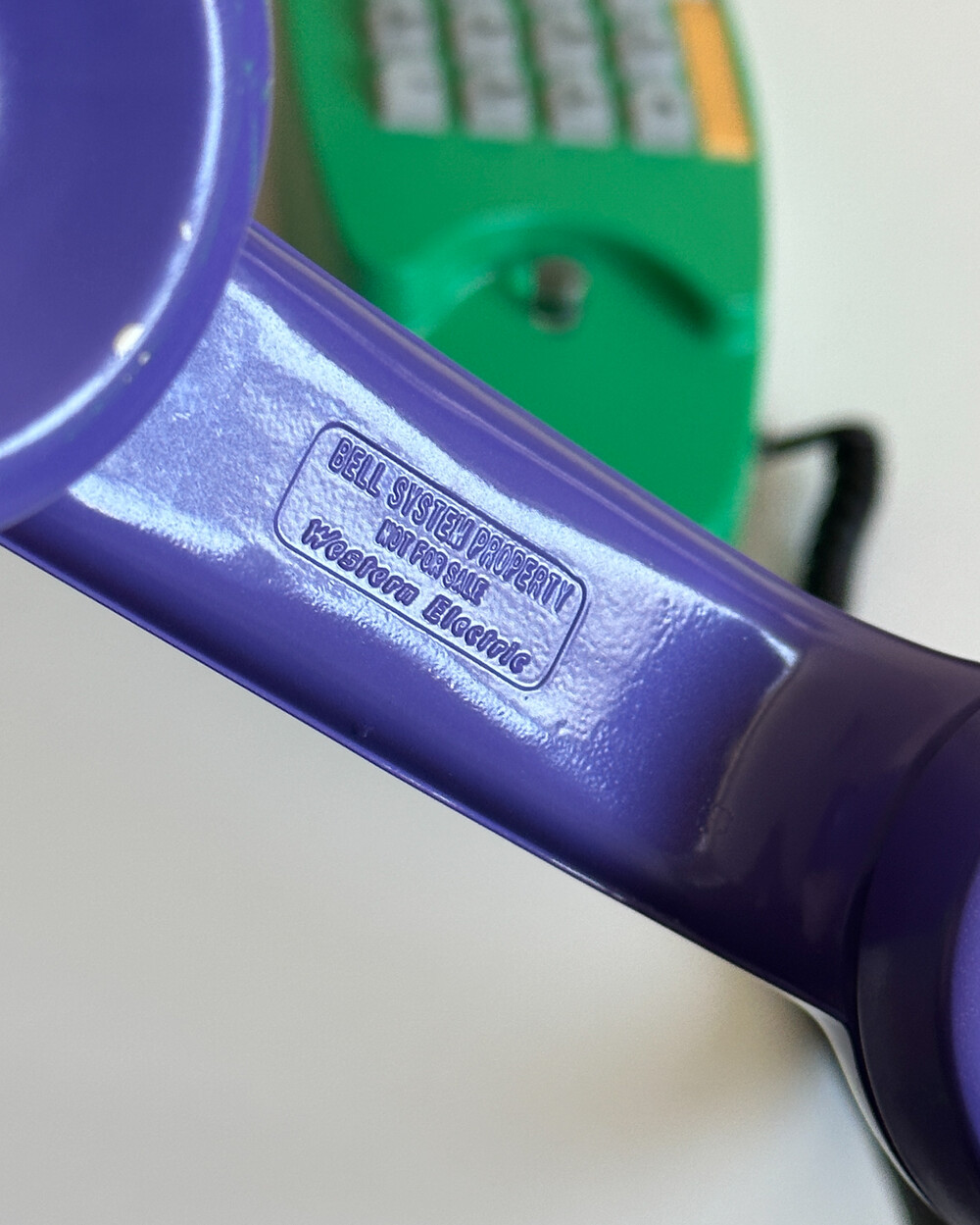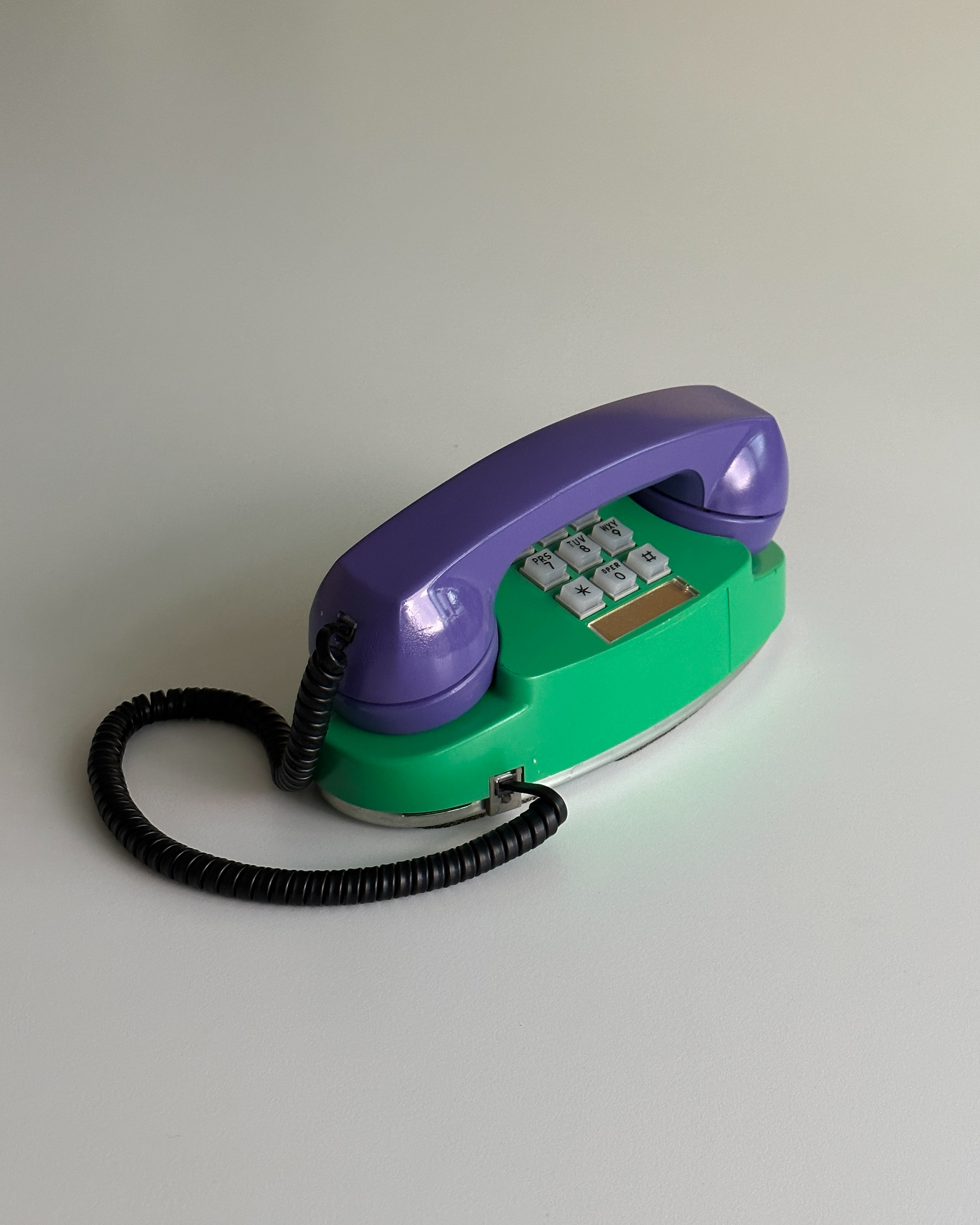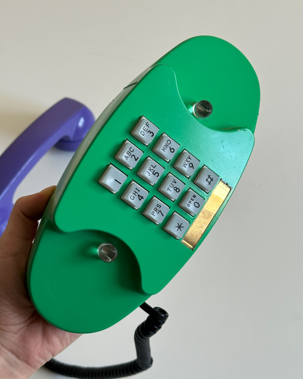 80년도 미국 WESTERN ELECTRIC에서 생산된 유선 전화기 Princess 2702 입니다. WESTERN ELECTRIC은 AT&T의 자회사로, 20세기 동안 미국 전역의 통신장비를 독점하여 보급했던 회사입니다. 높은 내구성과 품질로 오늘날까지 수집가들에게 좋은 평가를 받고 있습니다. 그린과 퍼플의 컬러 조화가 매력적인 디자인으로 인테리어 소품은 물론 실사용이 가능한 제품입니다.