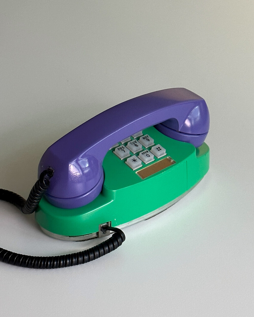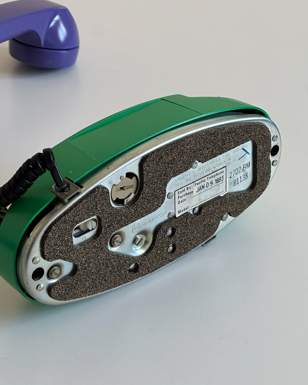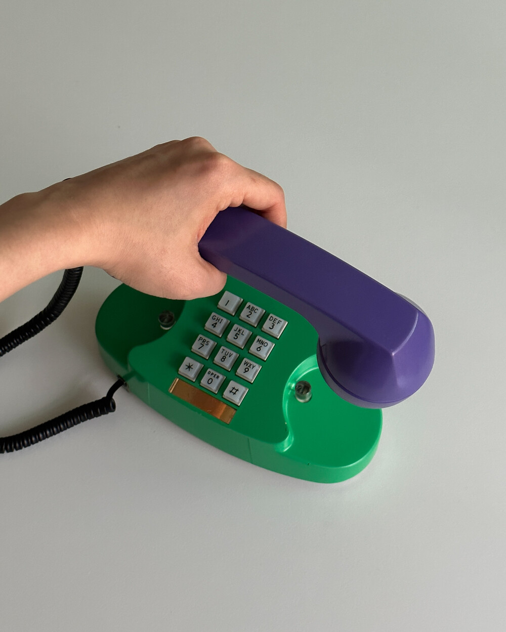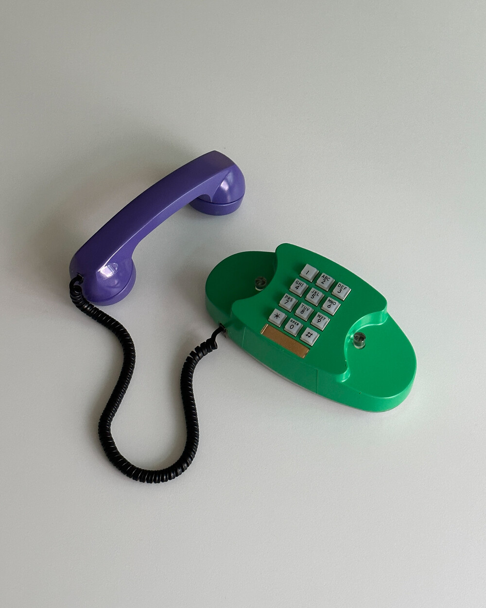 80년도 미국 WESTERN ELECTRIC에서 생산된 유선 전화기 Princess 2702 입니다. WESTERN ELECTRIC은 AT&T의 자회사로, 20세기 동안 미국 전역의 통신장비를 독점하여 보급했던 회사입니다. 높은 내구성과 품질로 오늘날까지 수집가들에게 좋은 평가를 받고 있습니다. 그린과 퍼플의 컬러 조화가 매력적인 디자인으로 인테리어 소품은 물론 실사용이 가능한 제품입니다.