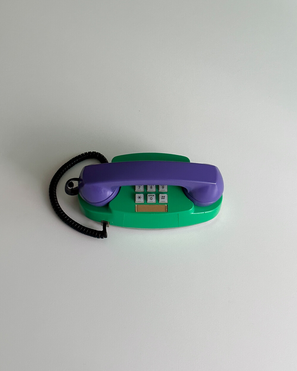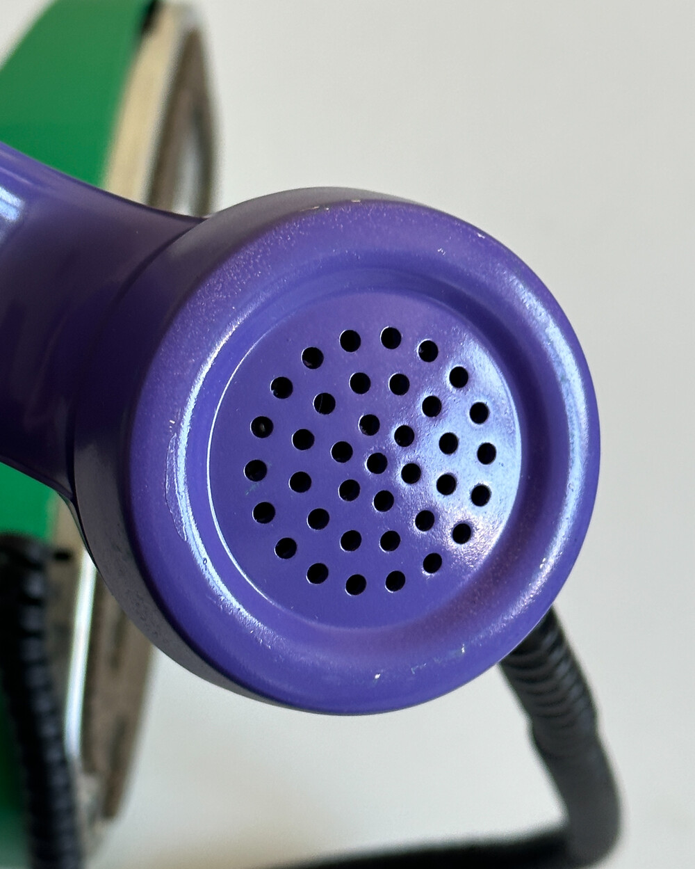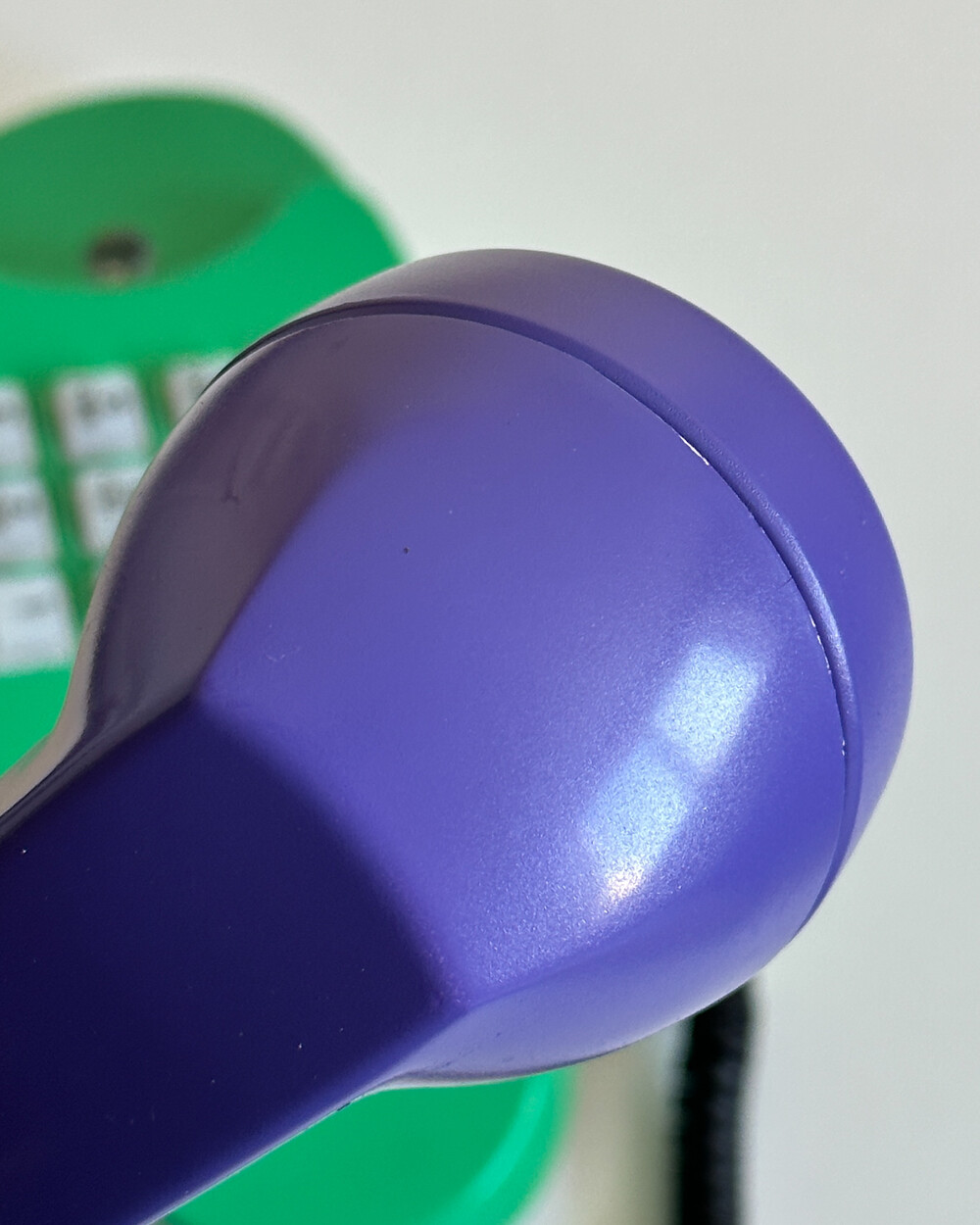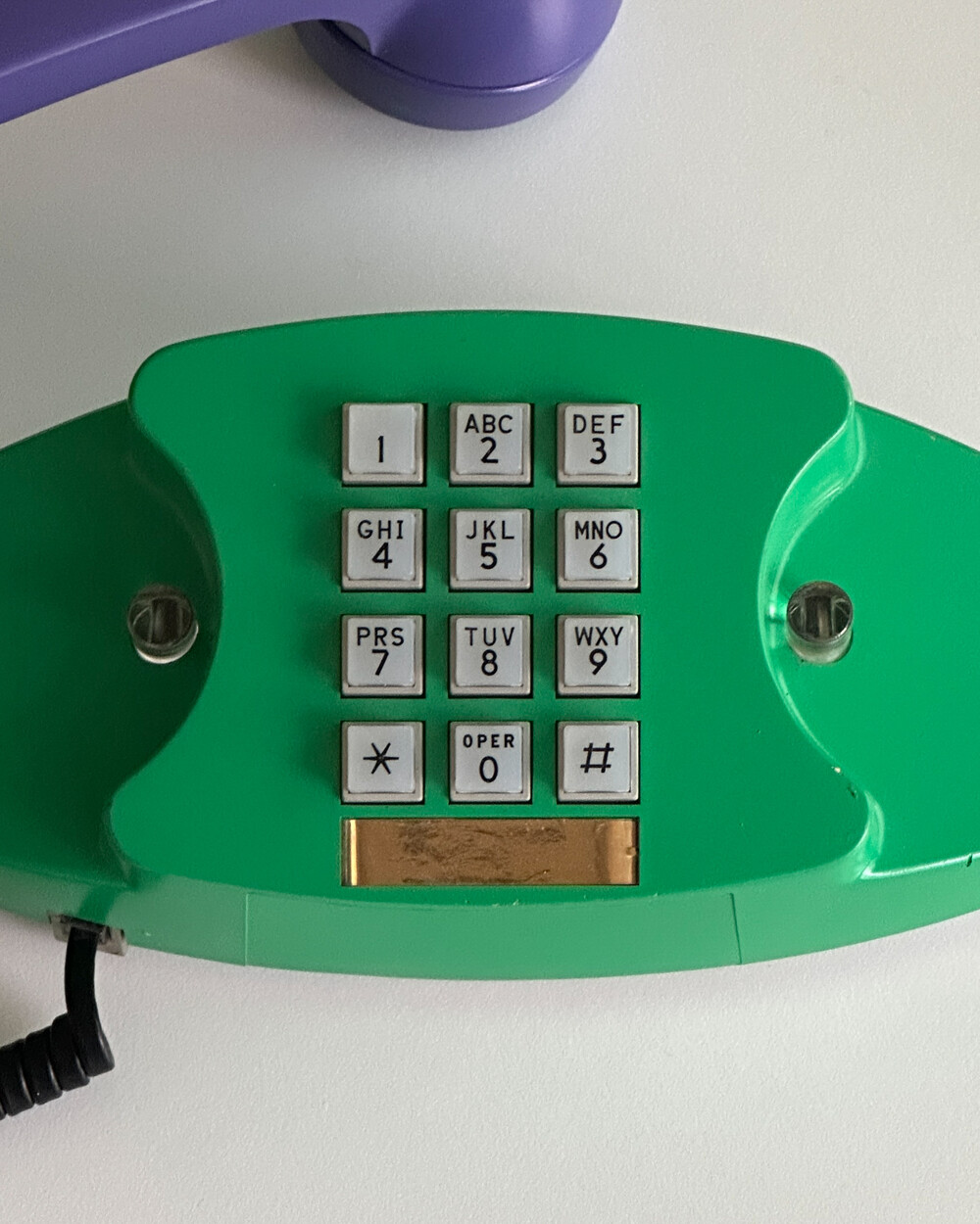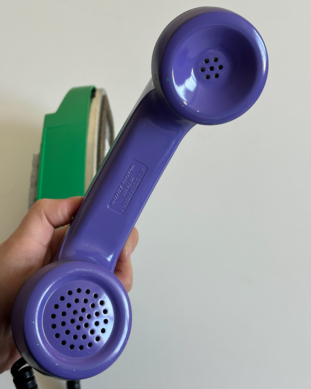 80년도 미국 WESTERN ELECTRIC에서 생산된 유선 전화기 Princess 2702 입니다. WESTERN ELECTRIC은 AT&T의 자회사로, 20세기 동안 미국 전역의 통신장비를 독점하여 보급했던 회사입니다. 높은 내구성과 품질로 오늘날까지 수집가들에게 좋은 평가를 받고 있습니다. 그린과 퍼플의 컬러 조화가 매력적인 디자인으로 인테리어 소품은 물론 실사용이 가능한 제품입니다.