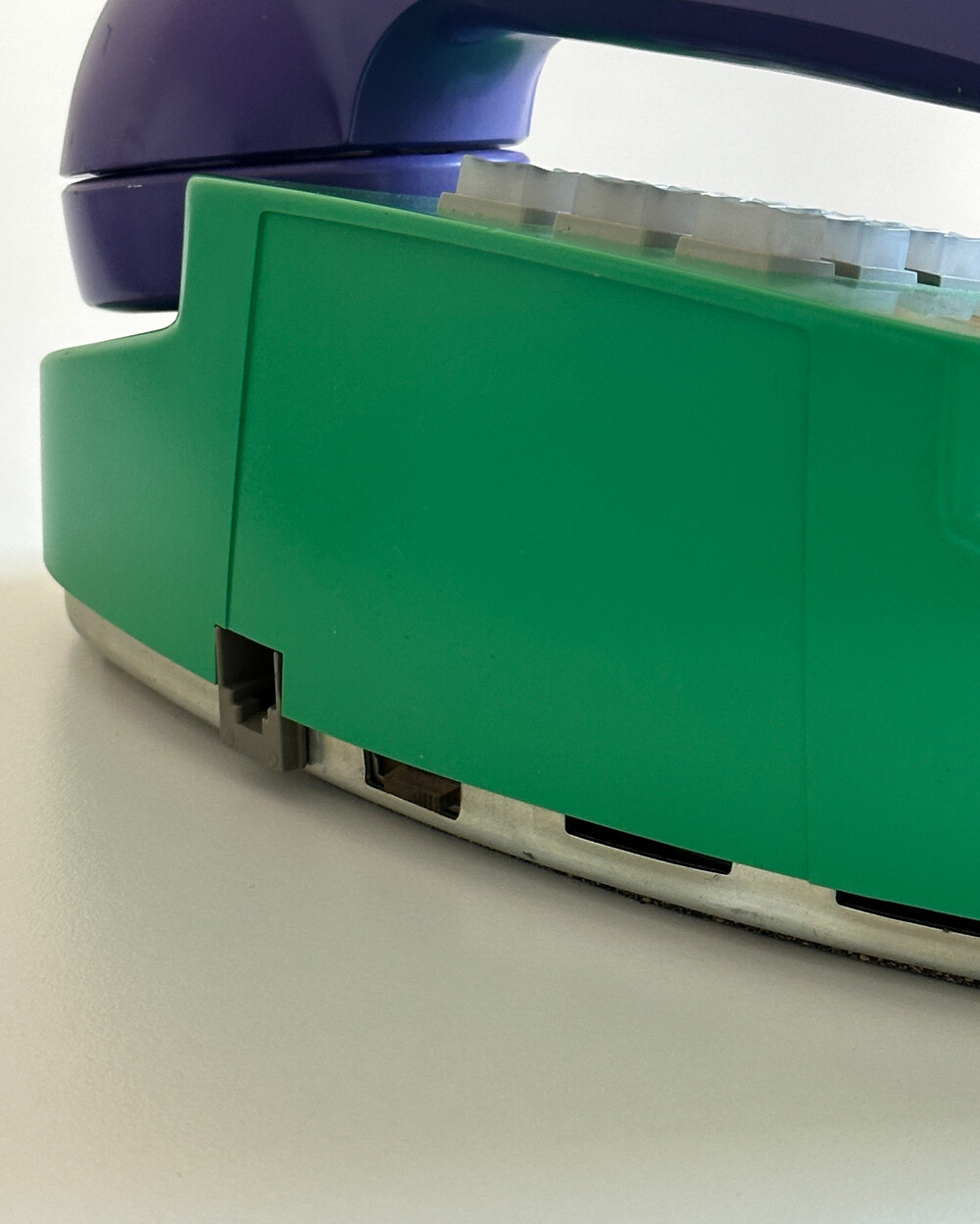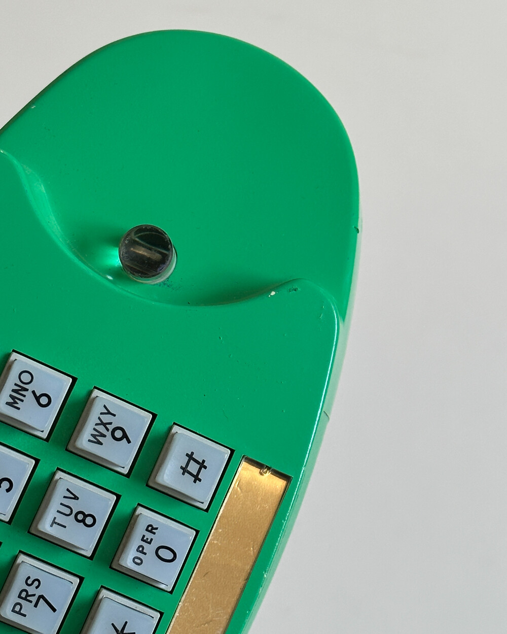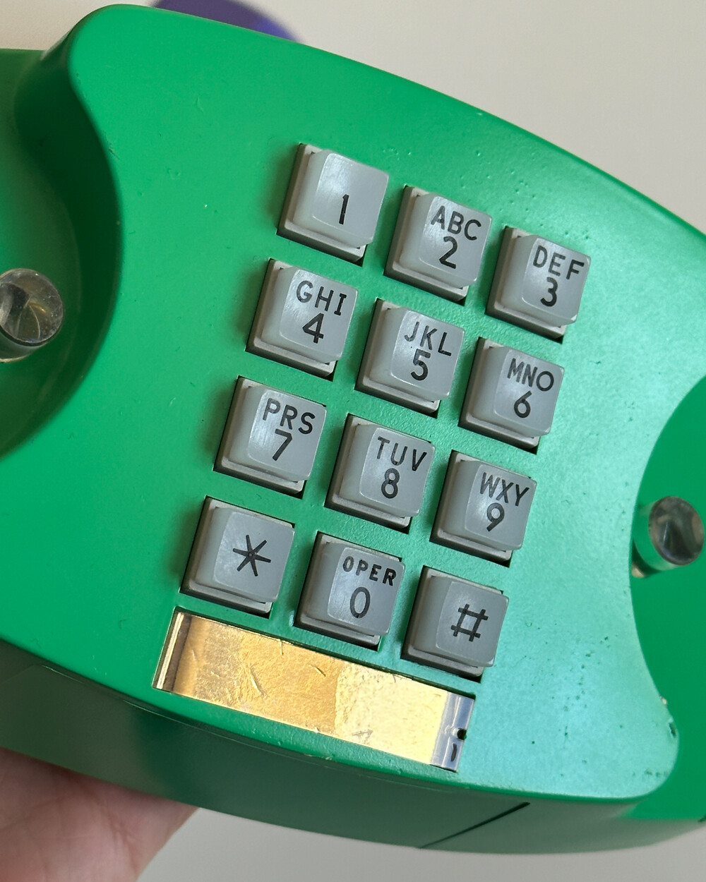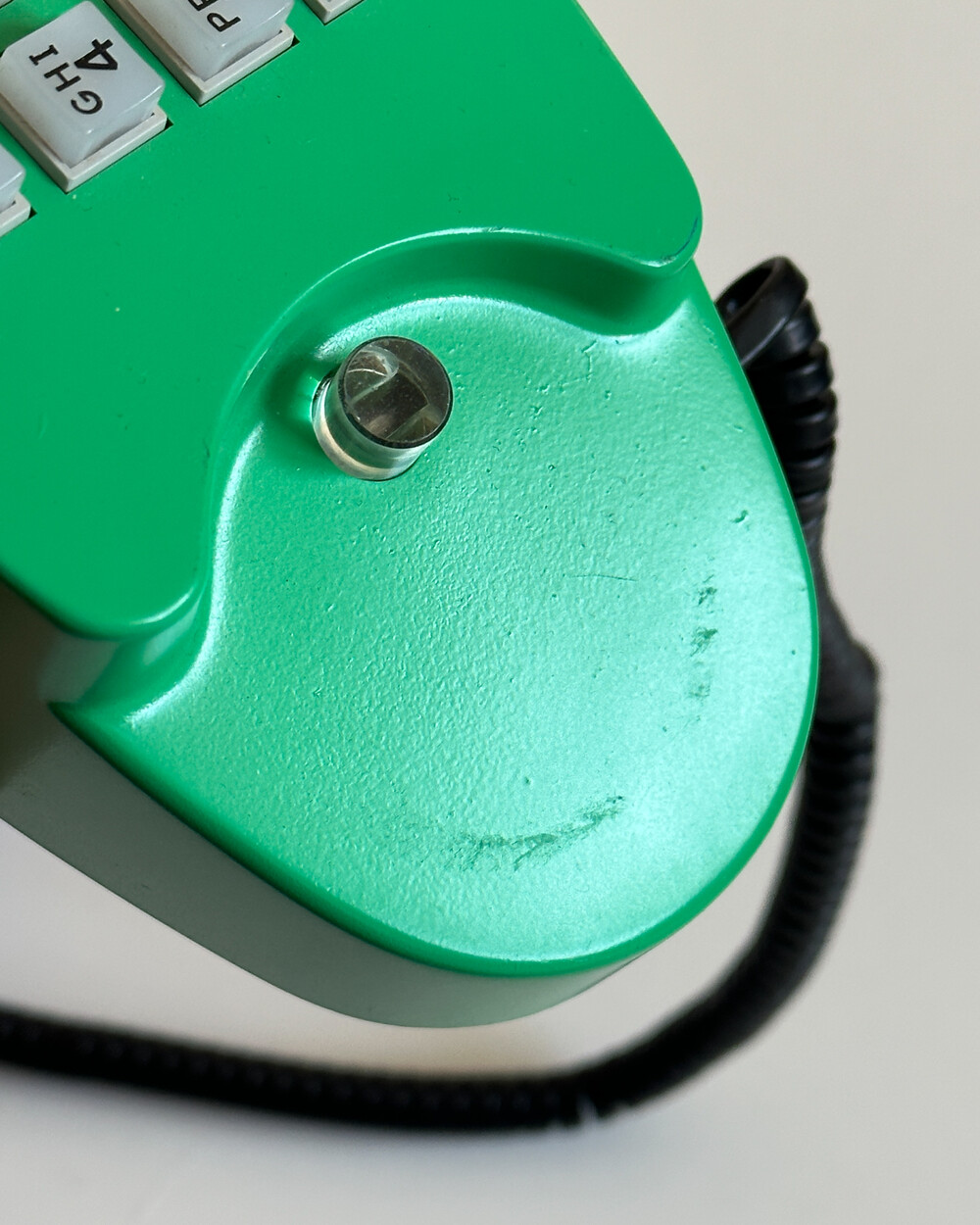 80년도 미국 WESTERN ELECTRIC에서 생산된 유선 전화기 Princess 2702 입니다. WESTERN ELECTRIC은 AT&T의 자회사로, 20세기 동안 미국 전역의 통신장비를 독점하여 보급했던 회사입니다. 높은 내구성과 품질로 오늘날까지 수집가들에게 좋은 평가를 받고 있습니다. 그린과 퍼플의 컬러 조화가 매력적인 디자인으로 인테리어 소품은 물론 실사용이 가능한 제품입니다.