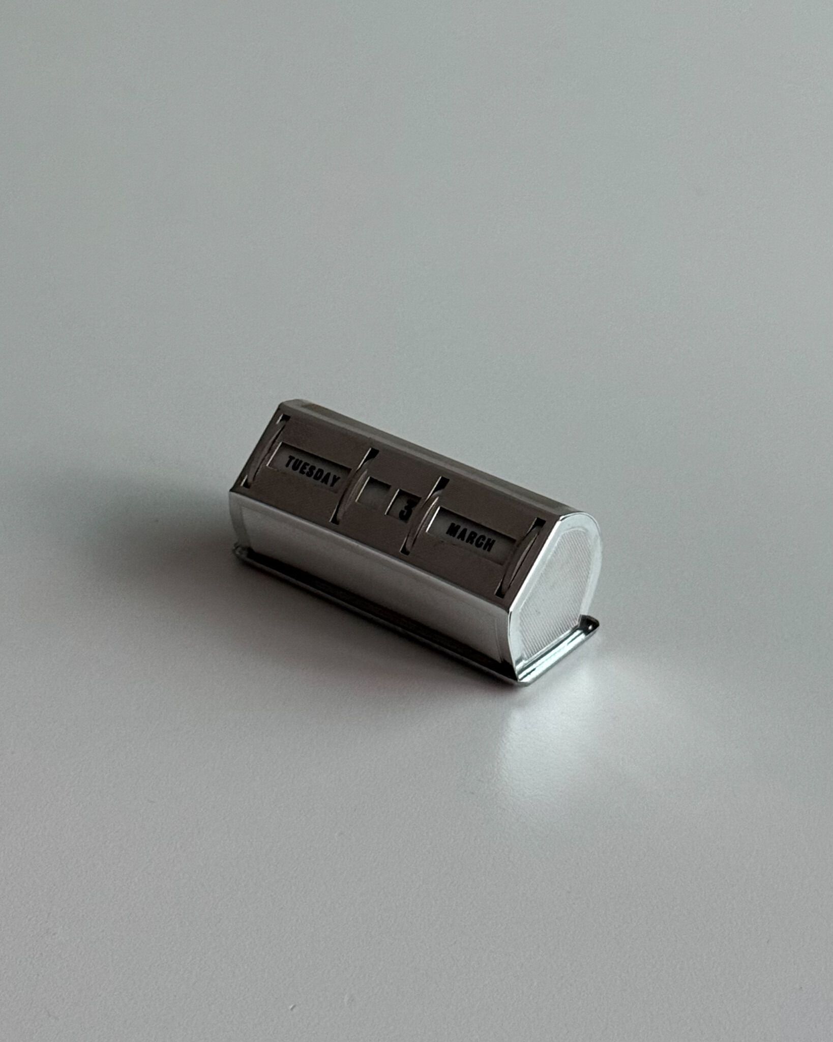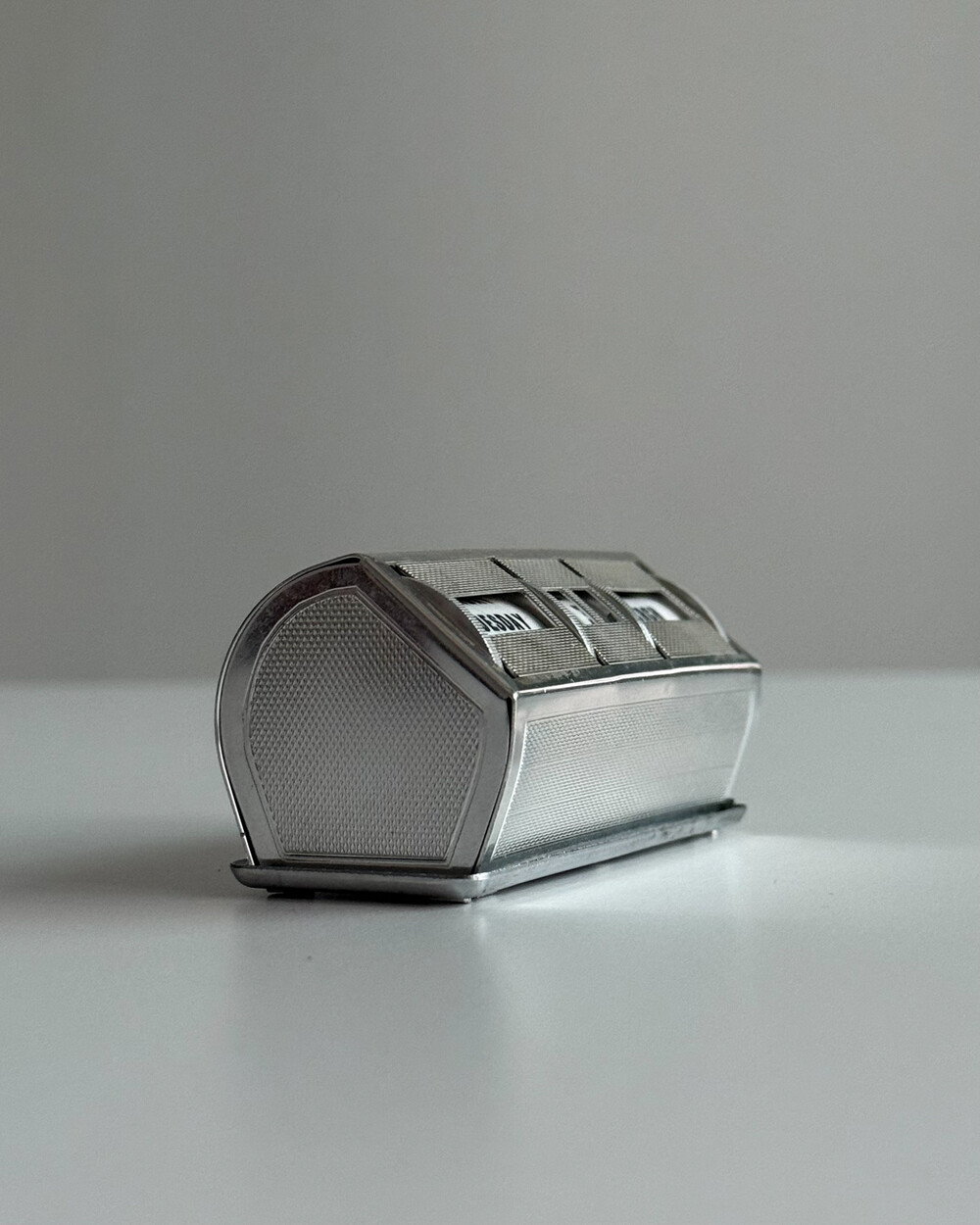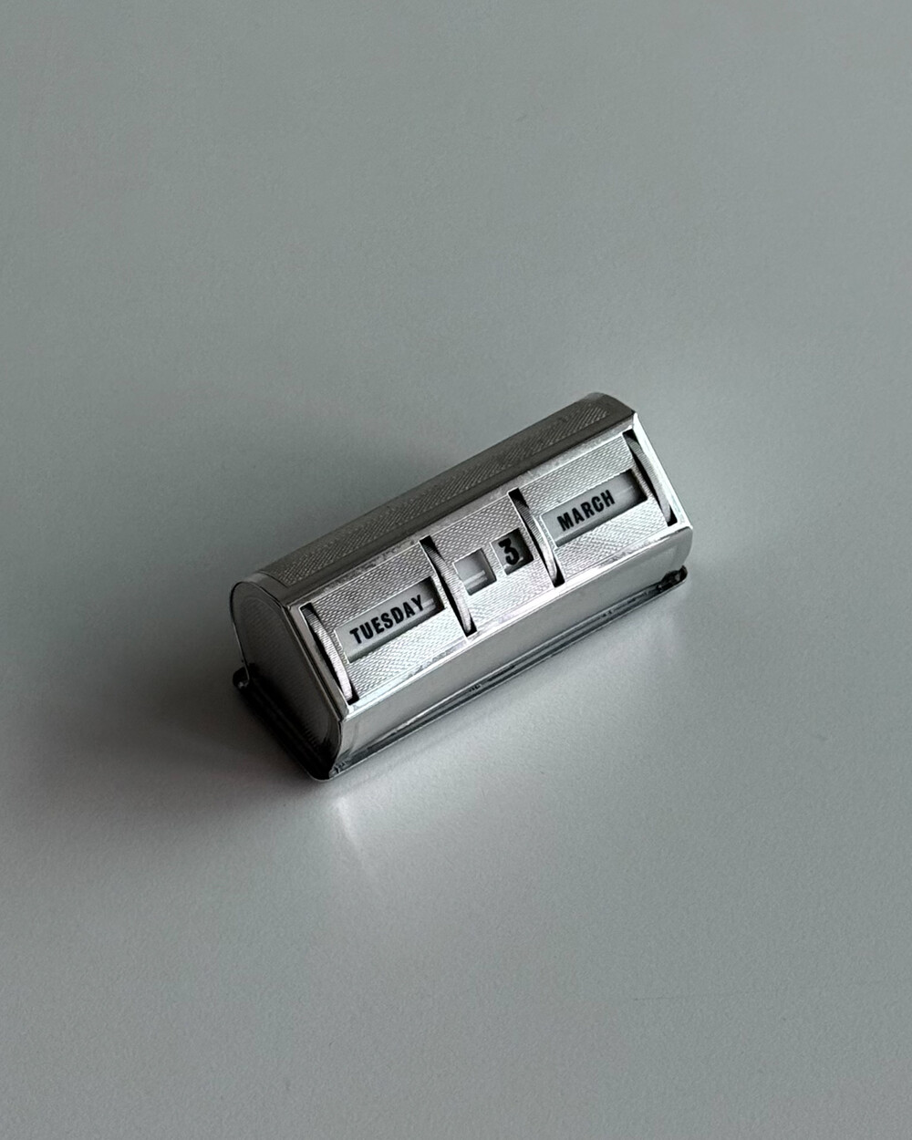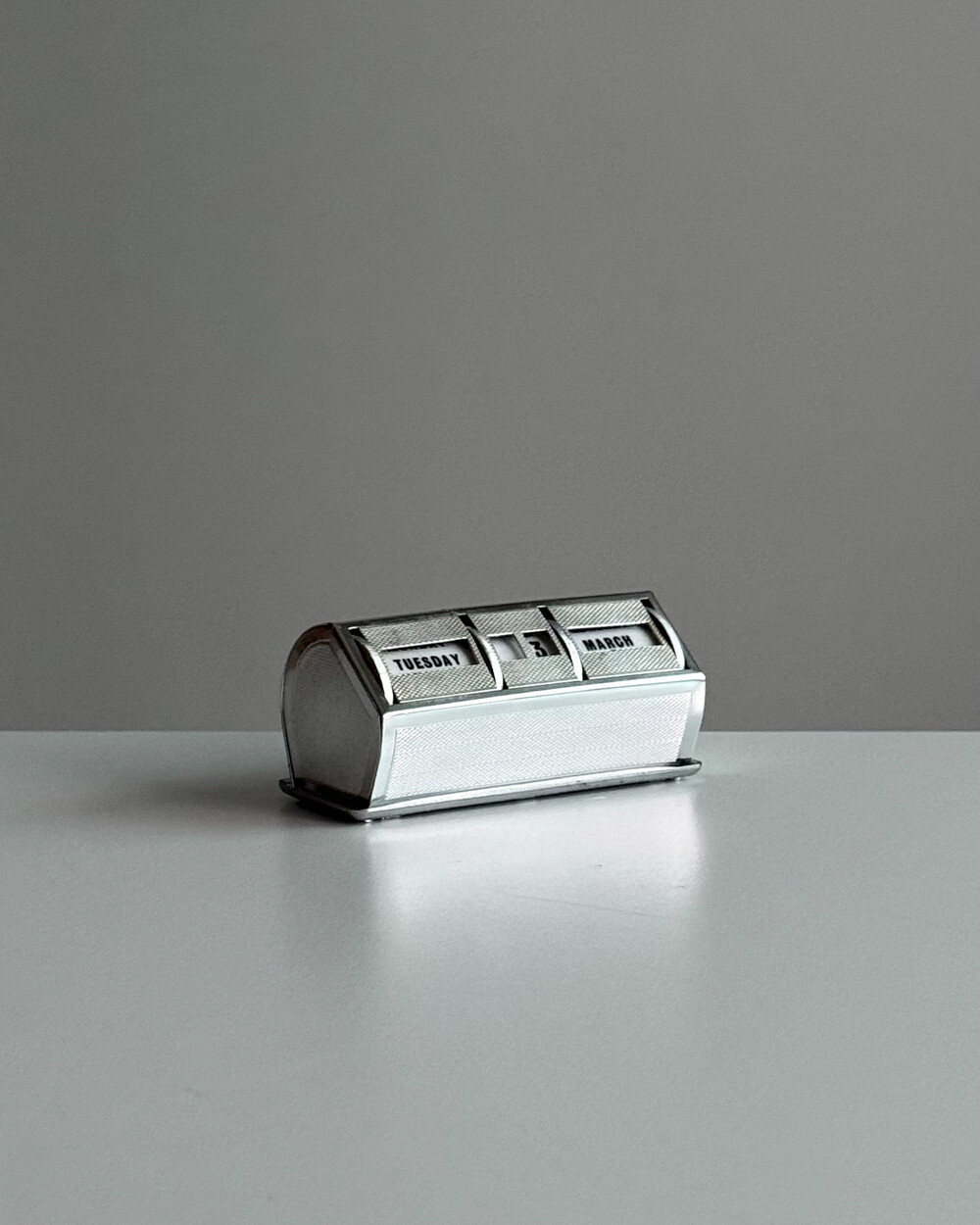 1970년대 영국에서 생산되었던 빈티지 퍼페추얼 데스크 캘린더 입니다. 배터리 없이 수동으로 넘겨가며 사용하는 만년 캘린더로, 요일/일/월로 구분된 4개의 다이얼을 돌려 설정하는 형태입니다. 고급스럽고 묵직한 크롬 메탈 소재로 이루어져 있습니다.