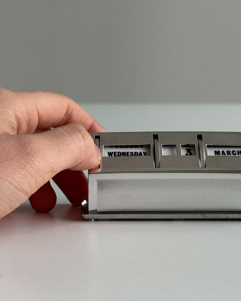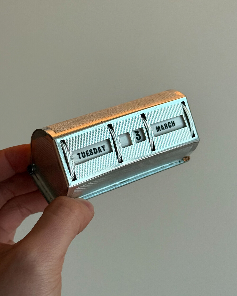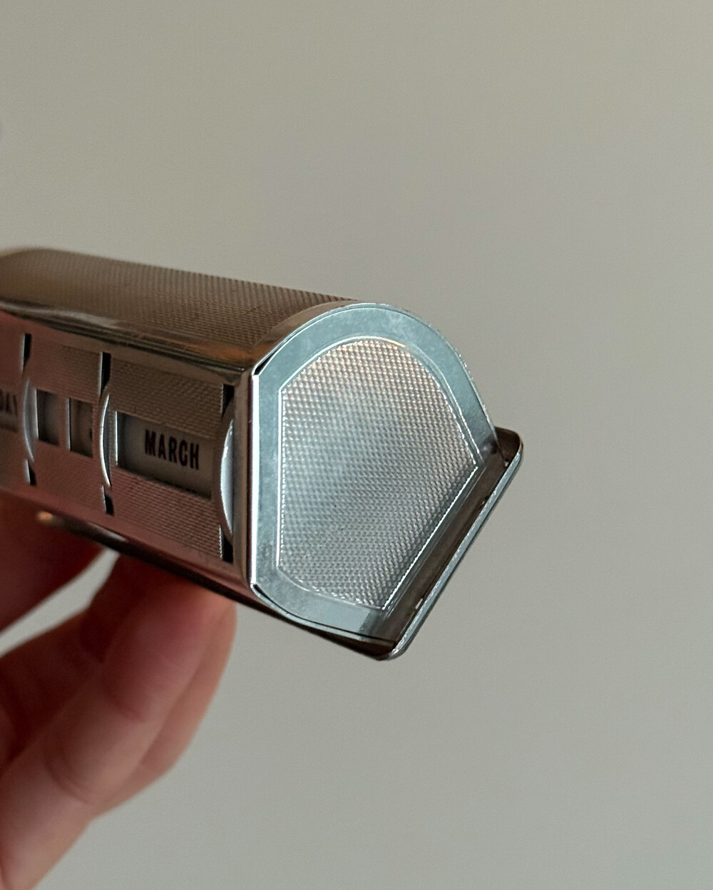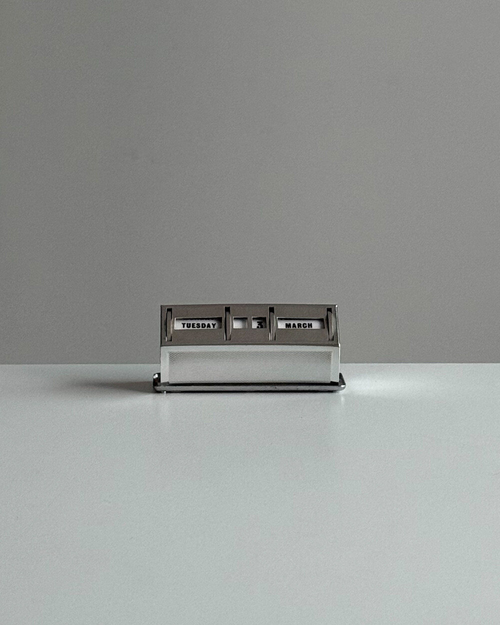 1970년대 영국에서 생산되었던 빈티지 퍼페추얼 데스크 캘린더 입니다. 배터리 없이 수동으로 넘겨가며 사용하는 만년 캘린더로, 요일/일/월로 구분된 4개의 다이얼을 돌려 설정하는 형태입니다. 고급스럽고 묵직한 크롬 메탈 소재로 이루어져 있습니다.