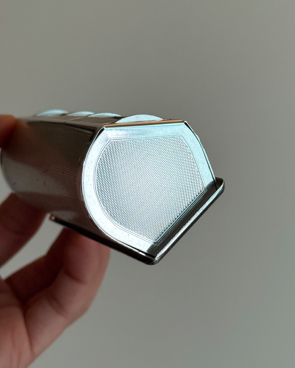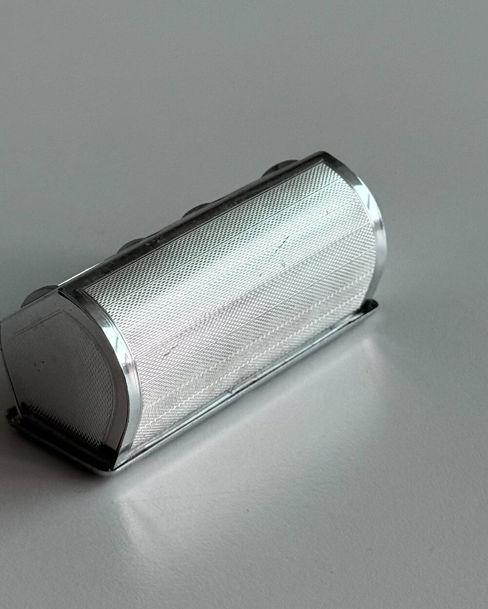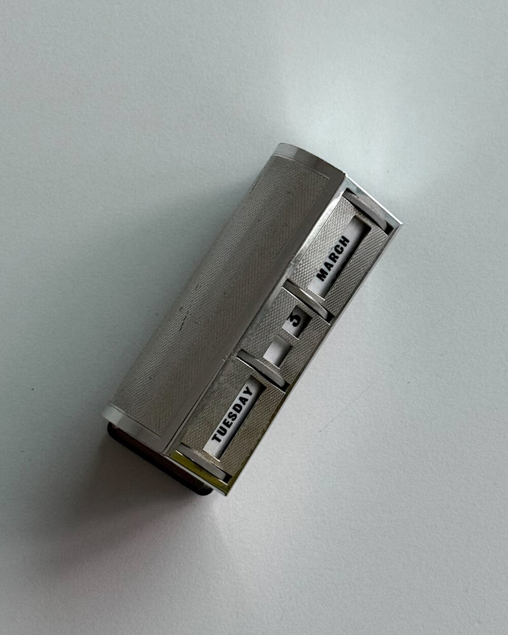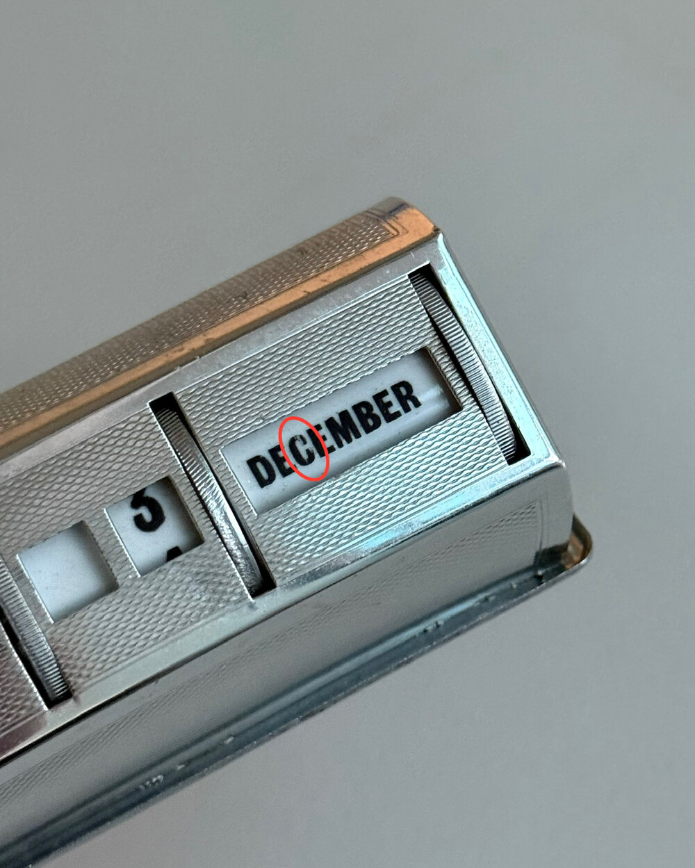 1970년대 영국에서 생산되었던 빈티지 퍼페추얼 데스크 캘린더 입니다. 배터리 없이 수동으로 넘겨가며 사용하는 만년 캘린더로, 요일/일/월로 구분된 4개의 다이얼을 돌려 설정하는 형태입니다. 고급스럽고 묵직한 크롬 메탈 소재로 이루어져 있습니다.