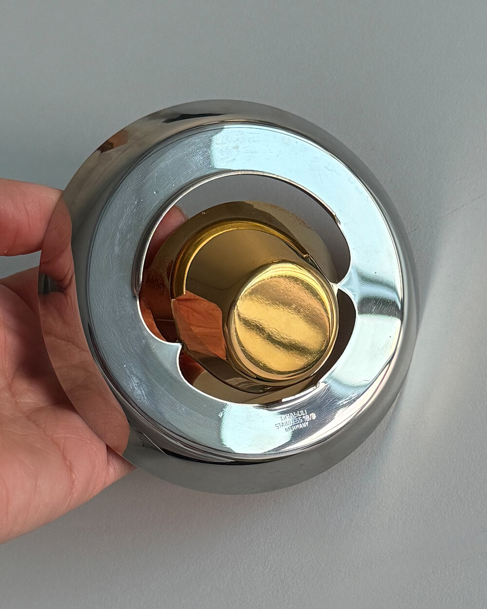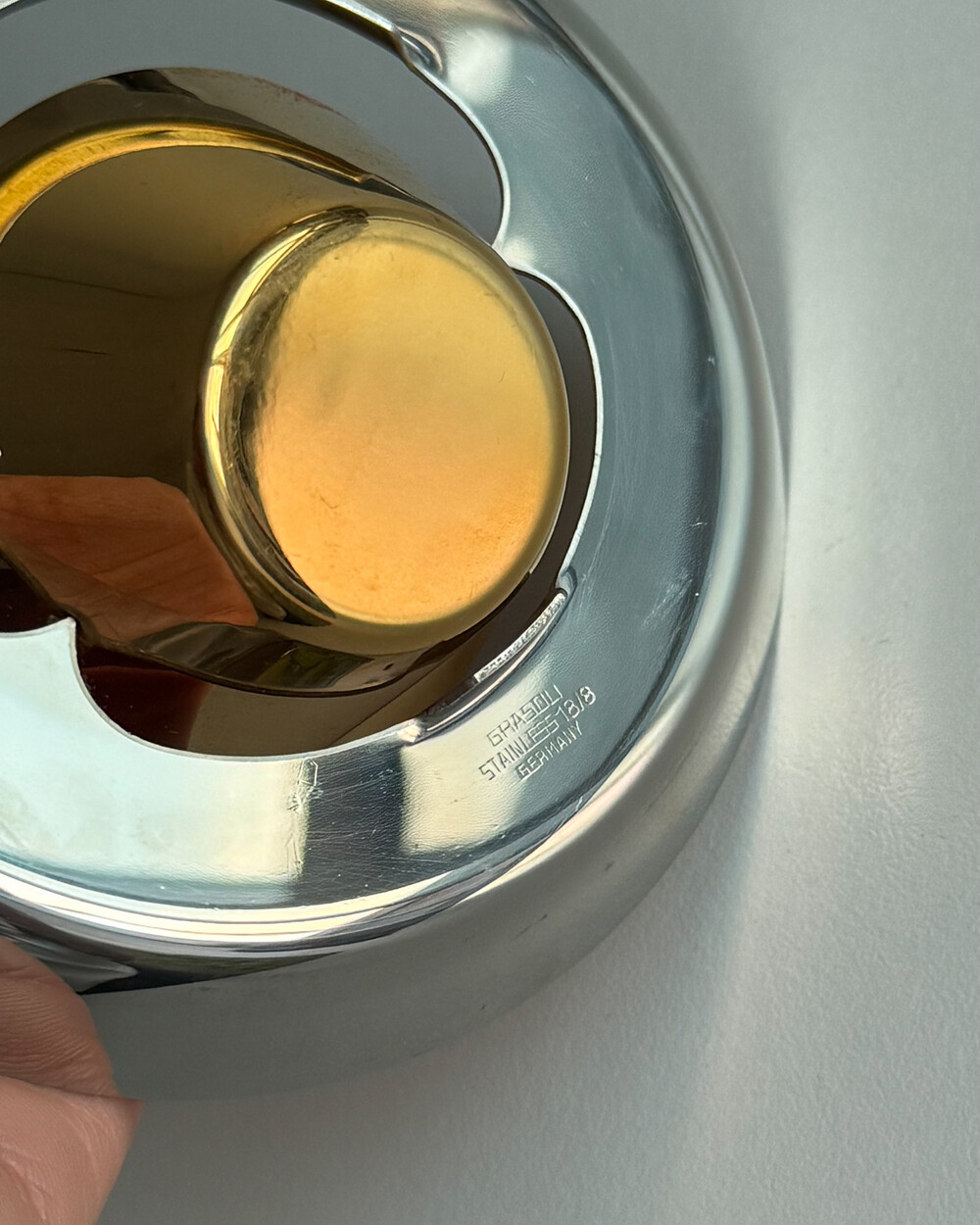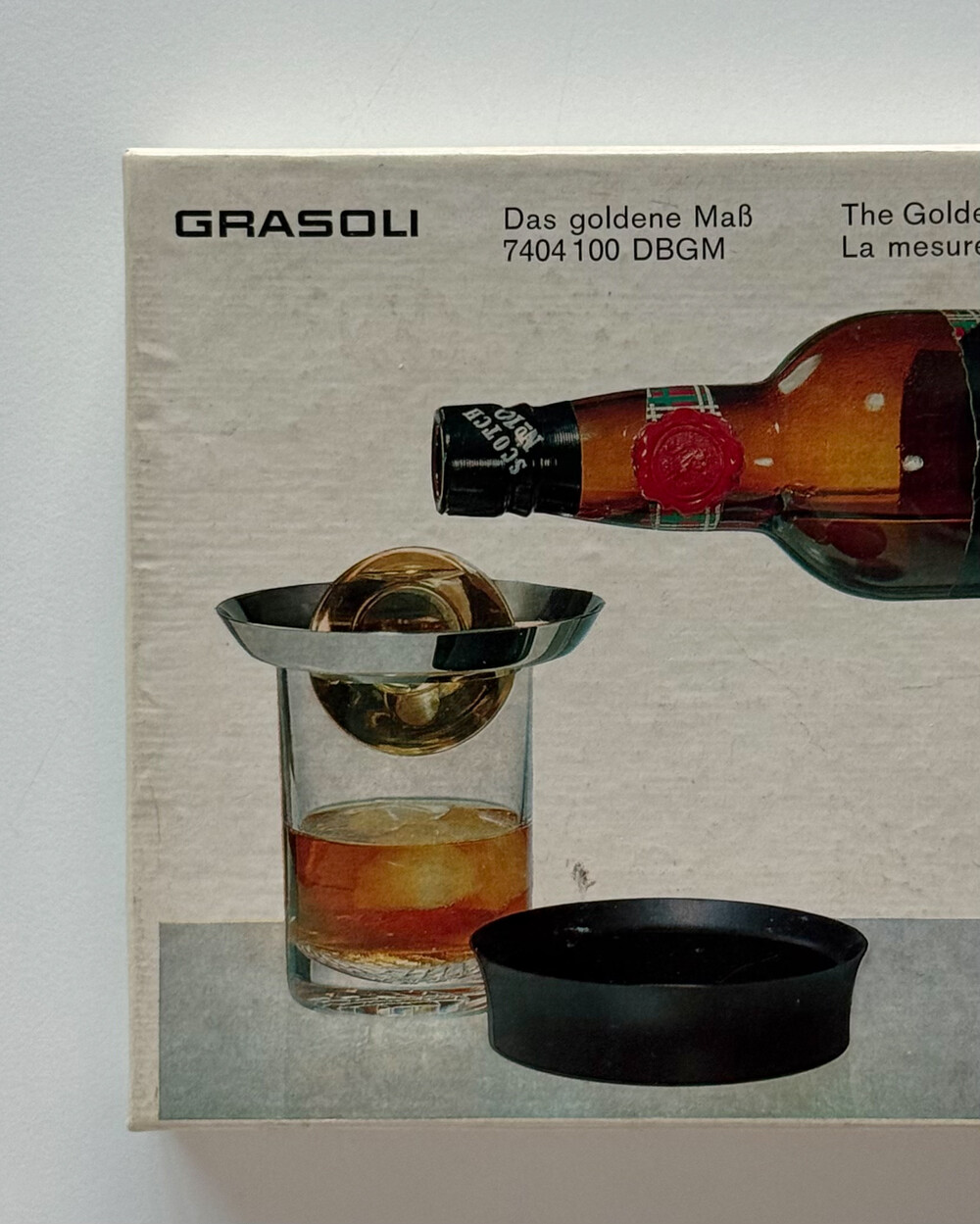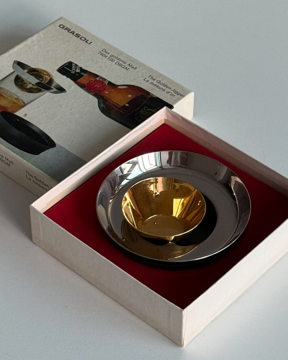 1970년대 독일 GRASOLI 사에서 생산된 위스키 및 칵테일 계량 바웨어입니다. 잔 위에 올려 사용하는 구조로, 가운데 계량컵에 술을 따르면 정해진 양이 차는 순간 컵이 기울며 자동으로 잔에 따라집니다. 별도의 계량 없이도 일정한 용량을 손쉽게 맞출 수 있습니다. 스테인리스 바디와 골드 톤의 계량컵이 대비를 이루는 깔끔한 디자인입니다.